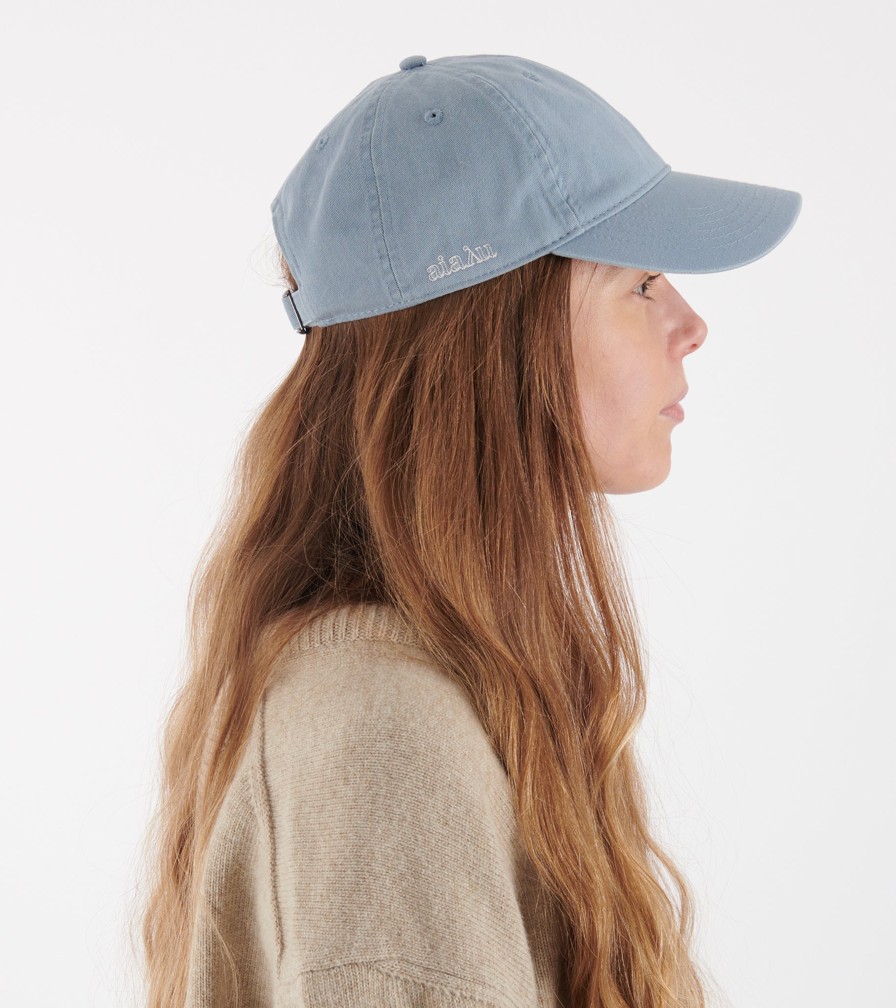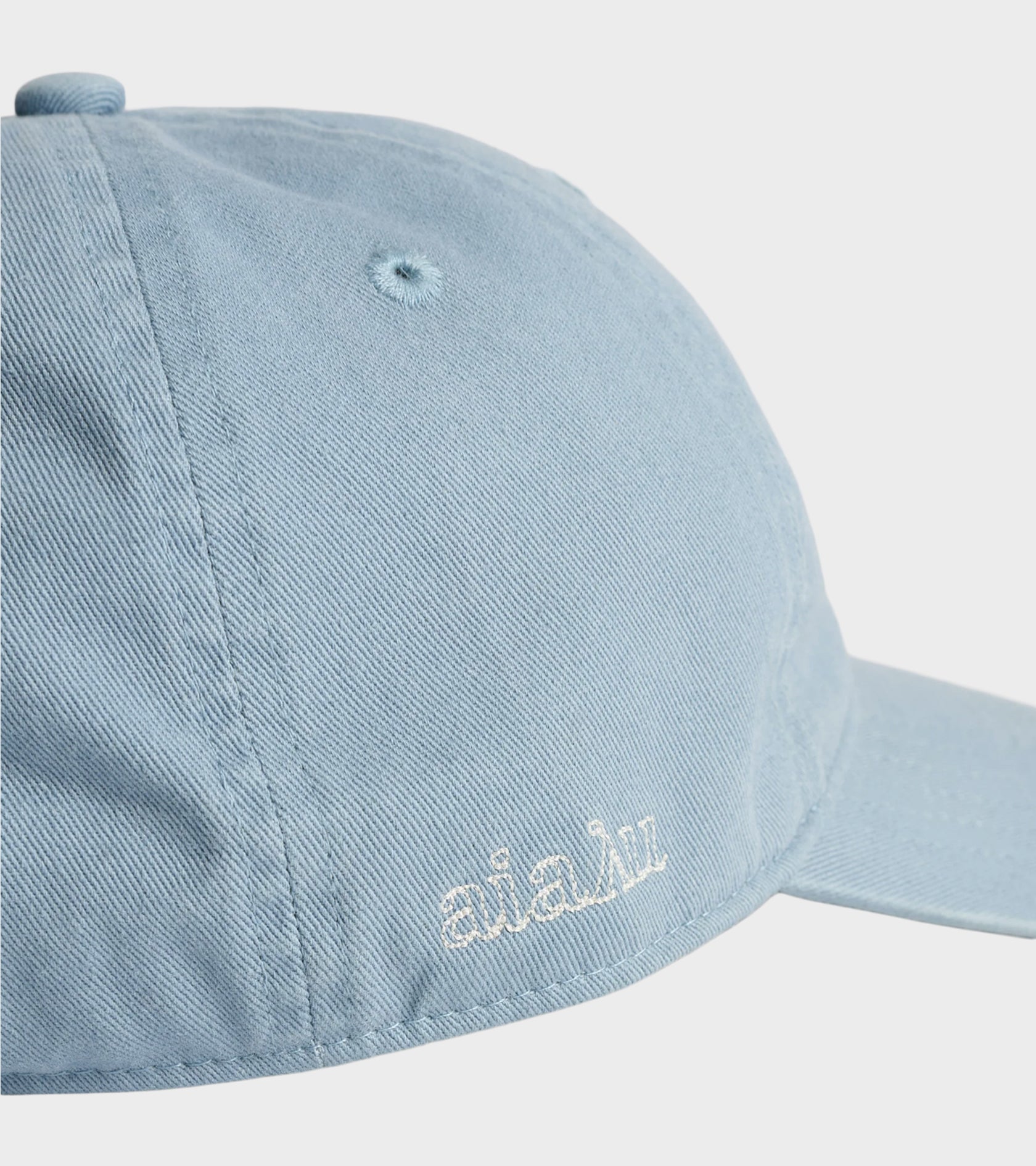 Lyseblå kasket i økologisk bomuld fra Aiayu. Denne kasket er one size og kan justeres i størrelsen. På siden er et broderet logo.