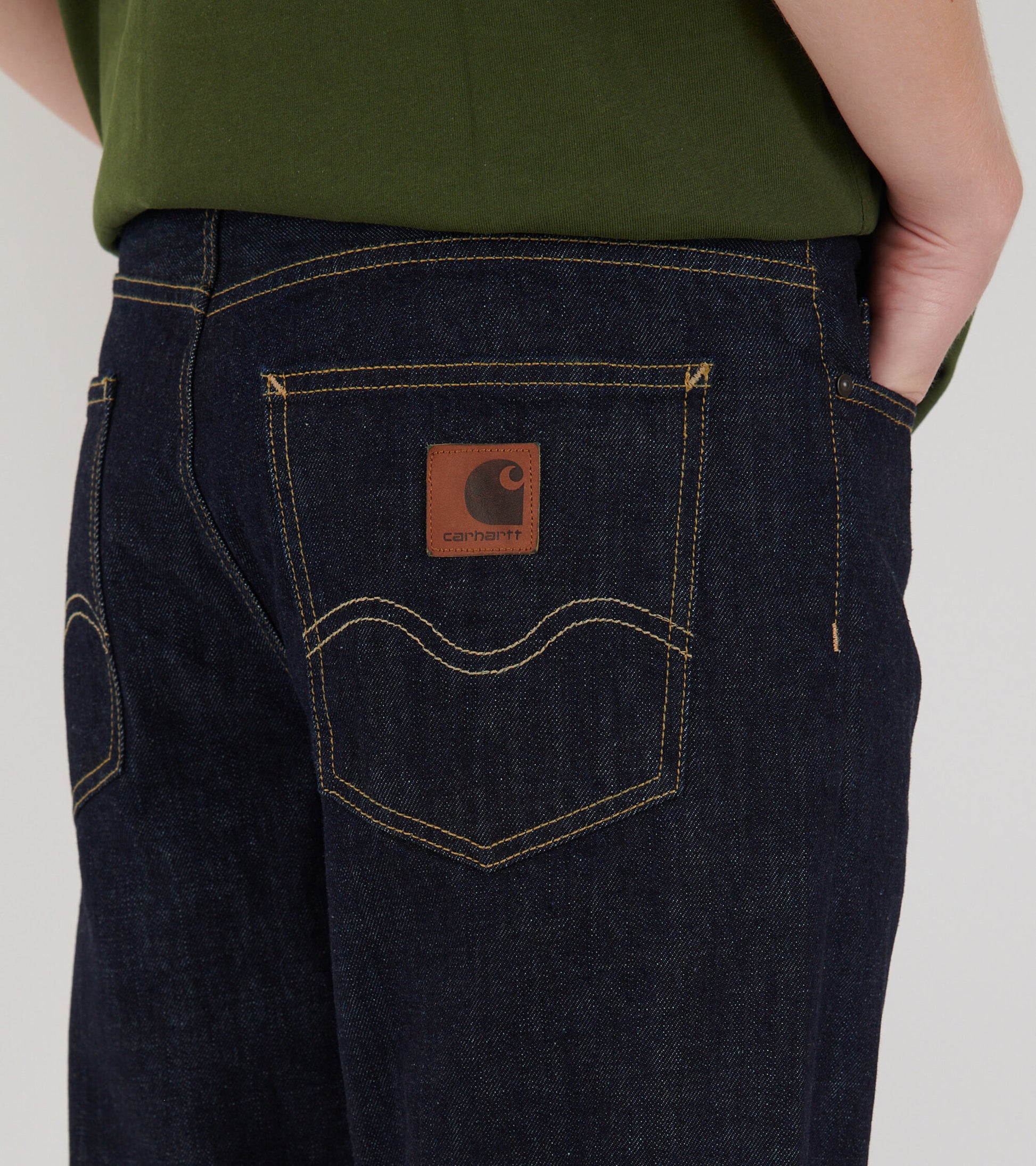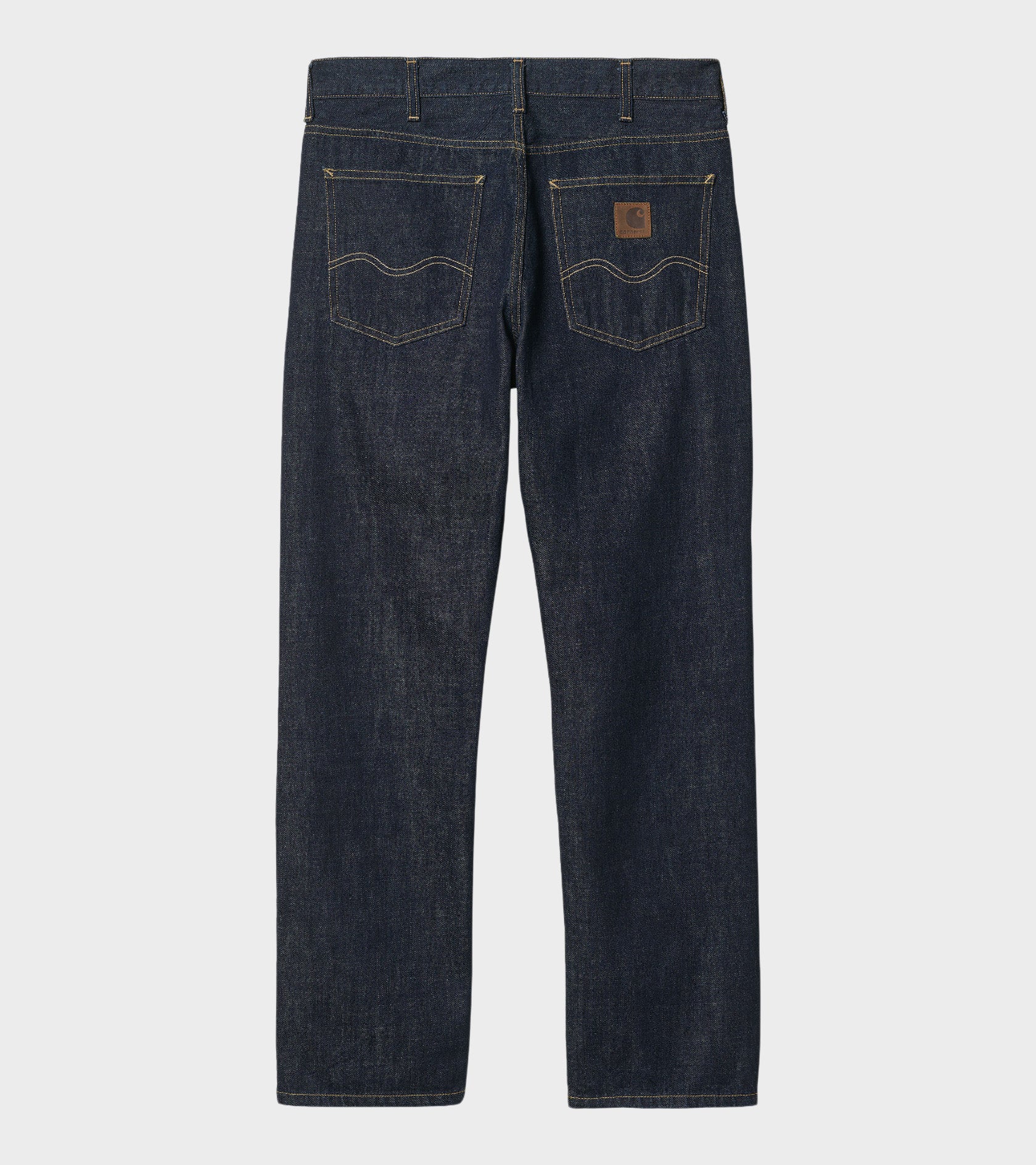 Mørkeblå jeans fra Carhartt WIP. Marlow Pant Blue Rinsed er fremstillet i 'Edgewood' bomuldsdenim og har synlige syninger, bæltestropper, tre lommer på fronten og to baglommer. På baglommerne er broderinger og på den ene er det ikoniske logo i brunt læder.