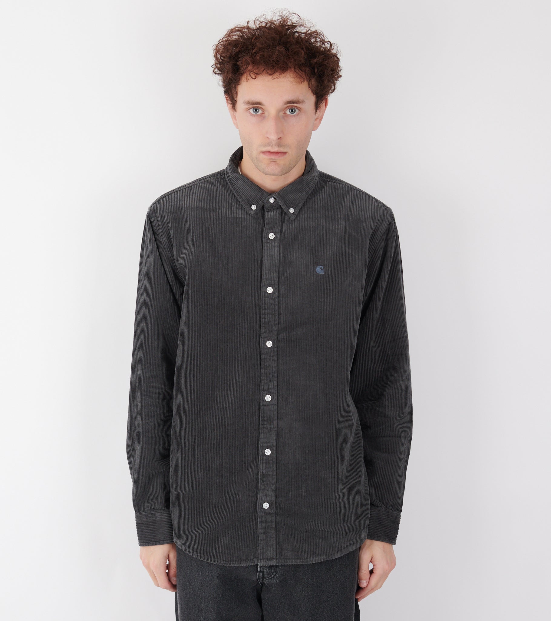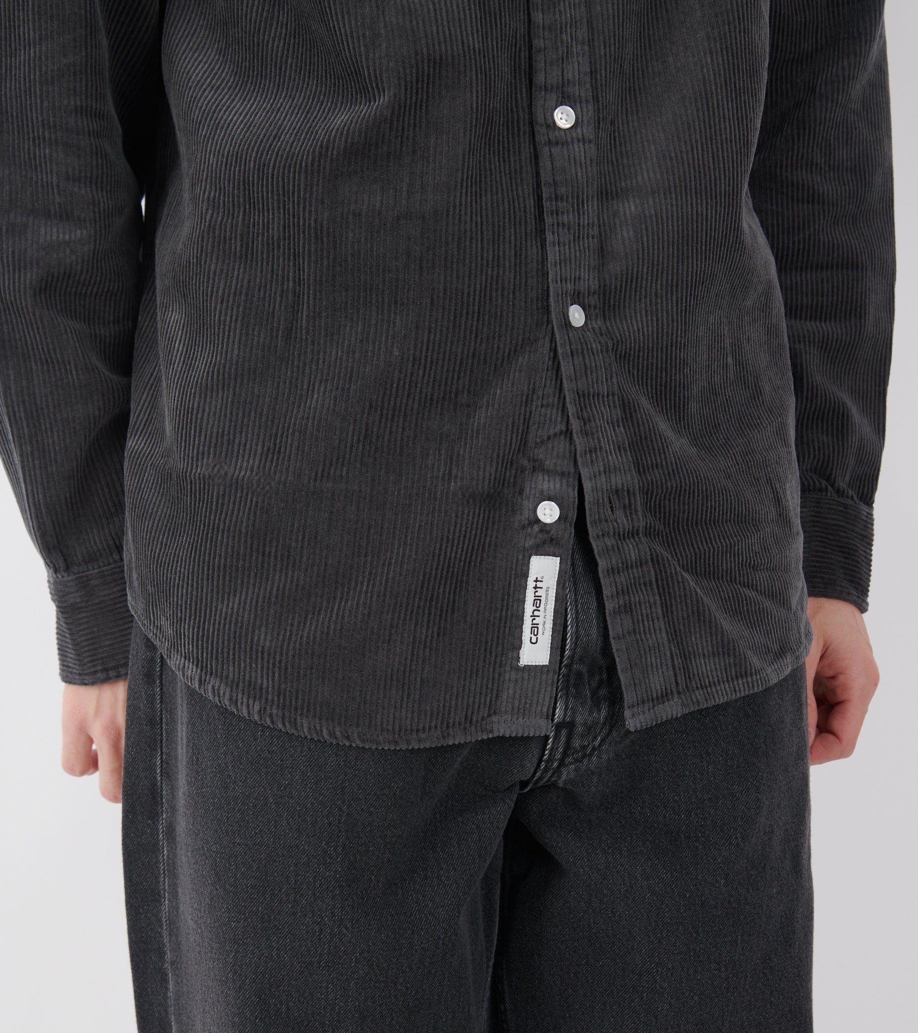 Mørkegrå skjorte i bomuldsfløjl fra Carhartt WIP. Ved venstre bryst er et gråt broderet logo.