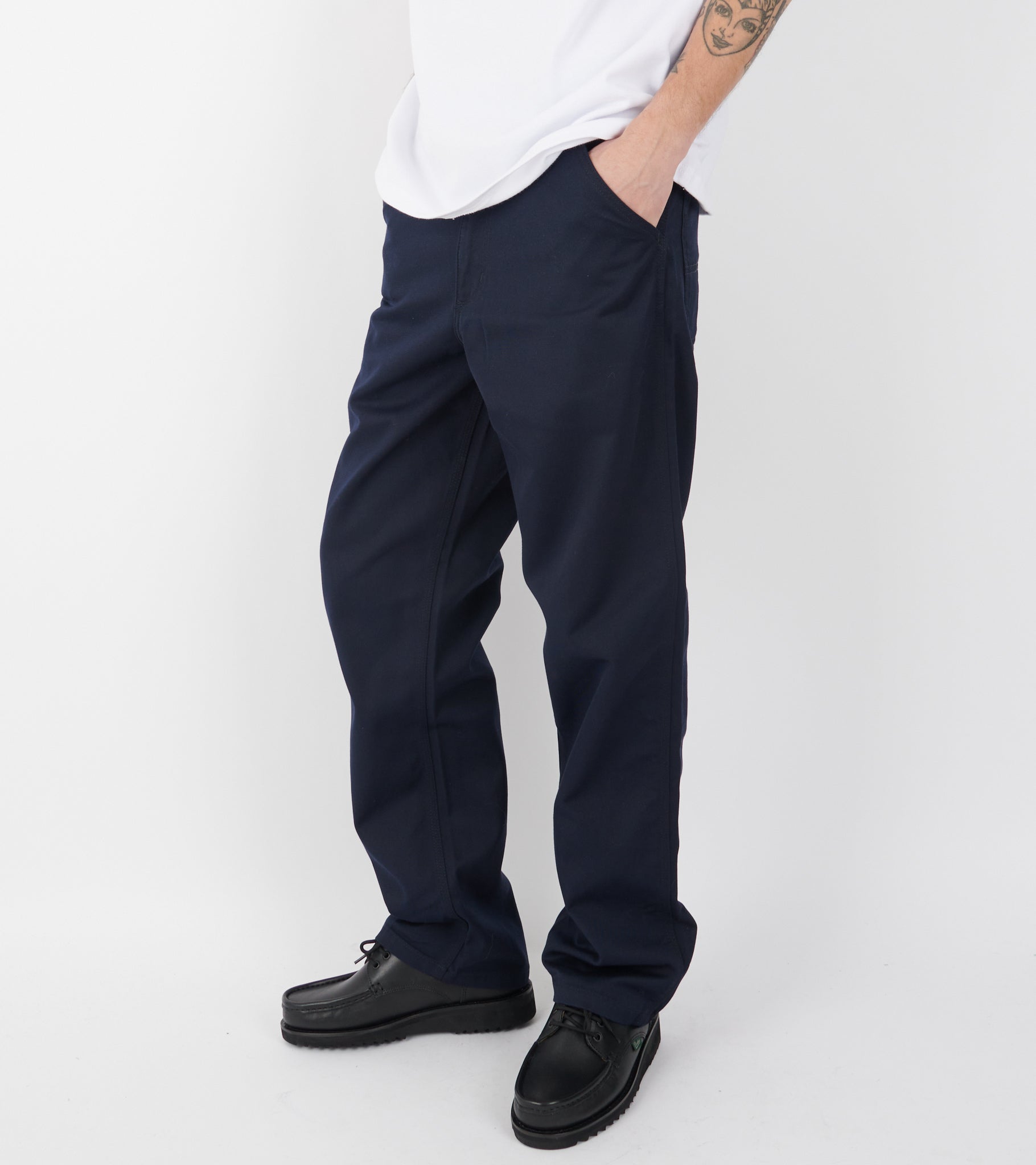 Blå Simple Pants fra Carhartt WIP. Disse Simple Pants er fremstillet i en 'Denison' twill-blanding. Bukserne har bæltestropper, en skrålomme i hver side og to baglommer. Bagpå den ene baglomme er det ikoniske logo.