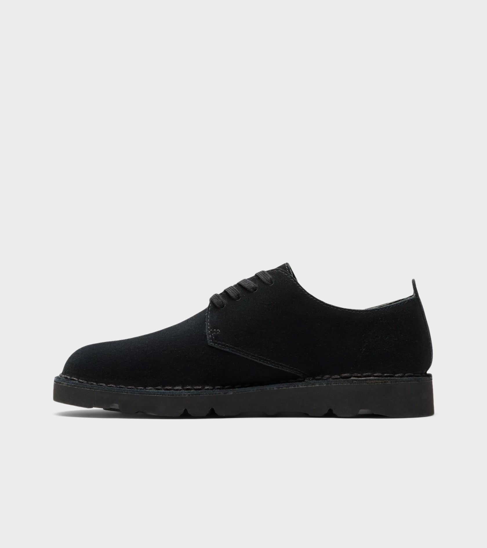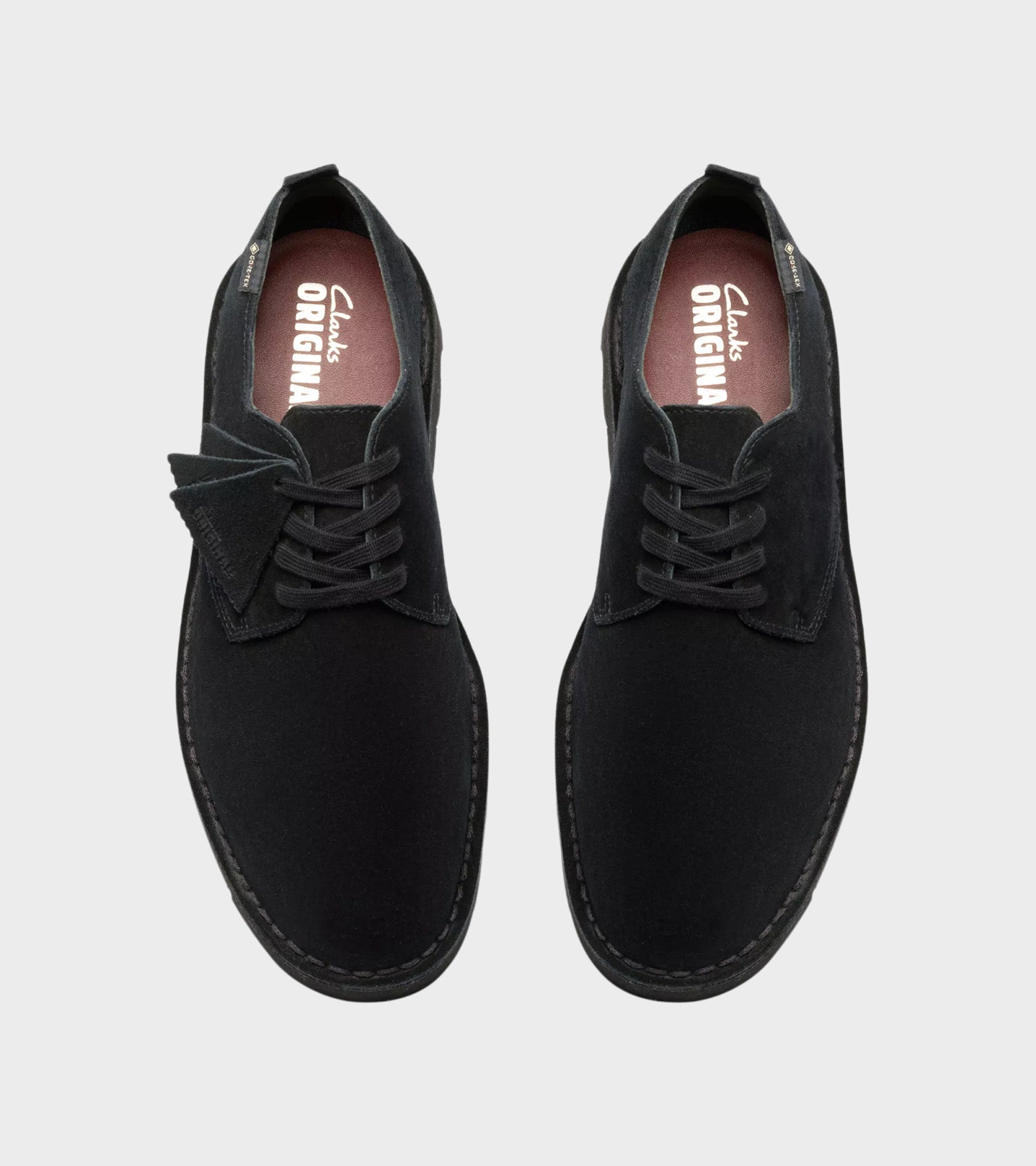 Desert London Gore-tex i sort ruskind fra Clarks. Skoen har en klassisk snørelukning, Gore-tex foring indvendig samt en Vibram-ydersål.