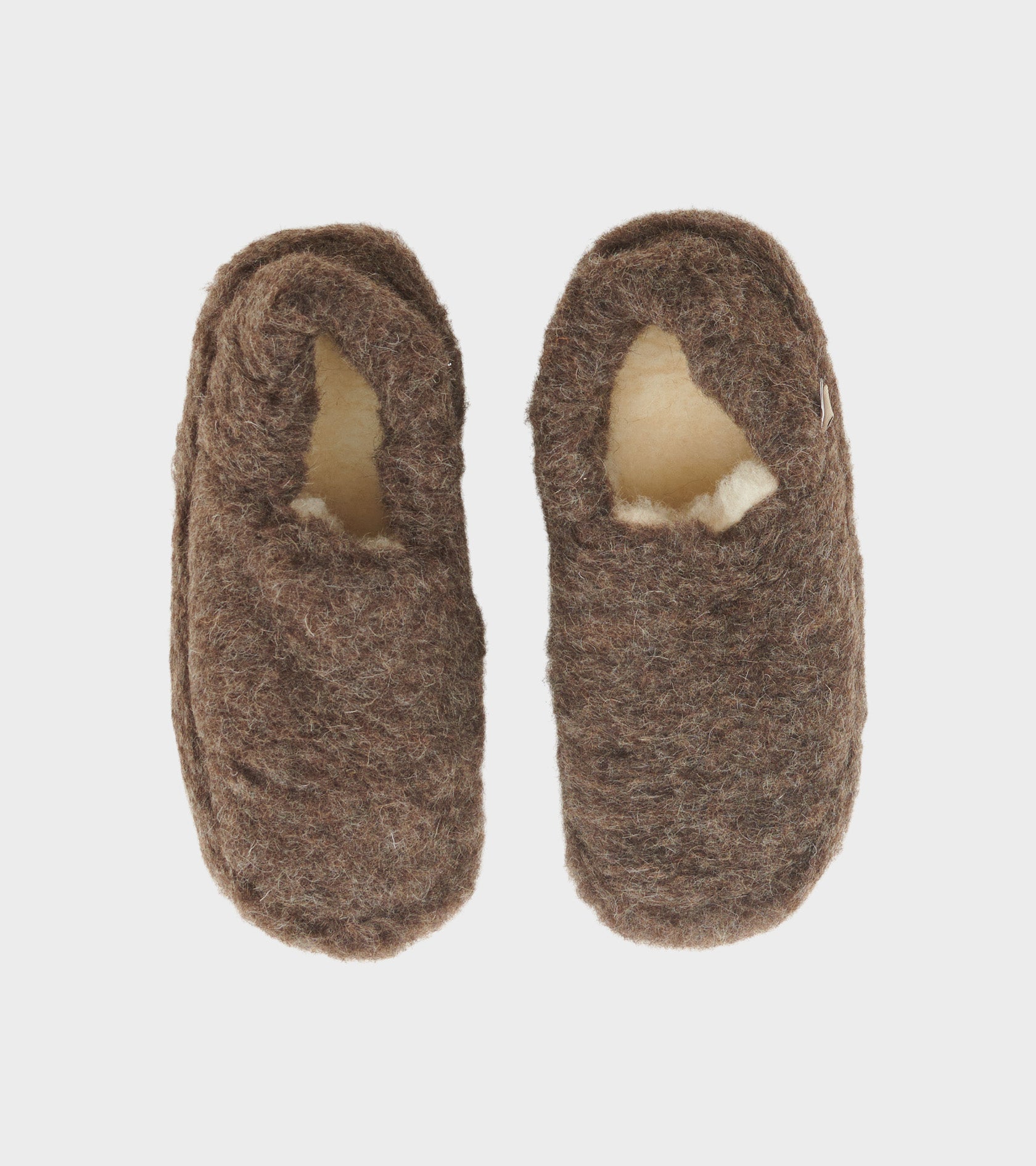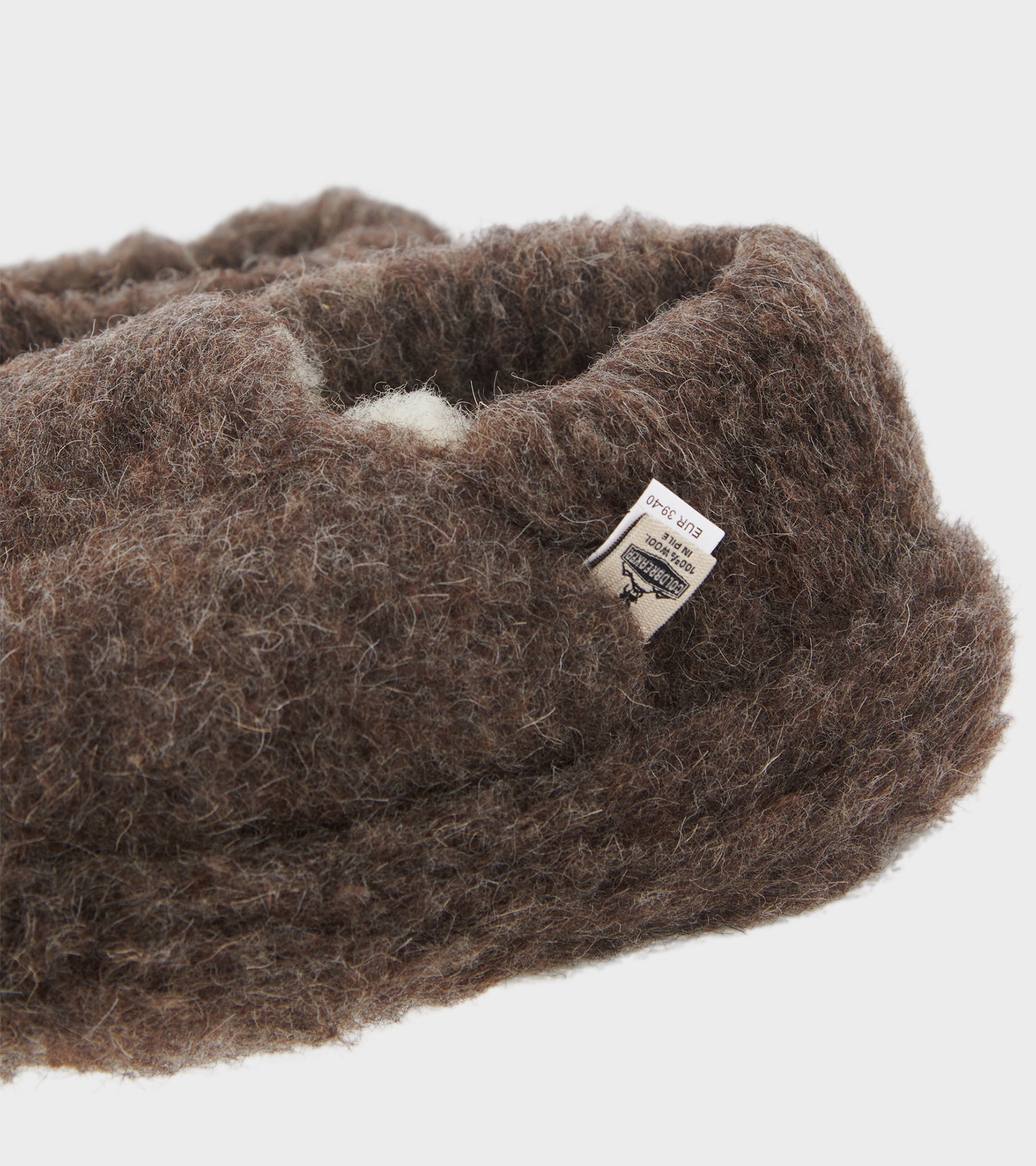 Brune hjemmesko fra Coldbreaker. Siberian Slippers er fremstillet i irsk langhåret uld fra den irske fabrikant 'Yoko Wool'.