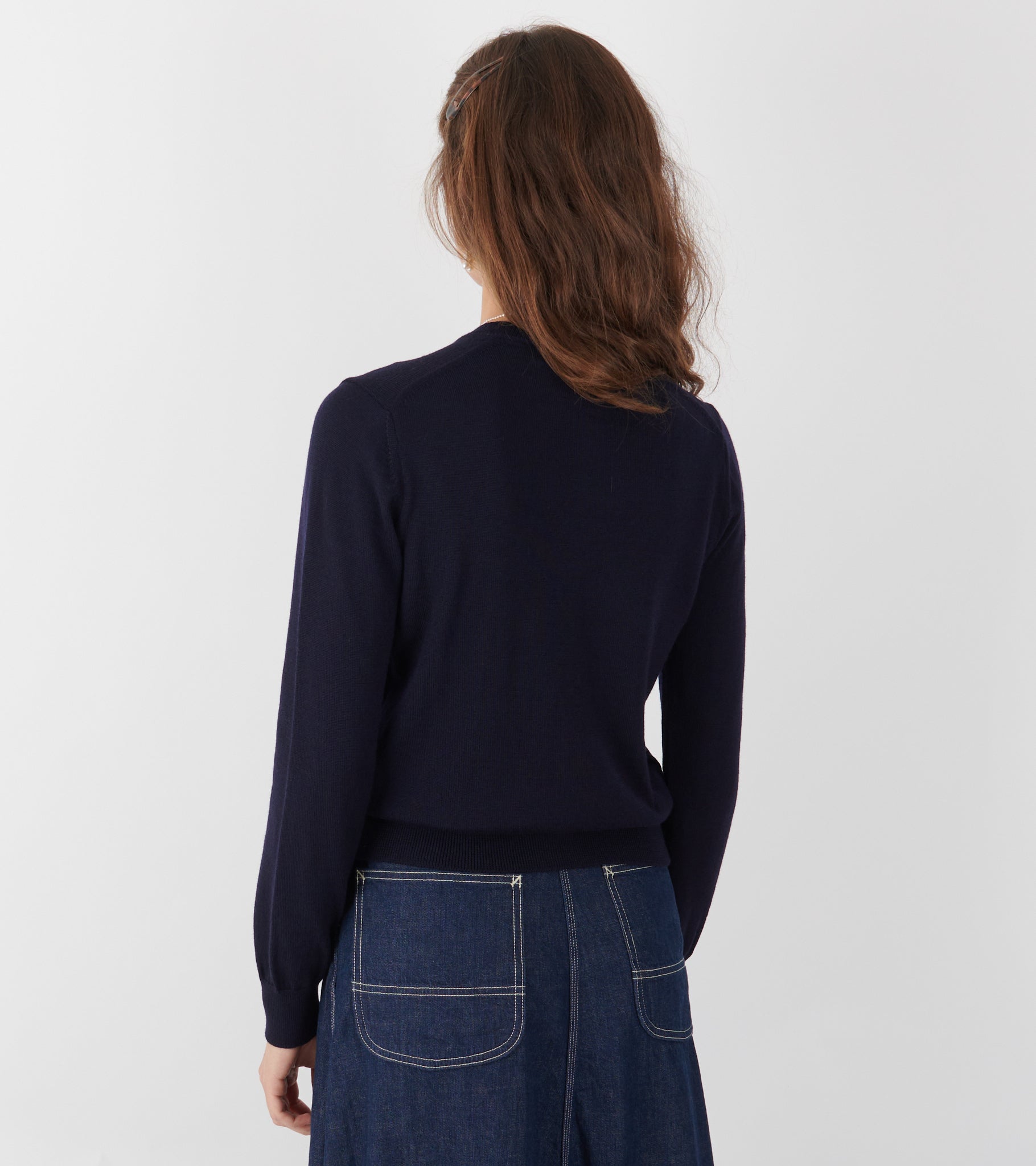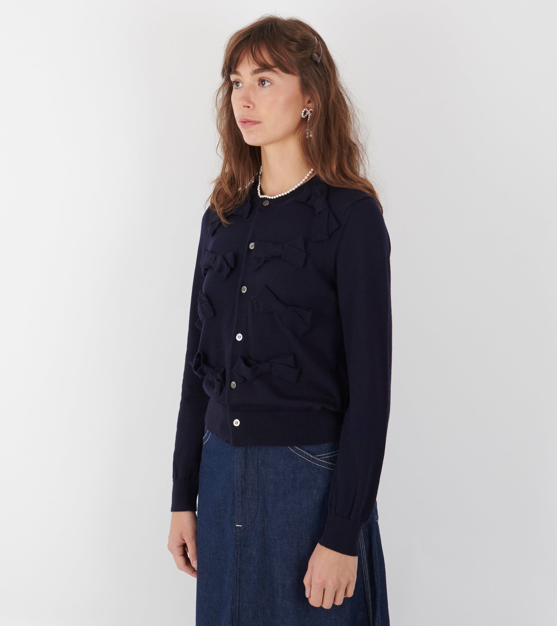Strikket blå cardigan med sløjfer fra Comme des Garcons Girl. Denne cardigan er fremstillet i uld og har en rund hals samt knaplukning på fronten.