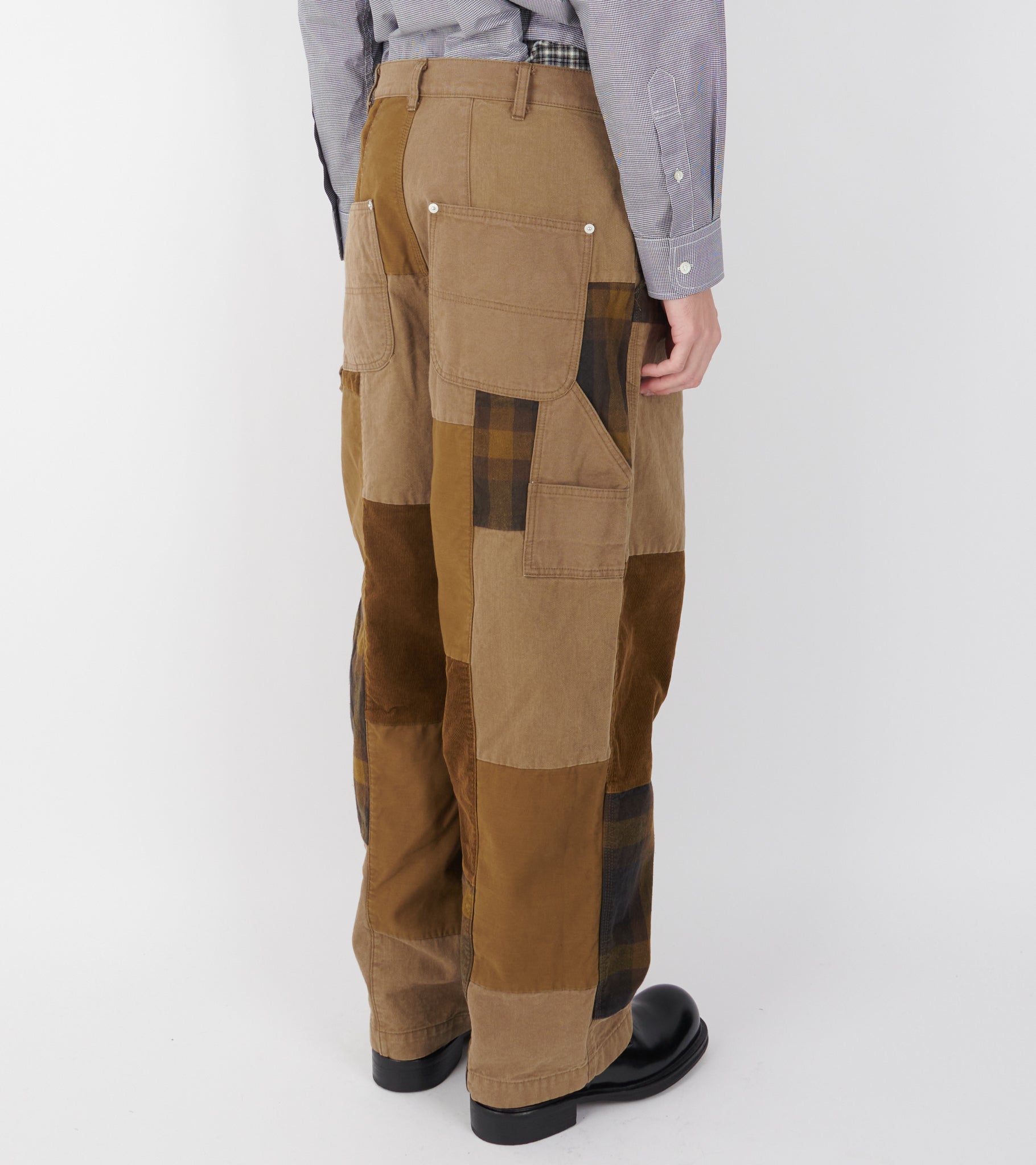 Beige workwear-inspirerede bukser i bomuldskanvas fra Comme des Garcons Homme. Bukserne har patch-detaljer i bomuldsfløjl samt tern. De har bæltestropper, en skrålomme i hver side og fire lommer samt en hammer-loop bagpå. Bukserne har brede lige ben.
