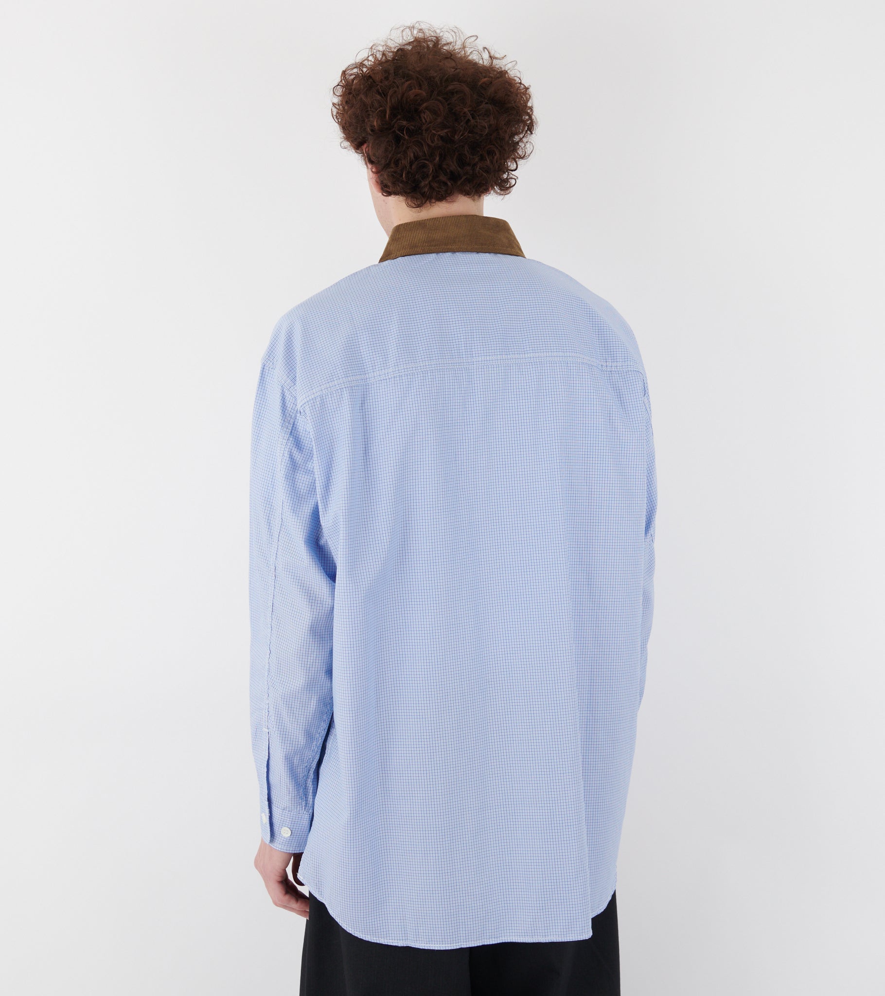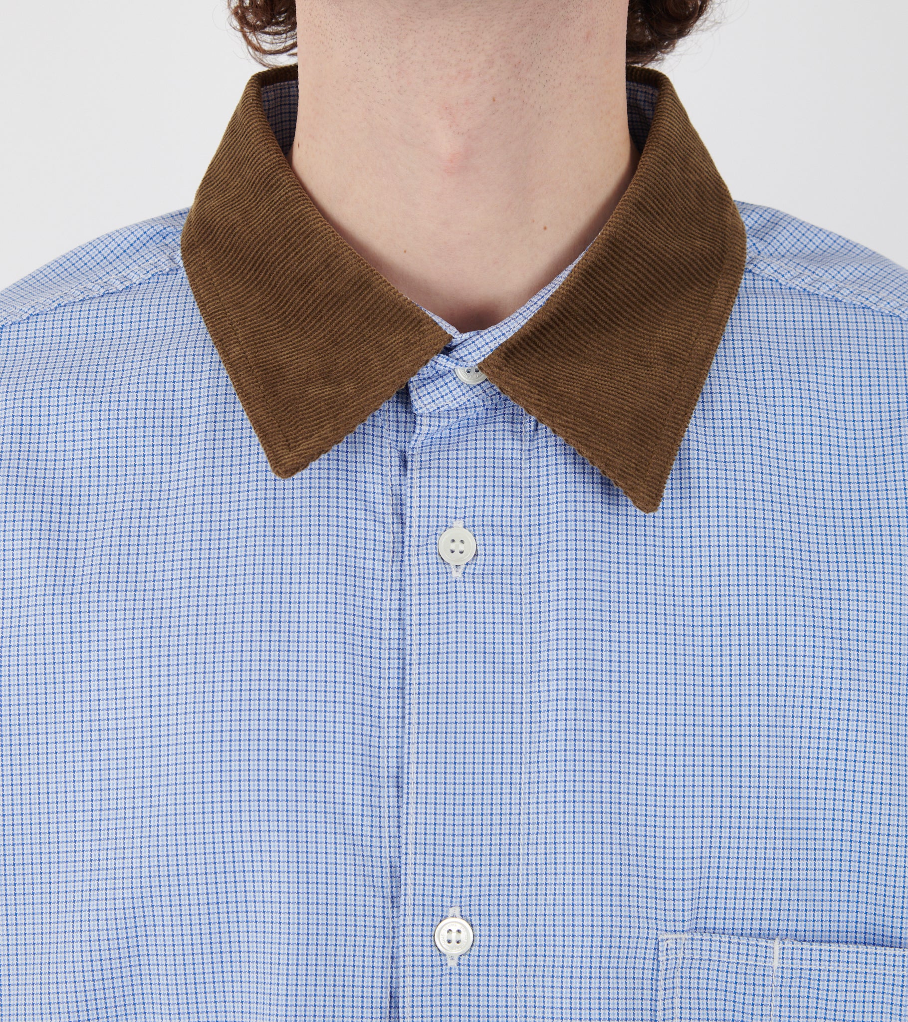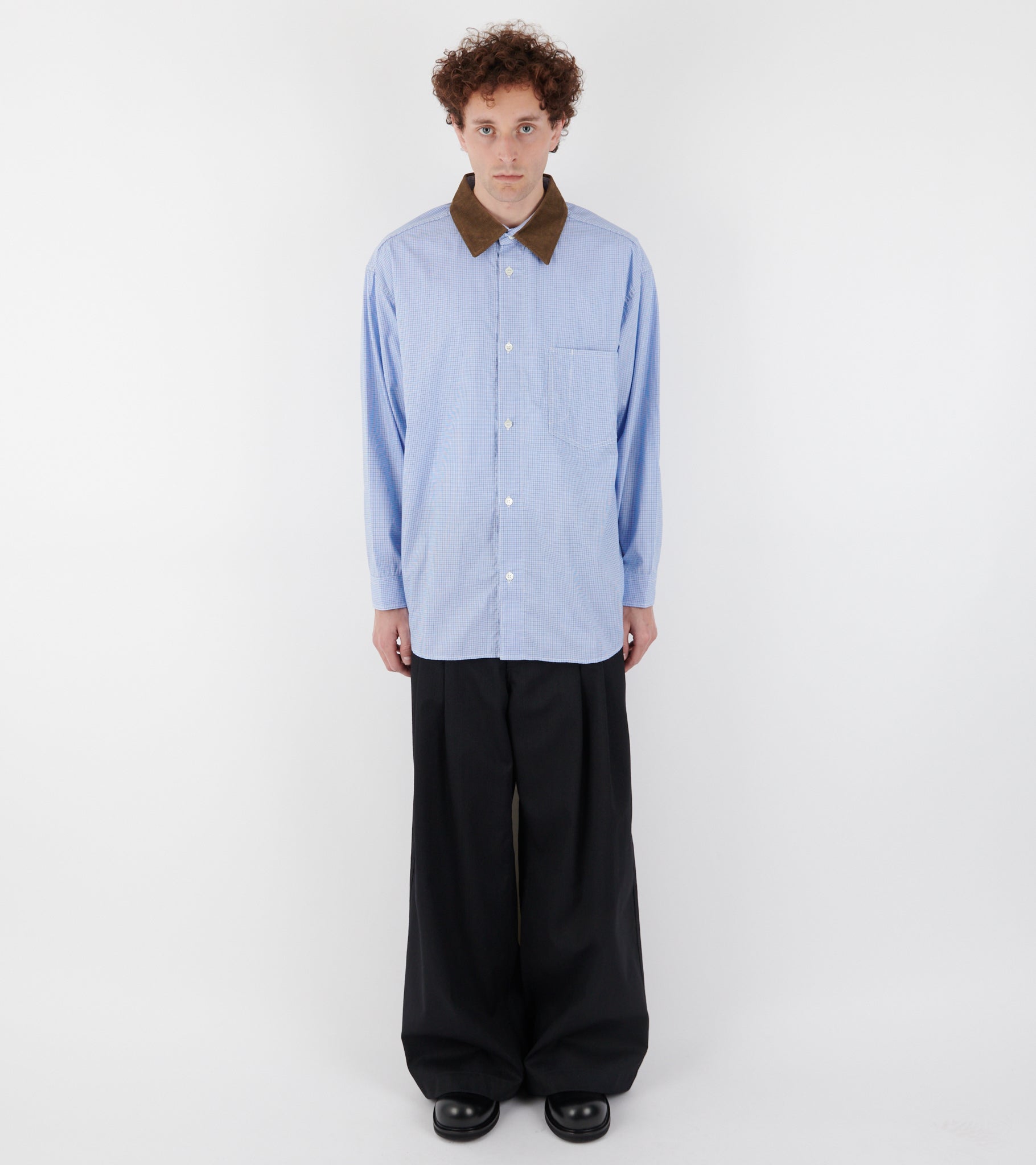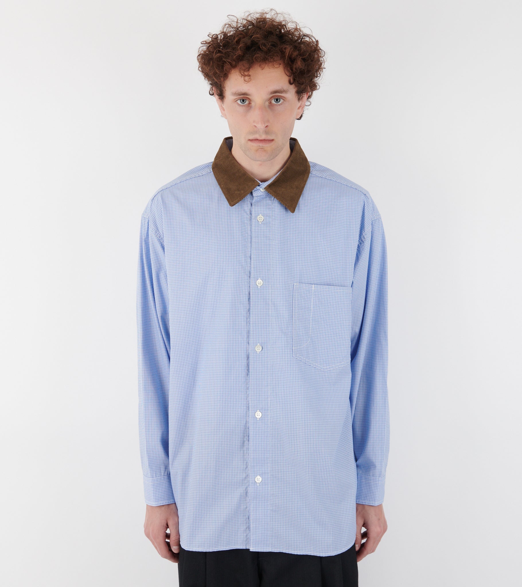 Ternet lyseblå skjorte fra Comme des Garcons Homme. Skjorten er fremstillet i bomuldspoplin og har en klassisk krave i brunt bomuldsfløjl, en brystlomme samt en knaplukning på fronten.