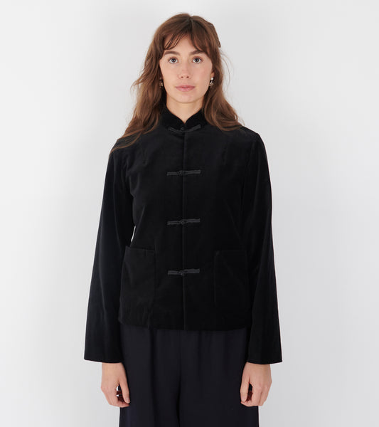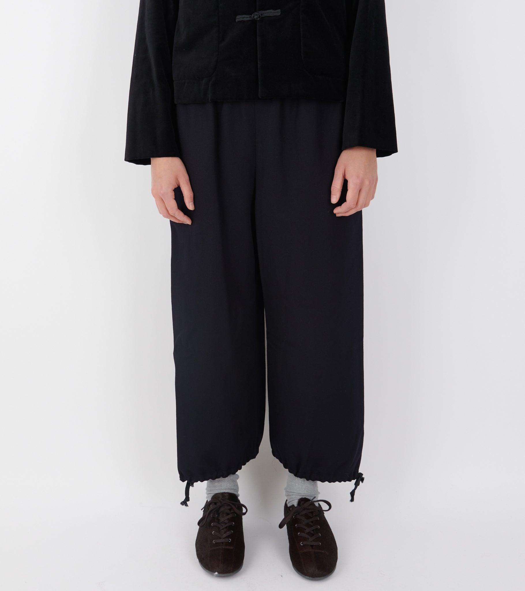 Navy bukser i uld fra Comme des Garcons. Bukserne har elastik og et indvendigt bindebånd i livet, en skrålomme i hver side samt justerbare snore i bunden.