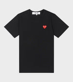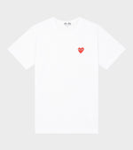 Hvid unisex t-shirt fra Comme des Garcons PLAY med mærkets karakteristiske hjerte med øjne. Det fine hjerte er designet af Filip Pagowski, og er gennemgående på alle PLAY produkter. På denne model broderet i rød.