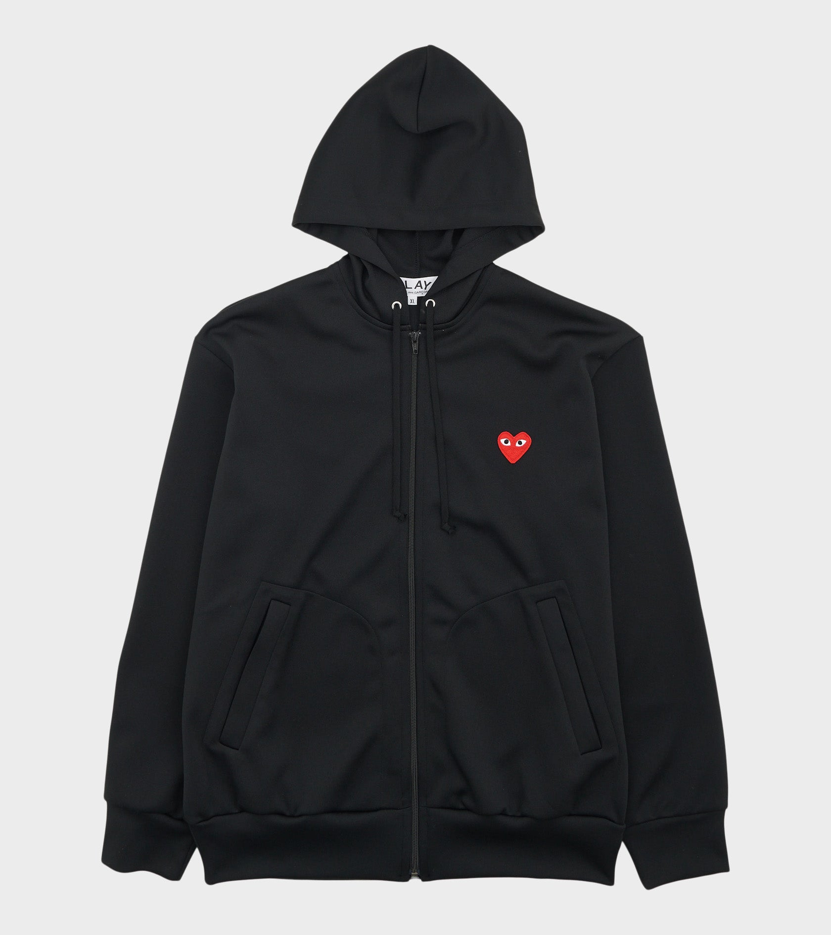 Sort hoodie med lynlås og det karakteristiske hjerte fra Comme des Garcons Play.