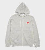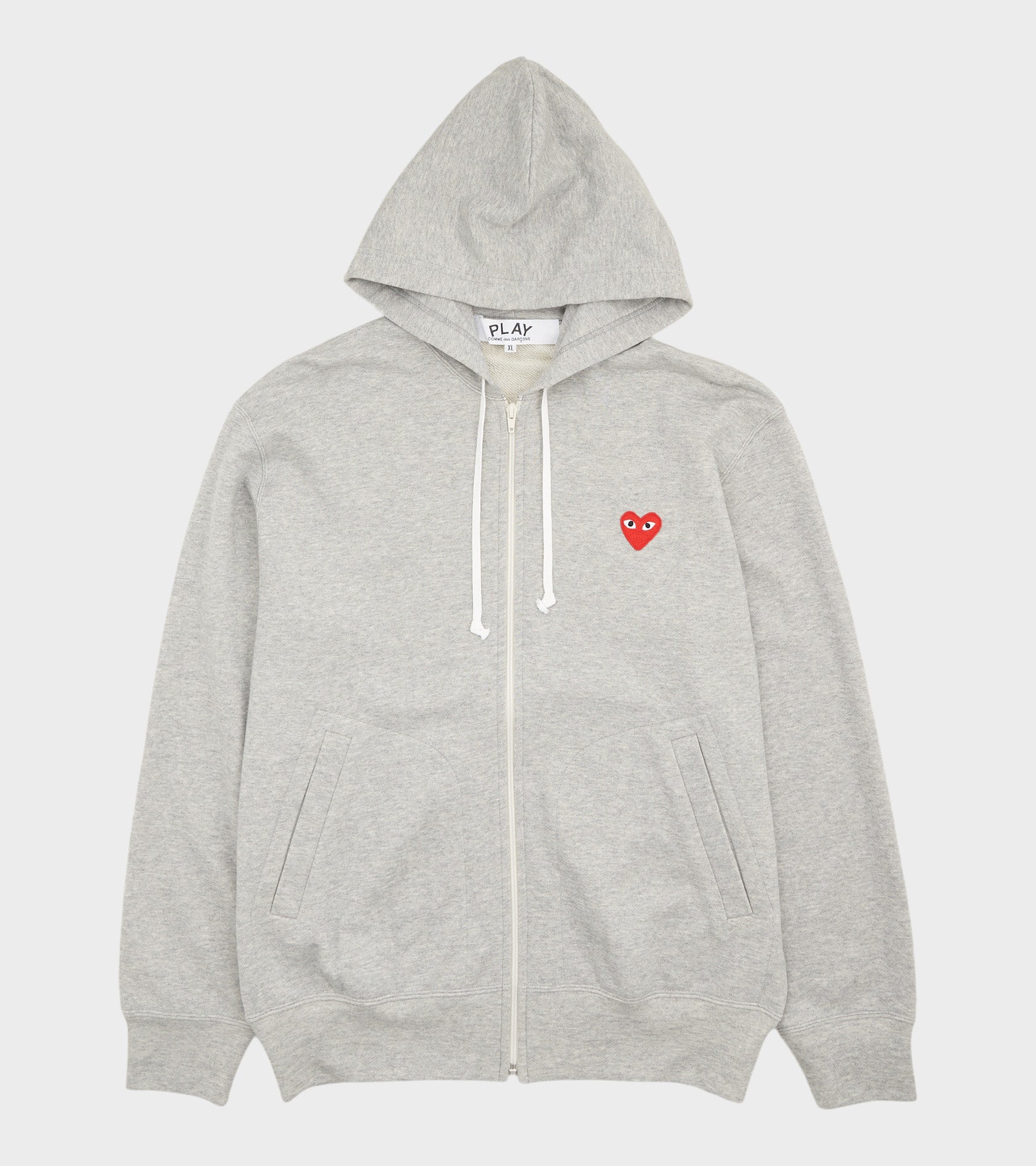 Grå hoodie med lynlås og det karakteristiske hjerte fra Comme des Garcons Play.
