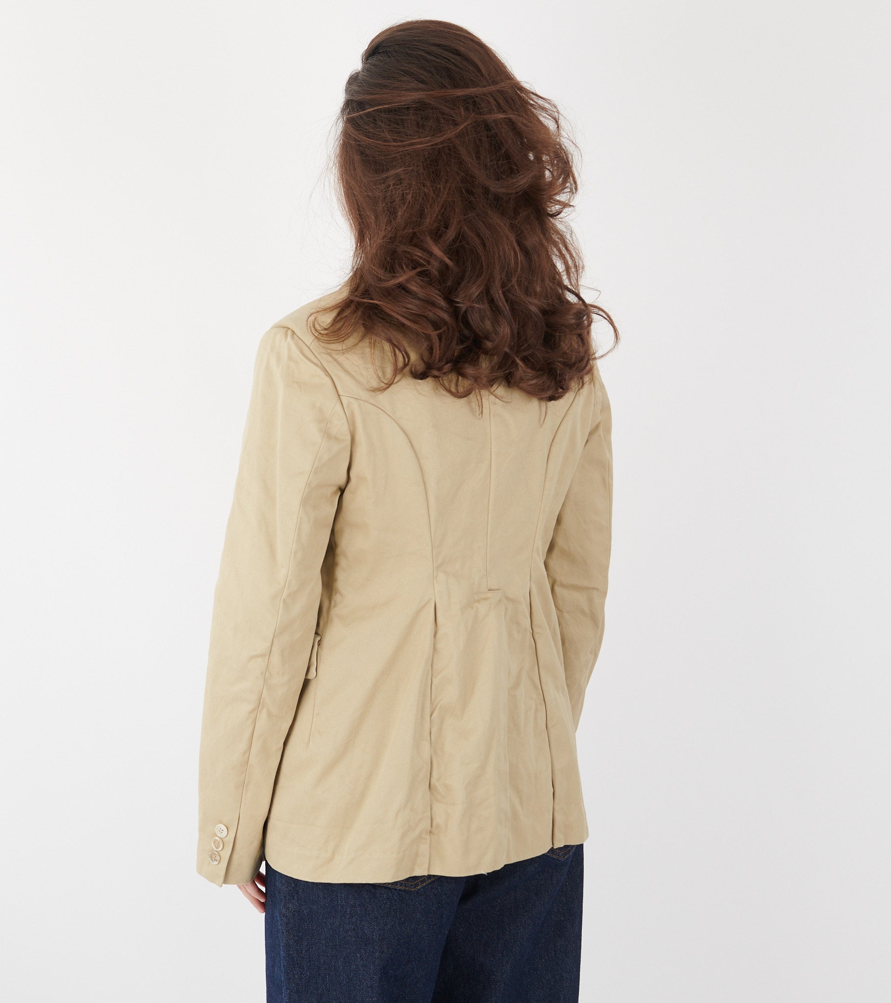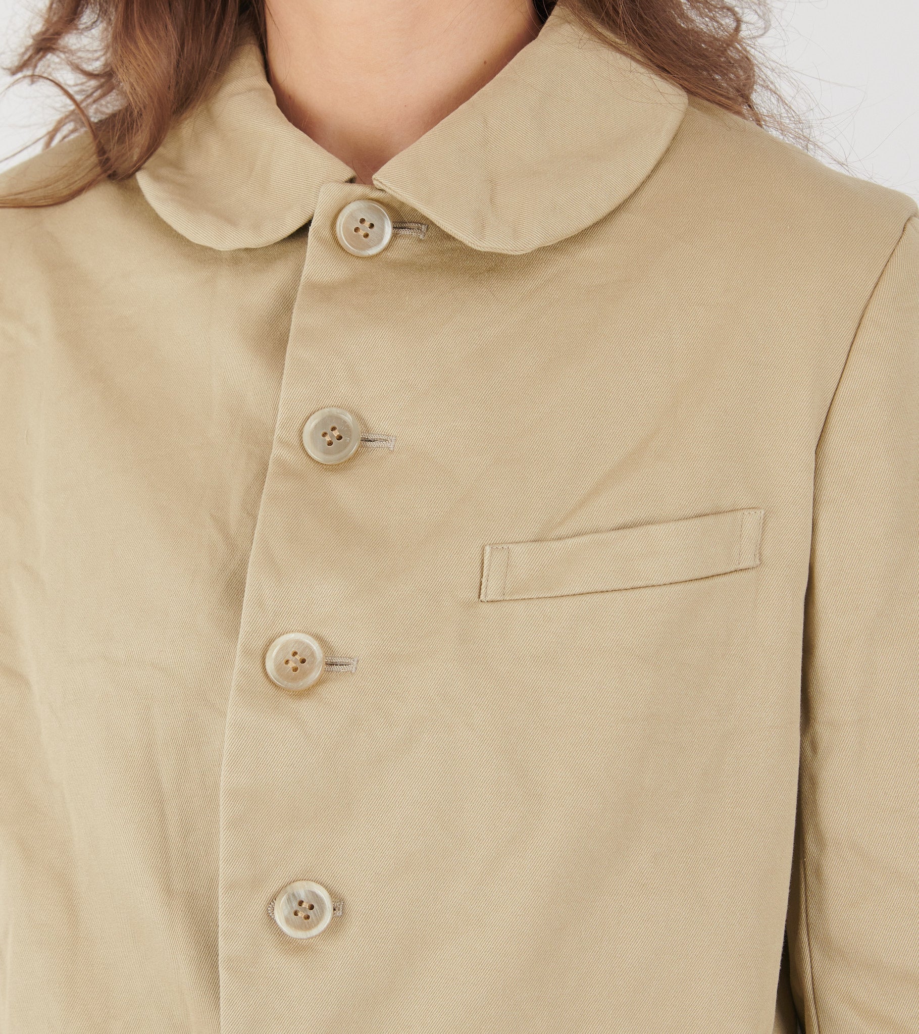 Beige blazer med en rund krave fra Comme des Garcons. Blazeren er fremstillet i en let krøllet bomuldskanvas kvalitet. Den har en knaplukning, tre lommer på fronten og en slids bagpå.
