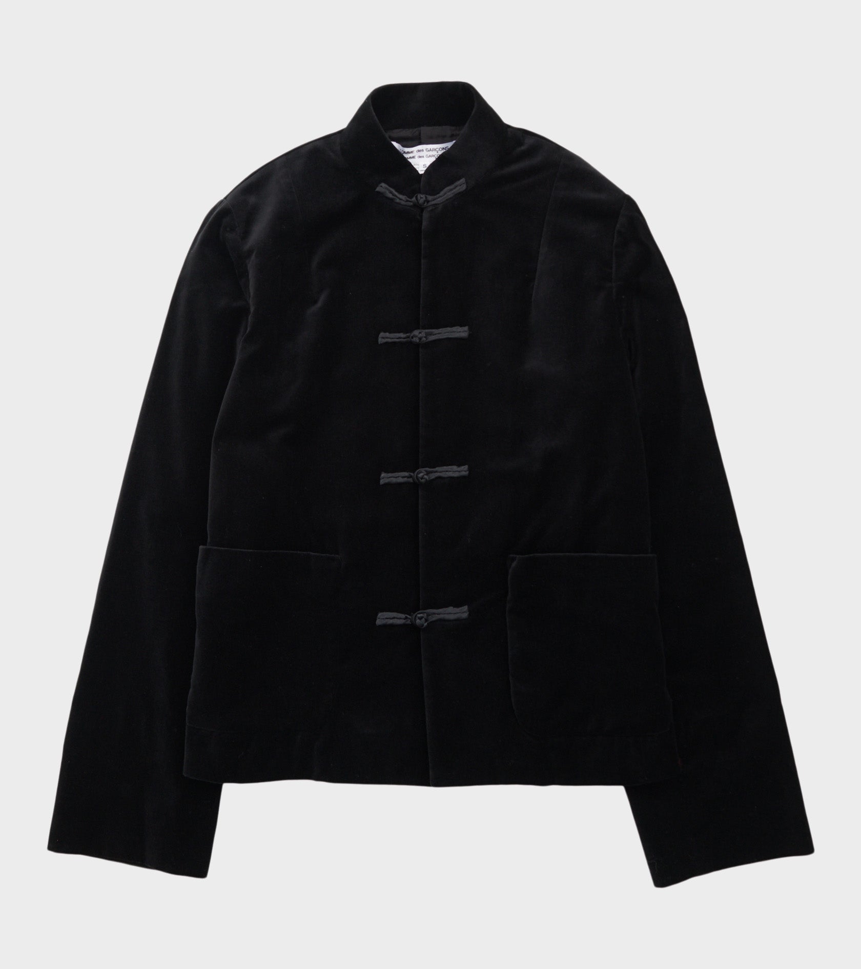 Sort jakke i bomuldsvelour fra Comme des Garcons. Jakken har en rund stående krave, to lommer samt en Japansk-inspireret knude-lukning ned langs fronten.