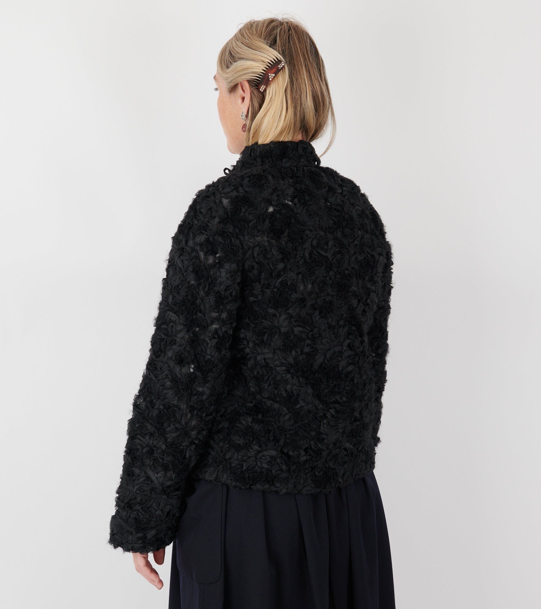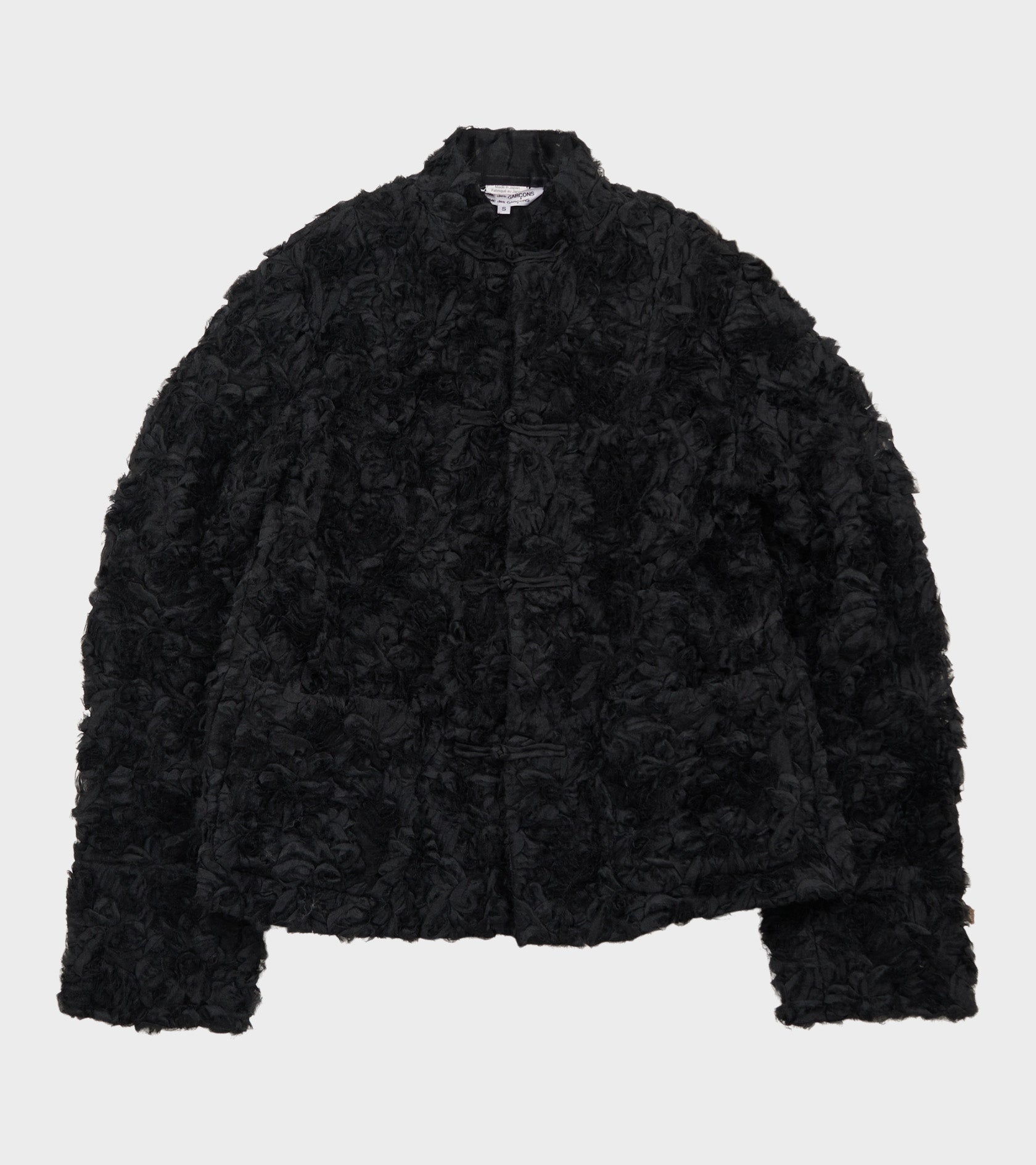 Sort jakke i en let skinnende tekstur polyester-mesh kvalitet fra Comme des Garcons. Jakken har en rund stående krave, to lommer samt en Japansk-inspireret knude-lukning ned langs fronten.