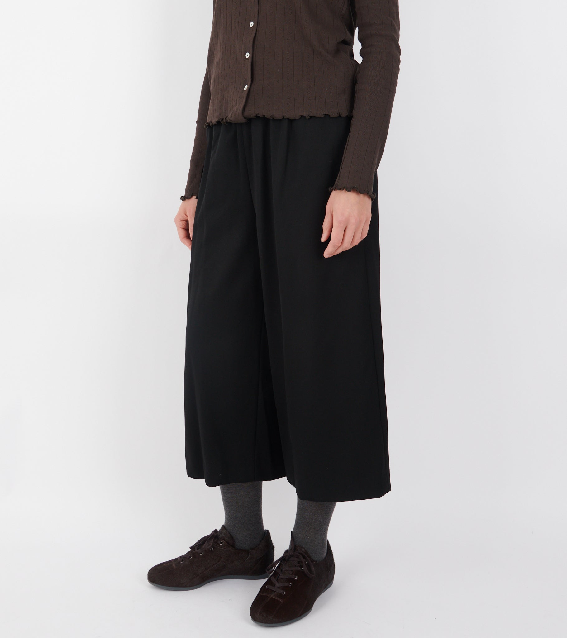 Sorte bukser i uld fra Comme des Garcons. Bukserne har en skrålomme i hver side samt elastik og et indvendigt bindebånd i livet. Bukserne har brede samt let cropped ben.