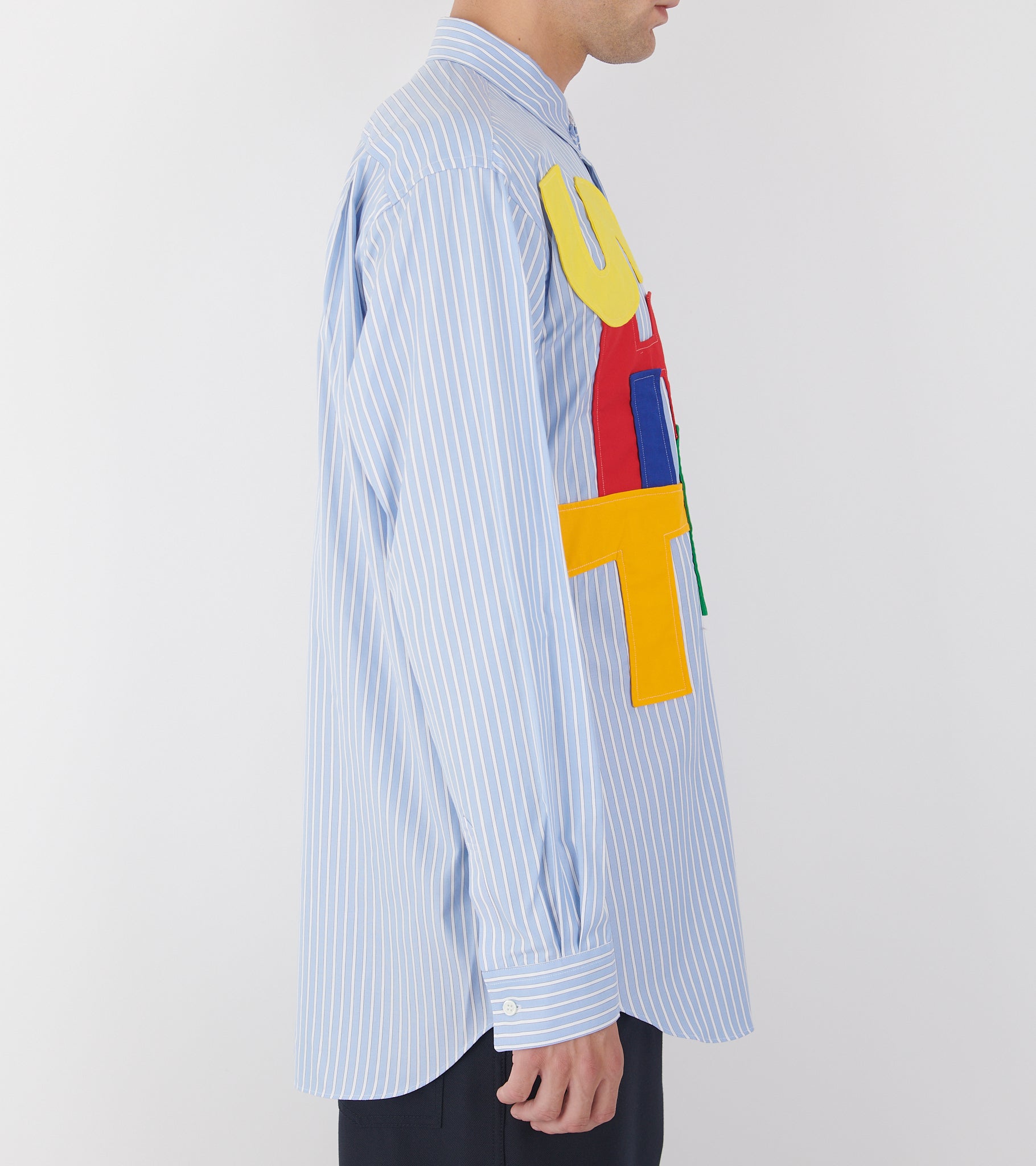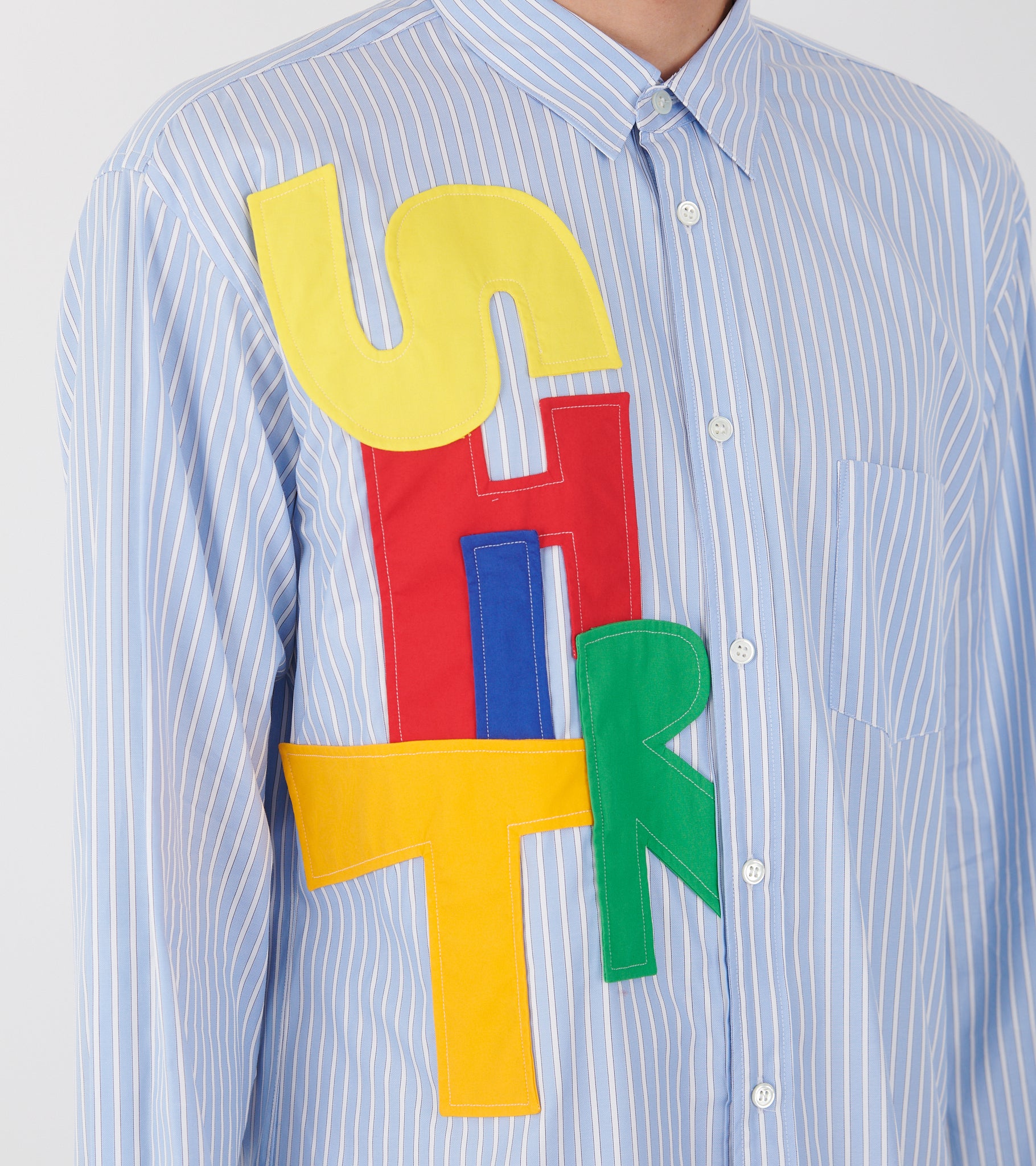 Stribet lyseblå skjorte fra Comme des Garcons Shirt. Skjorten har en klassisk krave, en knaplukning og en brystlomme. På fronten er 'Shirt' skrevet med multifarvet patchwork.