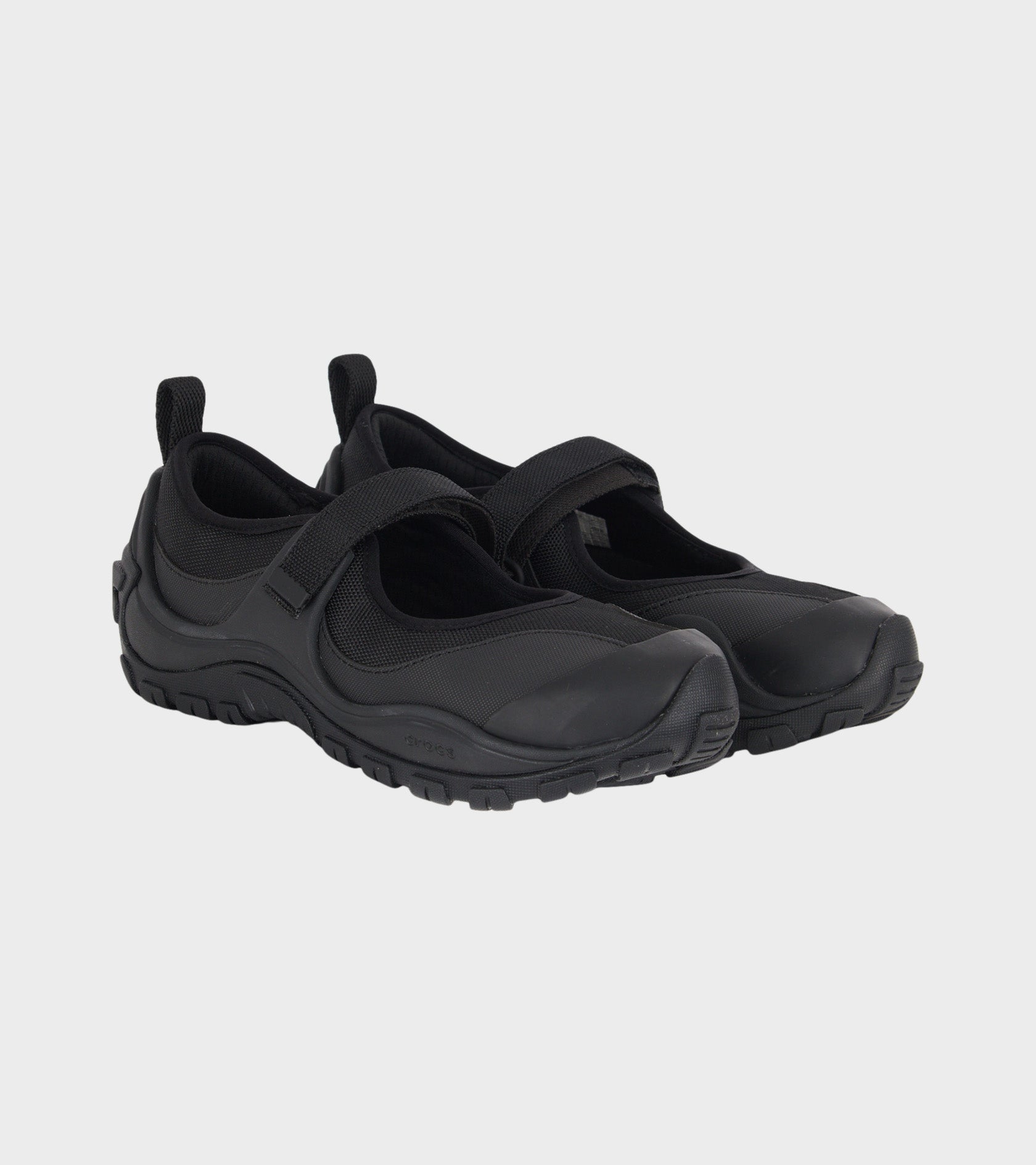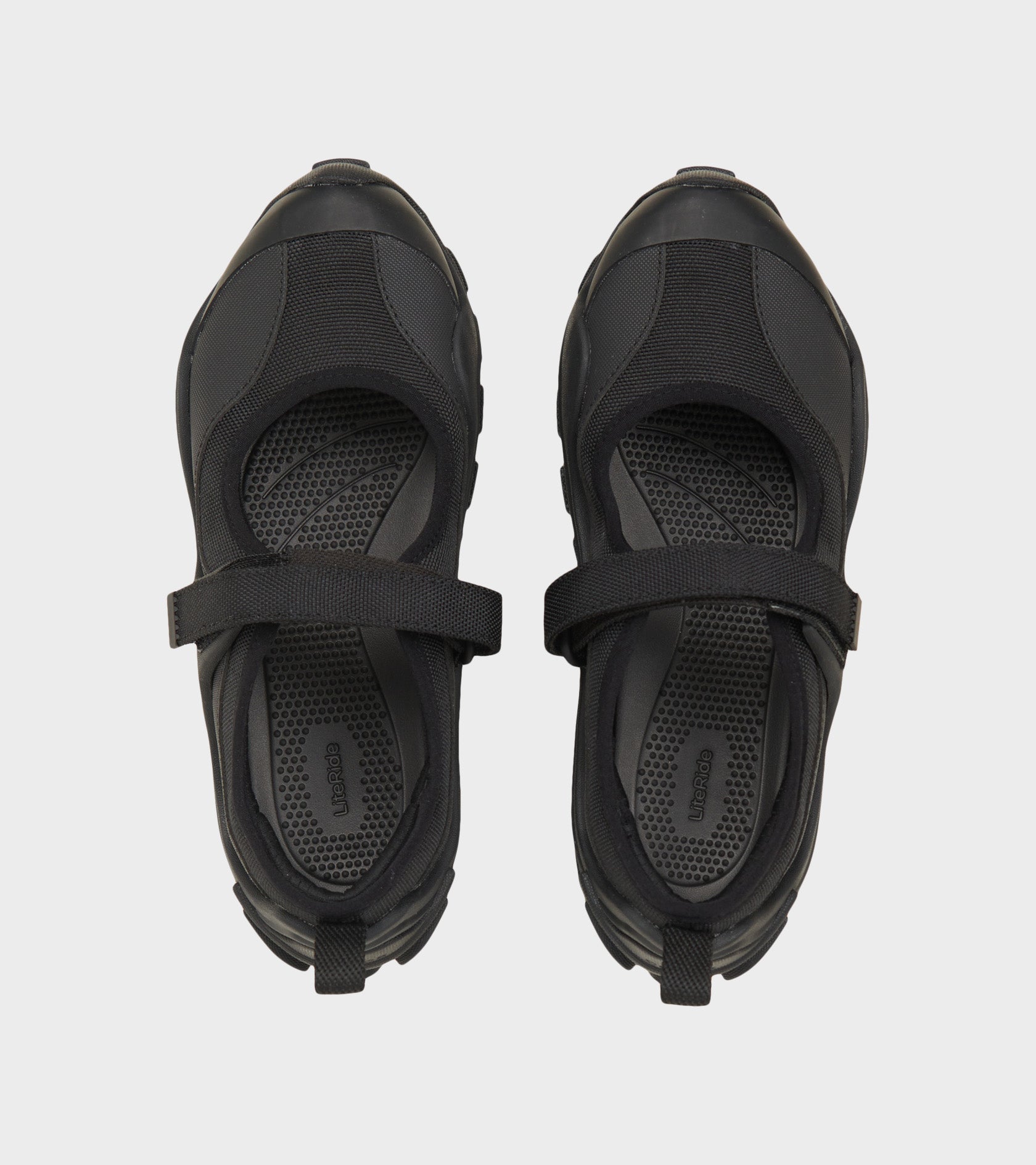 Ballerina-inspireret sneakers fra Crocs. Skoen har en overdel i sort nylon samt en stroplukning med velcro.
