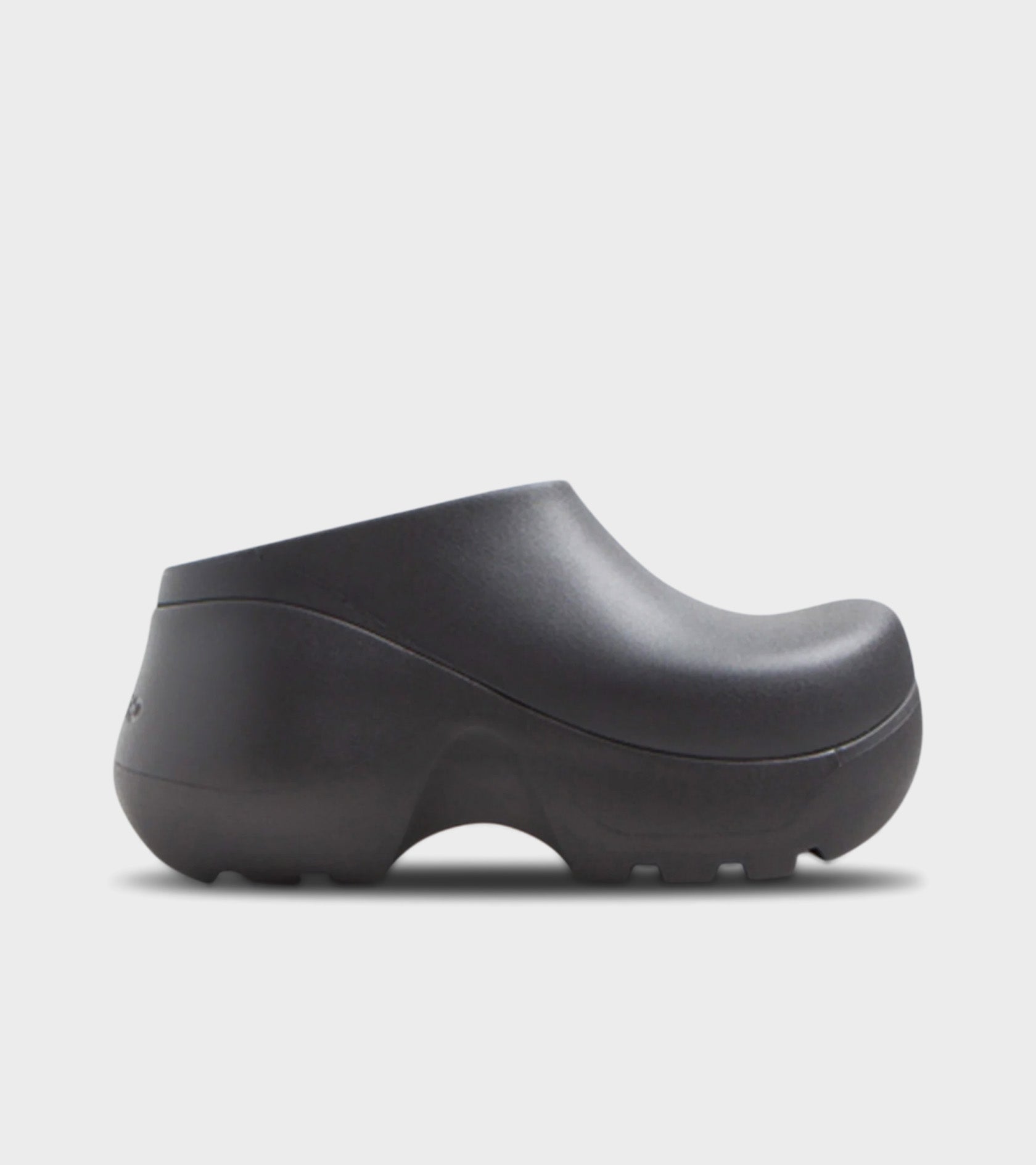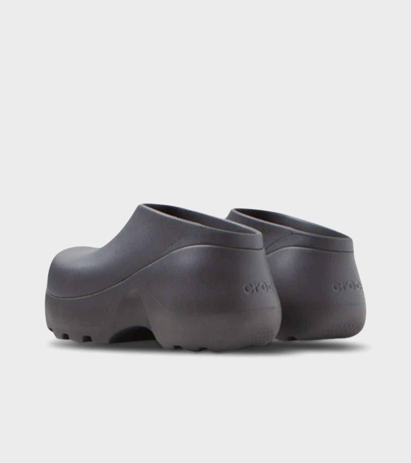 Mørkegrå Hydra Clogs fra Crocs. Disse sko har en chunky silhuet, et diskret logo på hælen og er fremstillet i termoplastik (EVA).