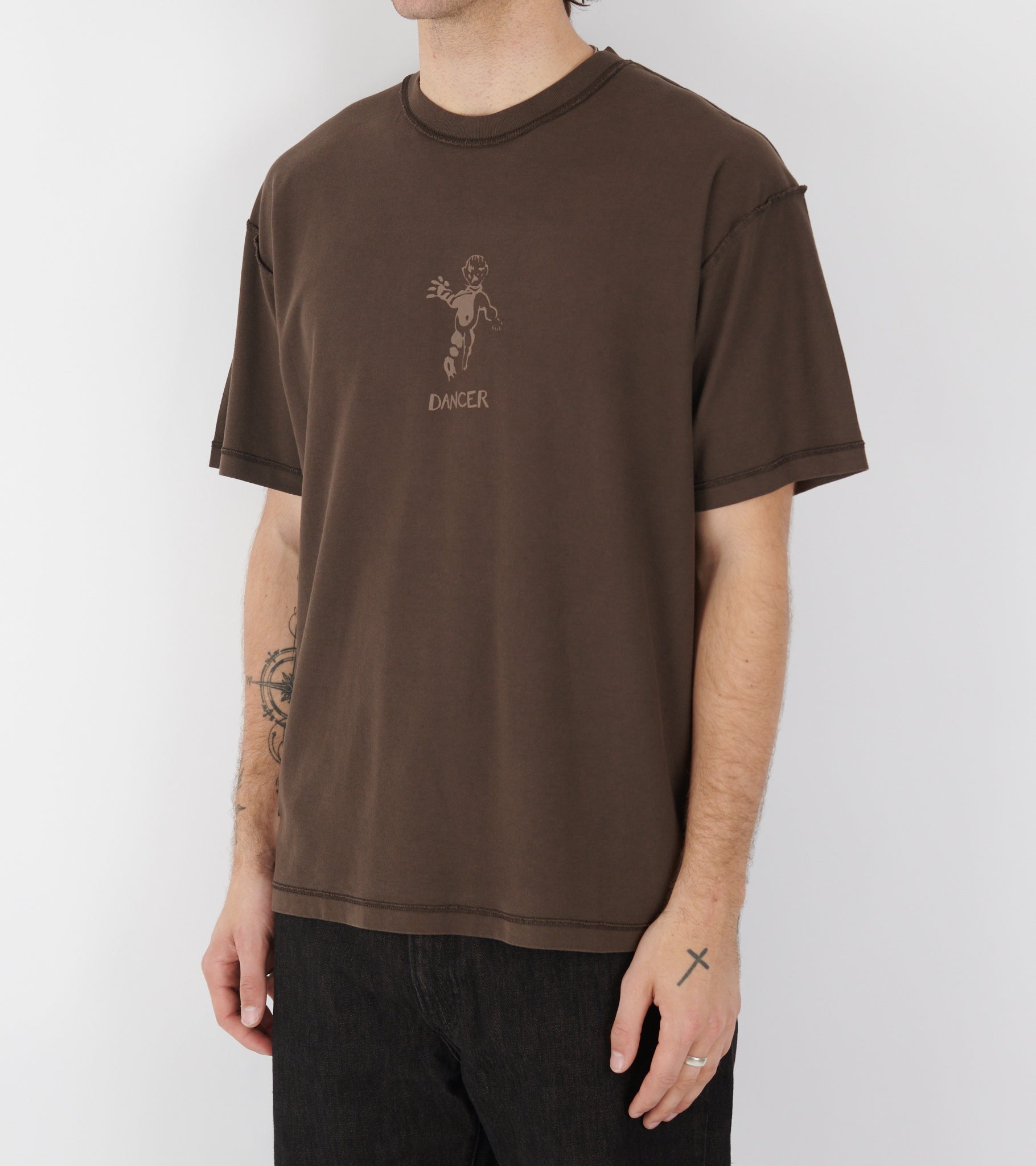 Mørkebrun garment dyed t-shirt fra Dancer. T-shirten har 'inside-out' design med udvendige syninger.