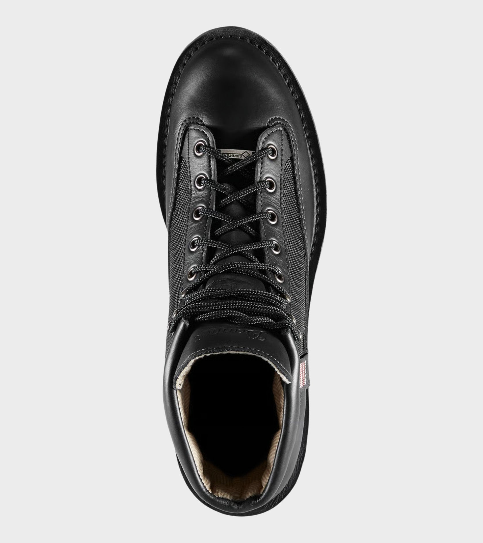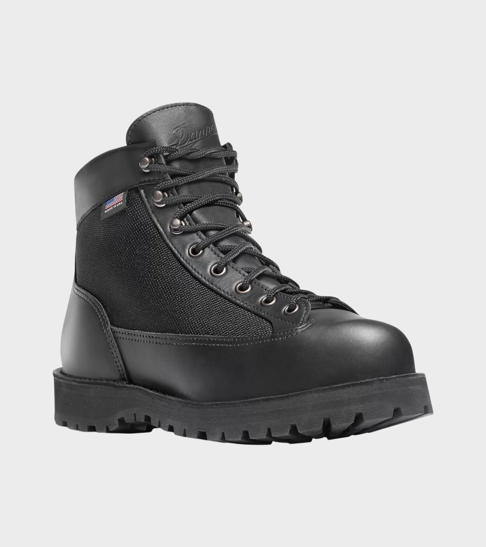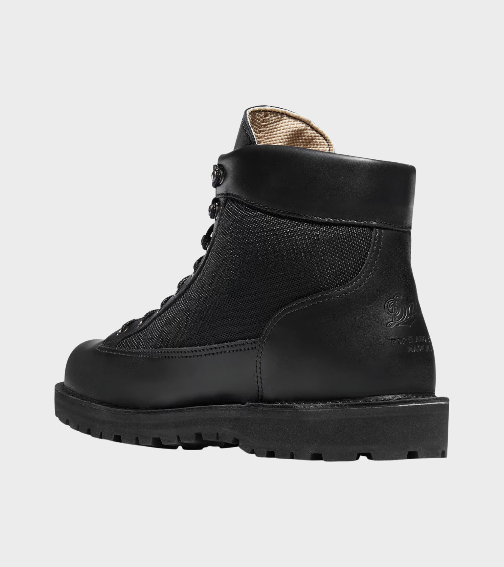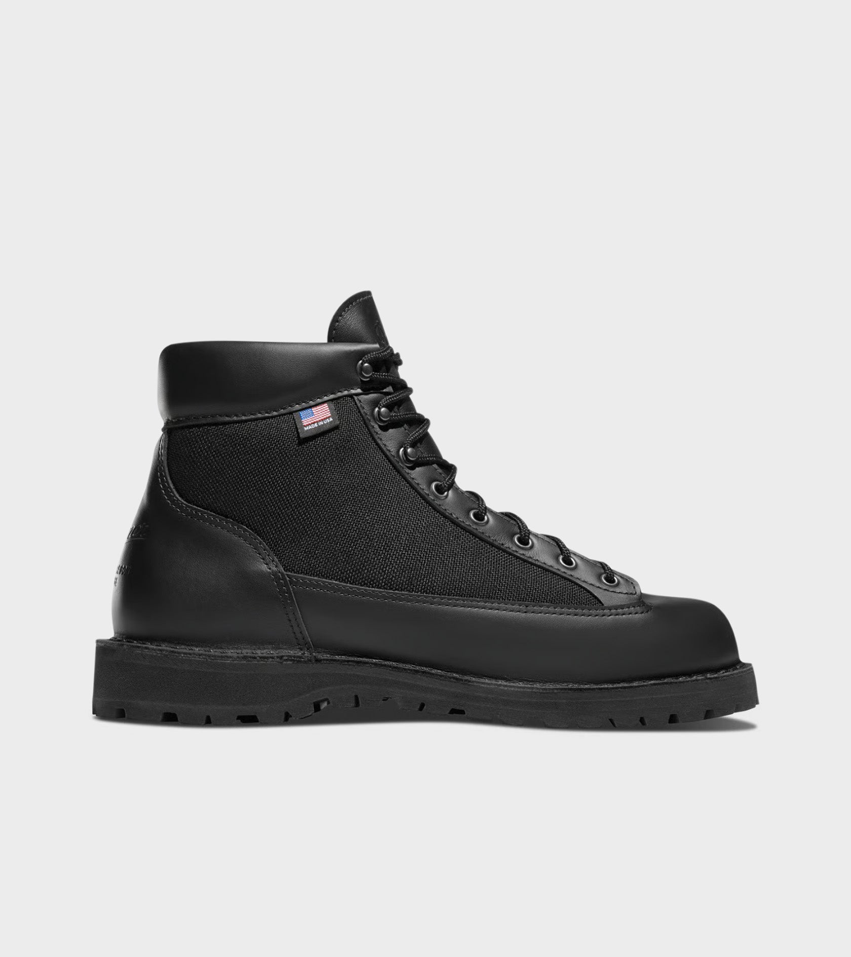 Sorte støvler i læder og tekstil fra Danner. Disse støvler er foret med et vandtæt Gore-tex materiale og har en Vibram gummisål. Støvlen har et lille amerikansk tag og på tungen er et præget Danner logo. Støvlerne er produceret i USA.