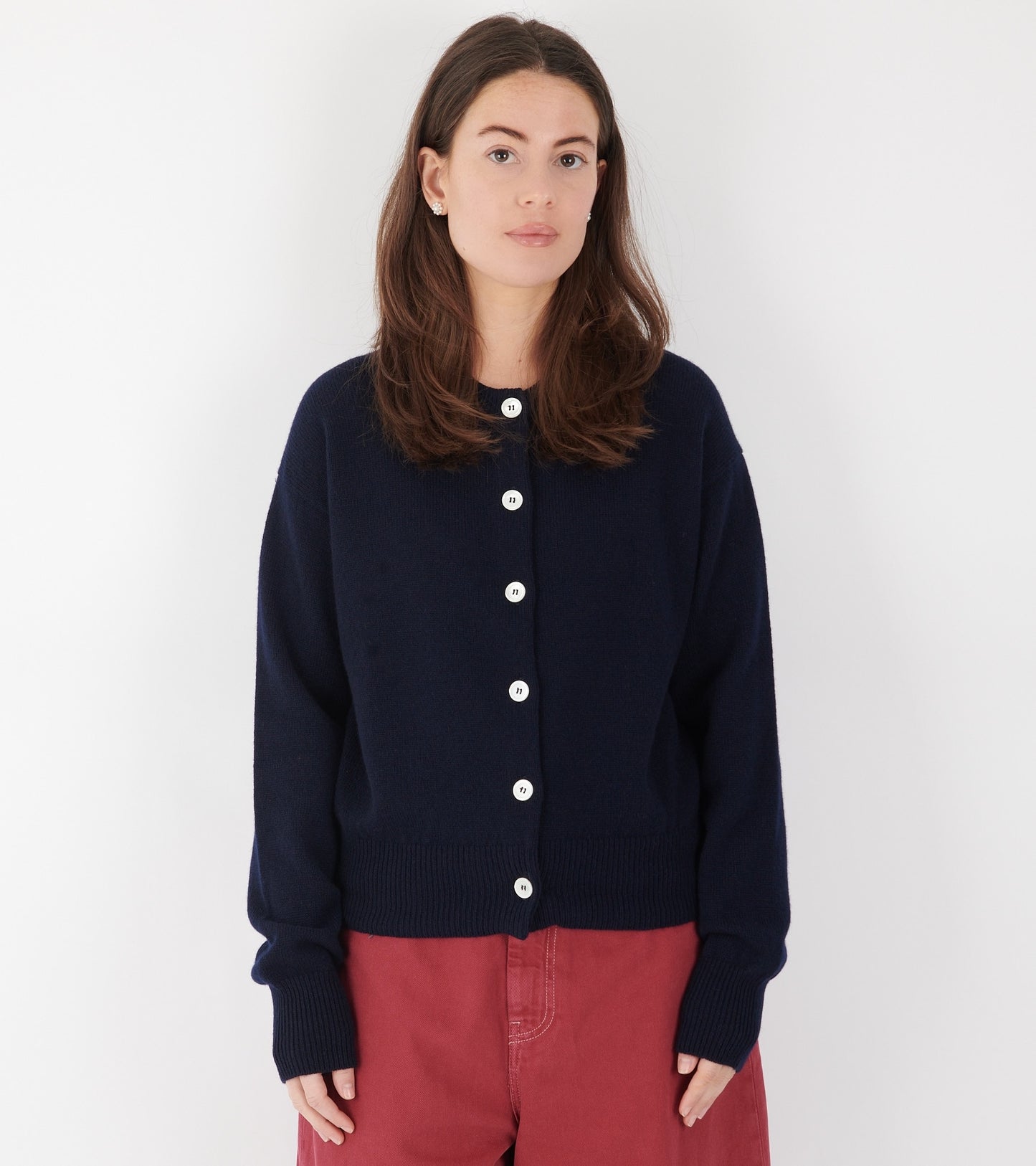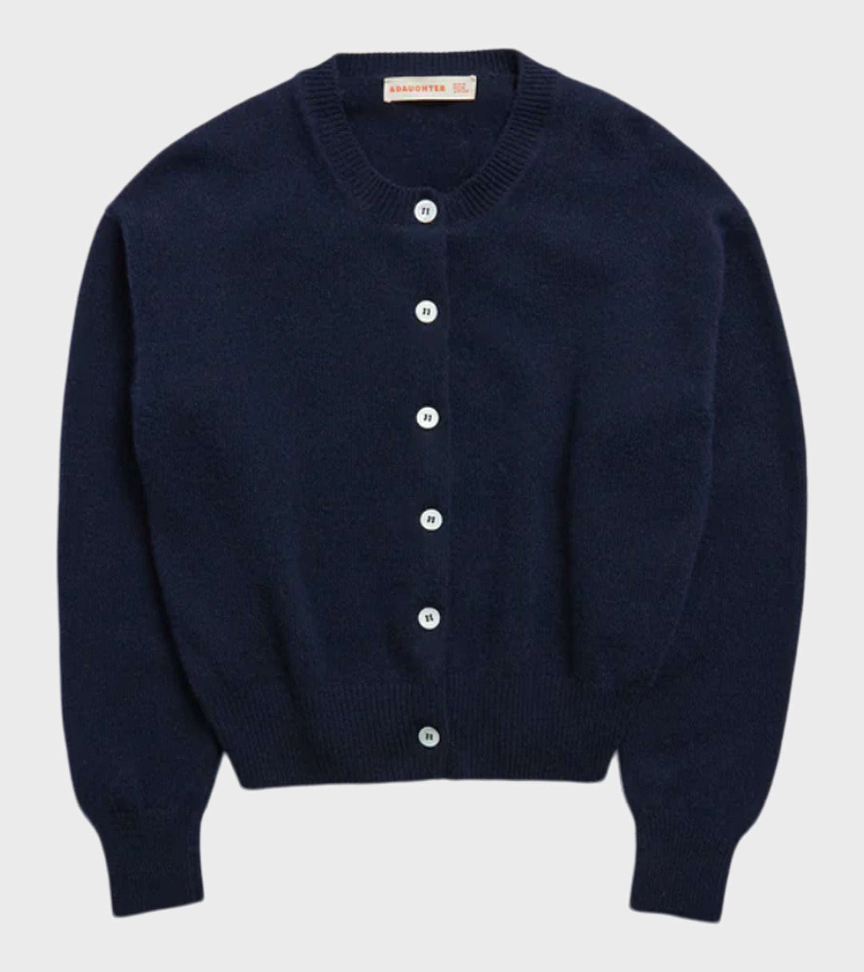 Navy strikket cardigan i lammeuld fra &Daughter.