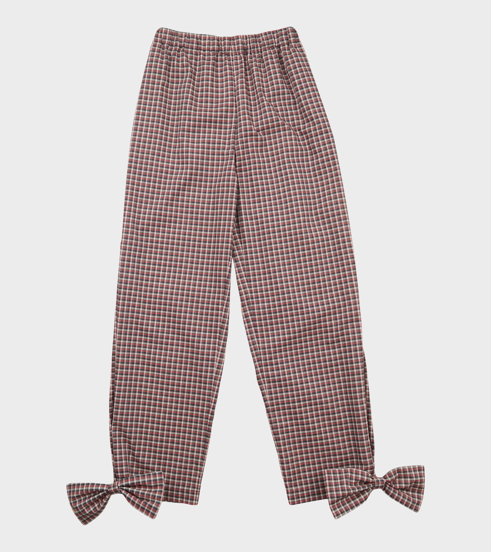 Ternet bukser fra Caro Editions. Bukserne har elastik i livet og sløjfe-detaljer i enderne.
