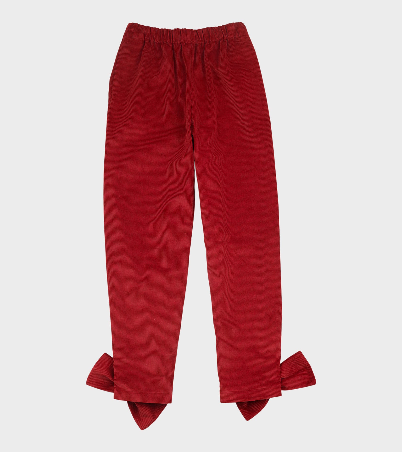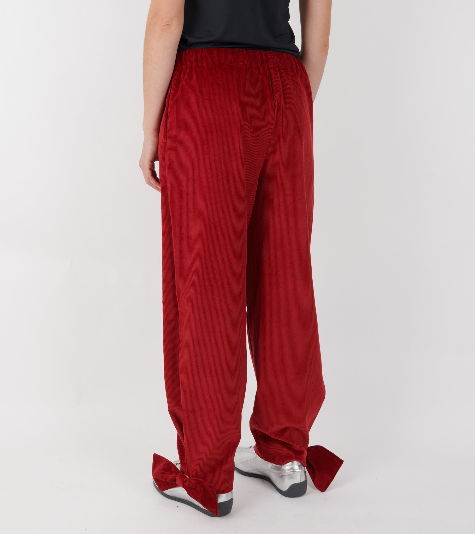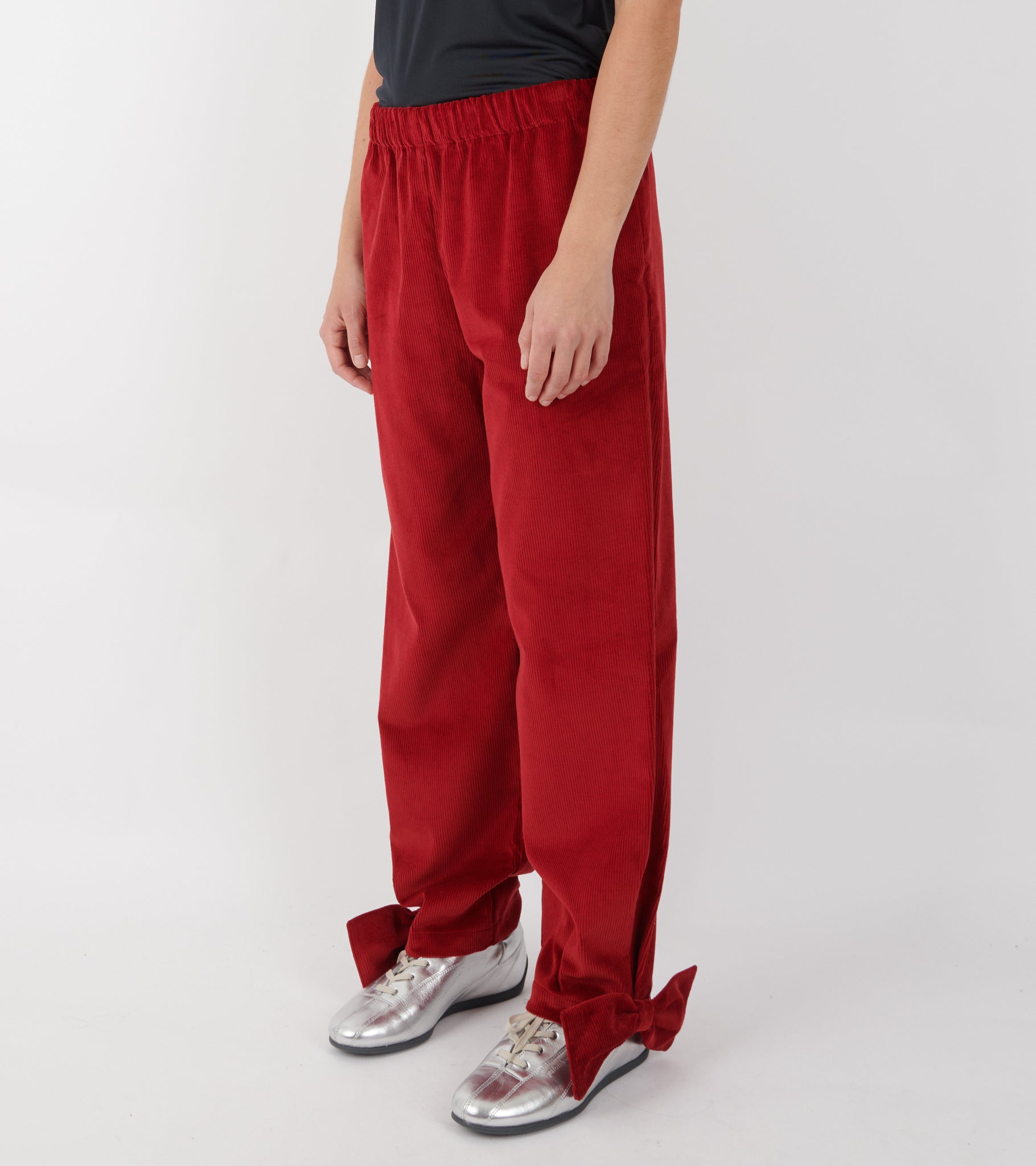 Røde fløjlsbukser fra Caro Editions. Bukserne har elastik i livet og sløjfe-detaljer i enderne.