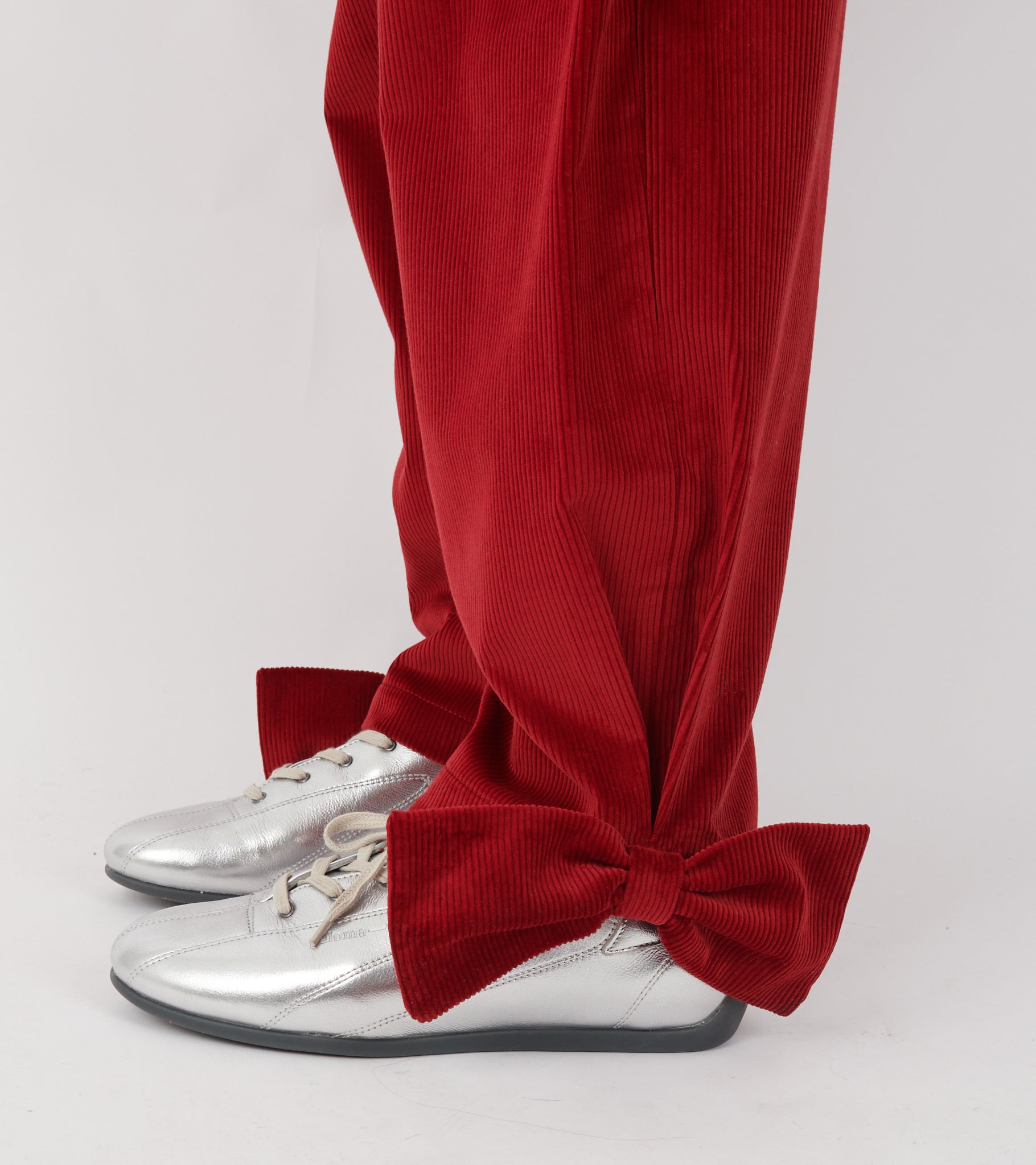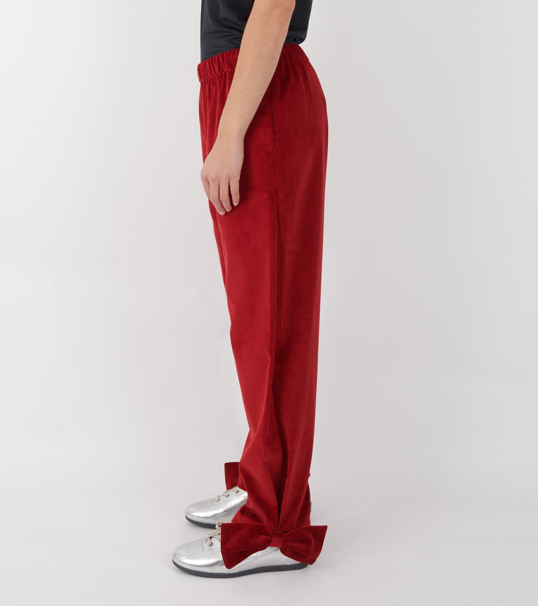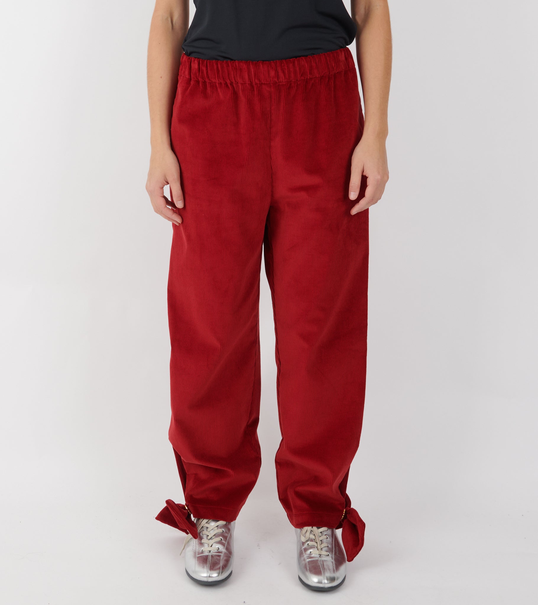 Røde fløjlsbukser fra Caro Editions. Bukserne har elastik i livet og sløjfe-detaljer i enderne.