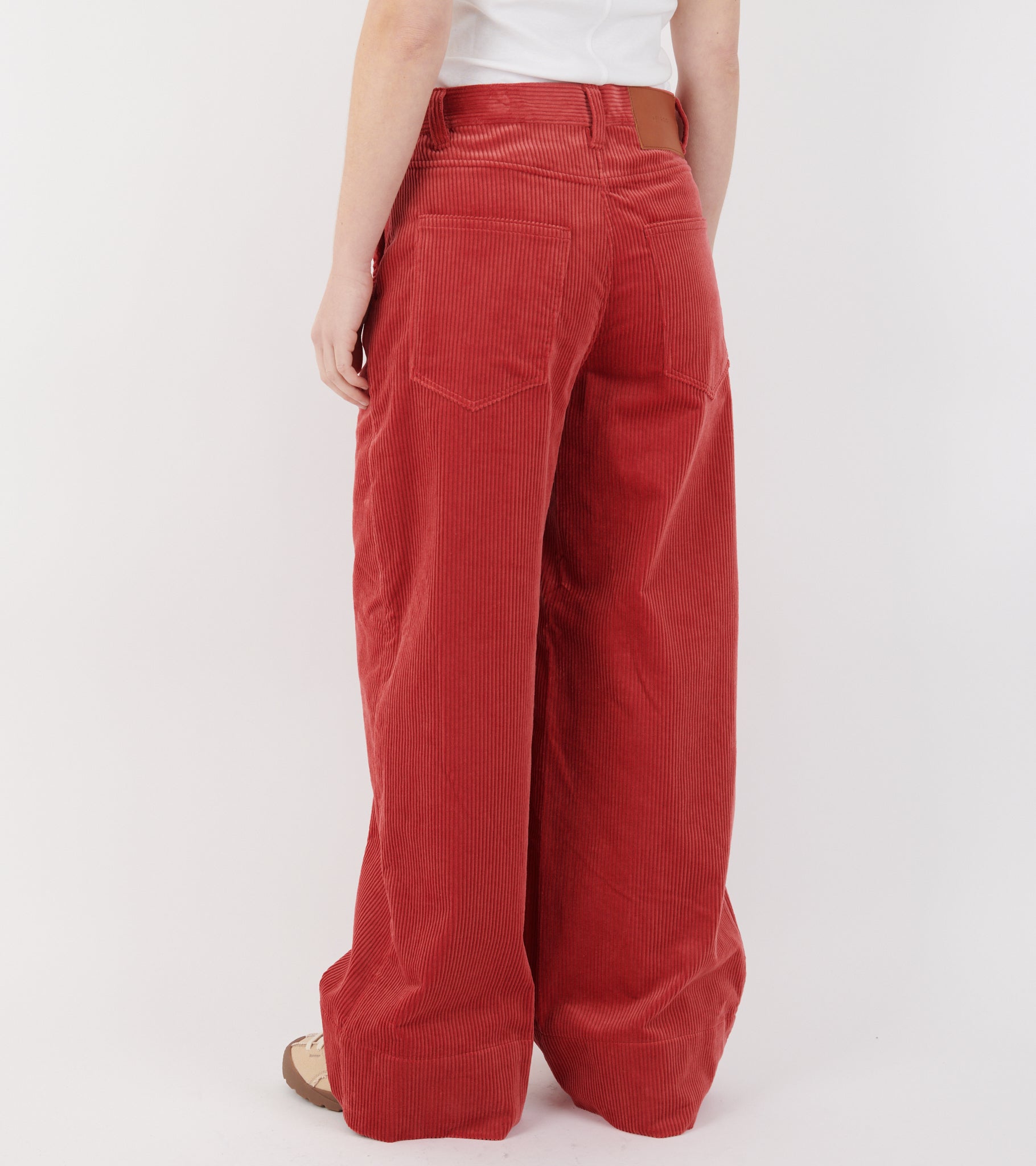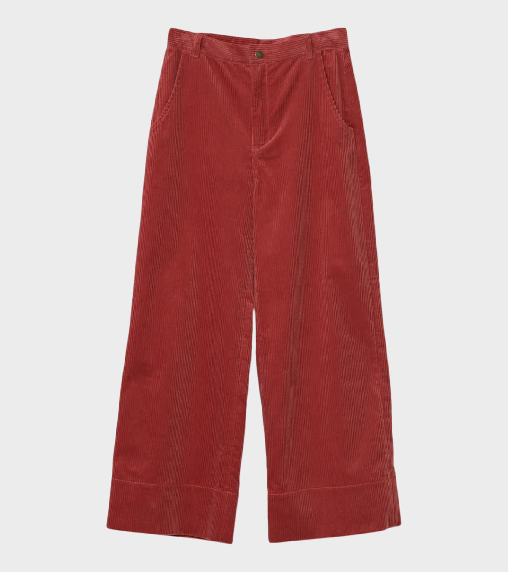 Fløjlsbukser med brede ben fra AF Agger. Bukserne er fremstillet i italiensk bomuldsfløjl og har bæltestropper, en skrålomme i hver side samt to baglommer. Øverst bagpå er et logotag i brunt læder.