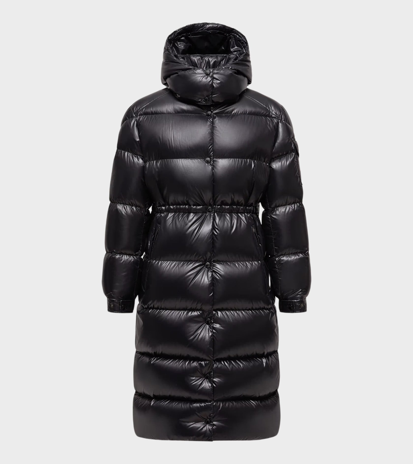 Lang sort dunjakke fra Moncler. Cavettaz Hooded Long Down Jacket Black er fremstillet i en 'glossy laqué' nylonkvalitet og er foret med bløde dun og fjer. Jakken har en aftagelig hætte, en lynlåslomme i hver side, en skjult lynlåslukning samt en trykknaplukning med sorte logo-trykknapper. I livet er en justerbar elastik. På venstre ærme er en lomme samt det ikoniske logo i filt.