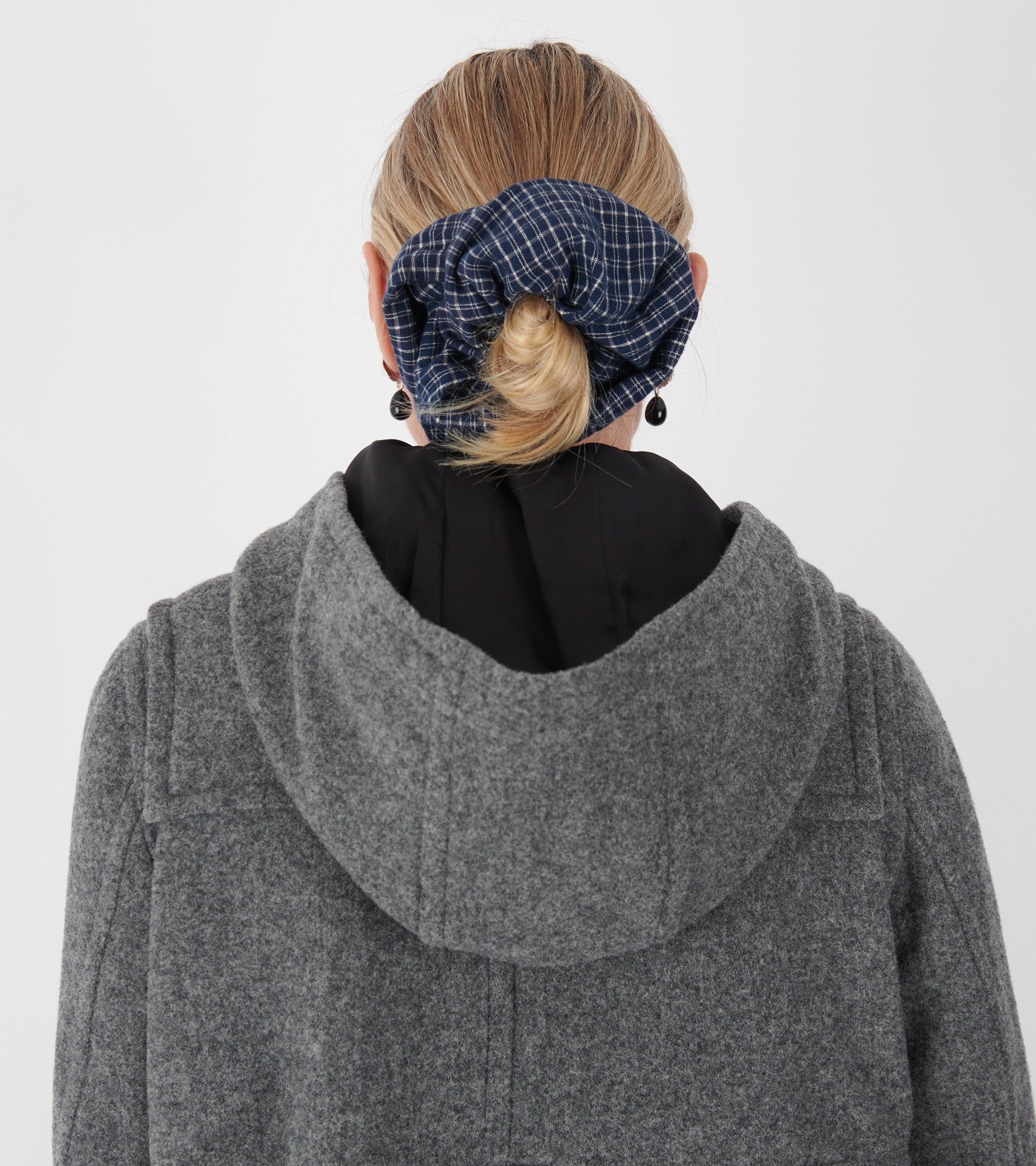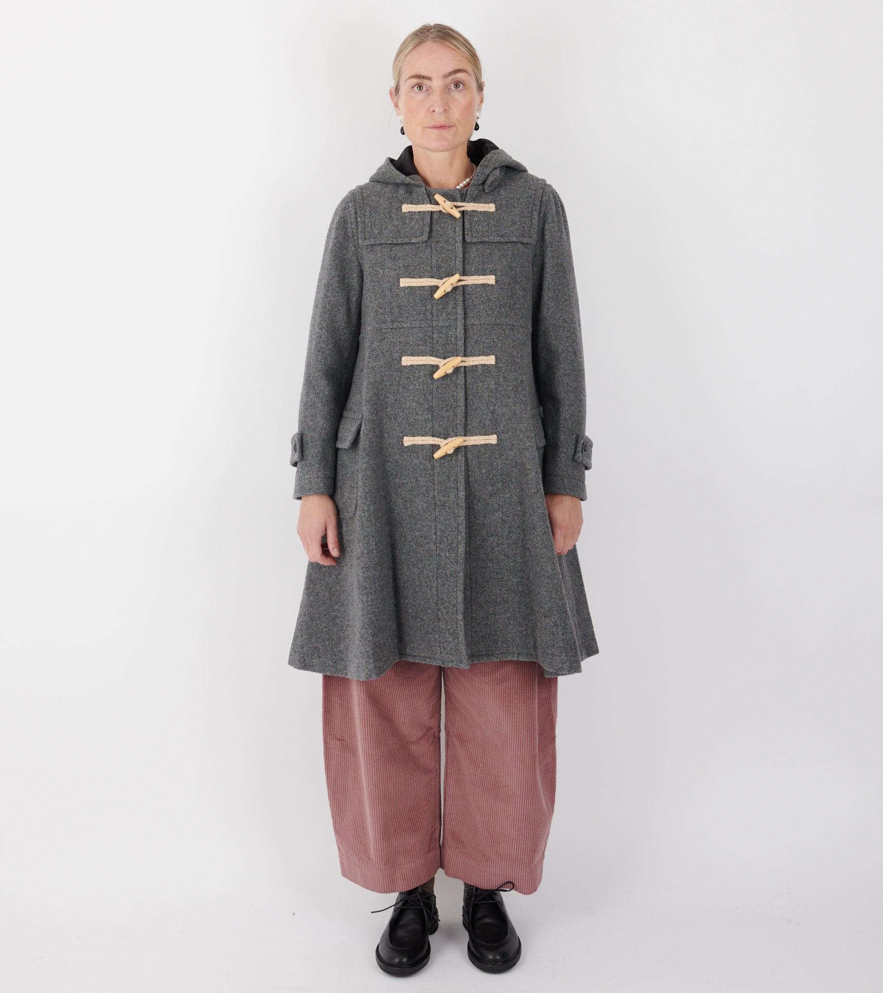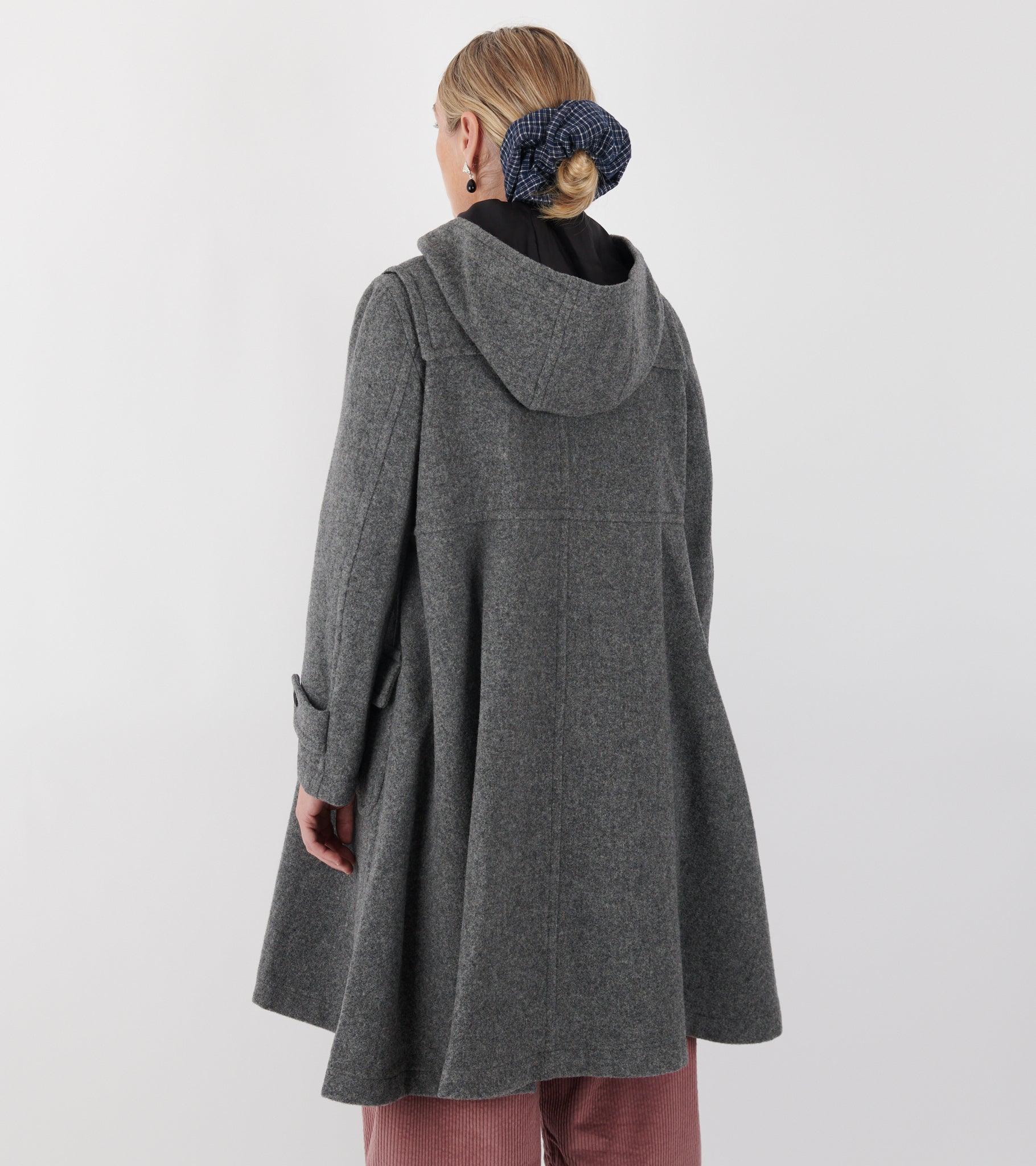 Grå frakke i uld fra Comme des Garcons Girl. Frakken har en hætte, to lommer og en knaplukning med lange knapper i træ på fronten.