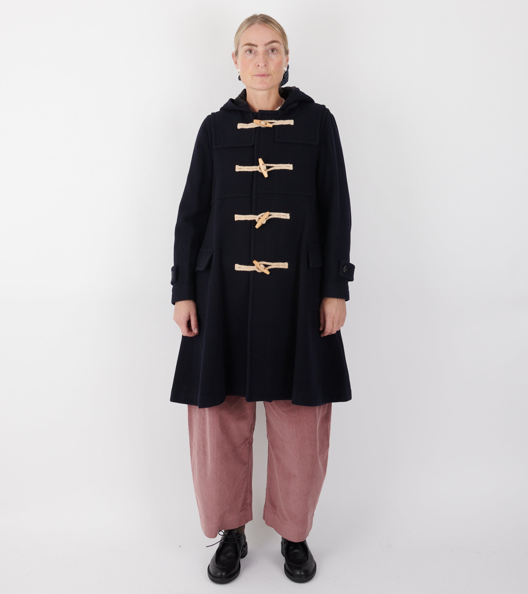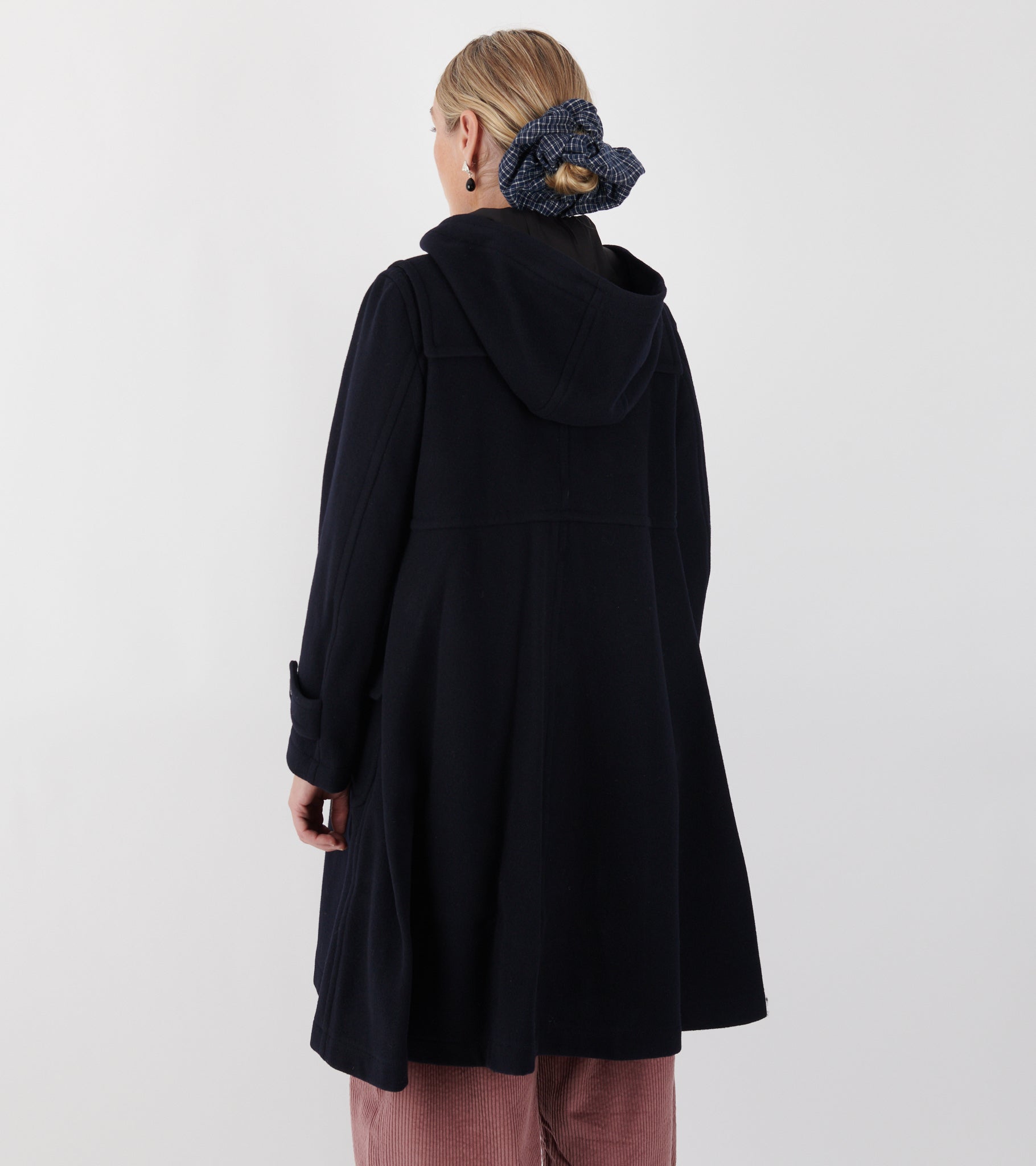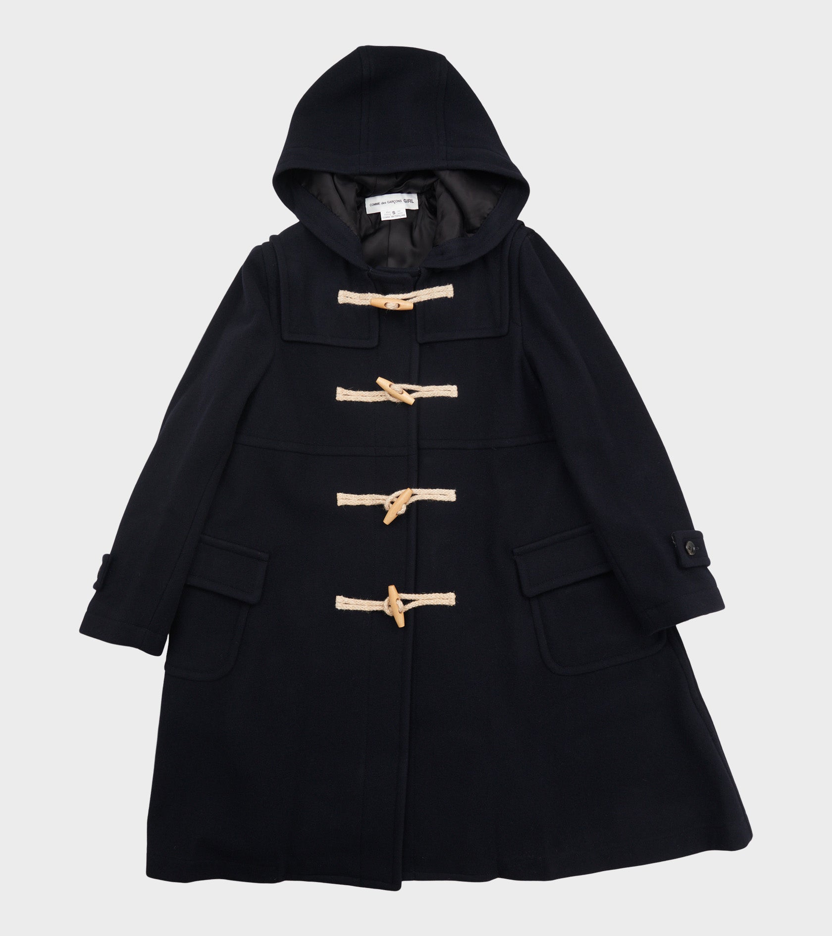 Navy frakke i uld fra Comme des Garcons Girl. Frakken har en hætte, to lommer og en knaplukning med lange knapper i træ på fronten.