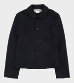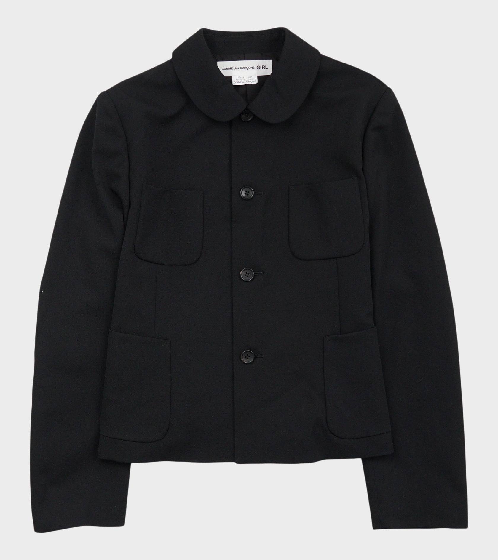 Sort blazer i uld fra Comme des Garcons Girl. Denne blazer har en rund krave, en knaplukning samt fire lommer på fronten.
