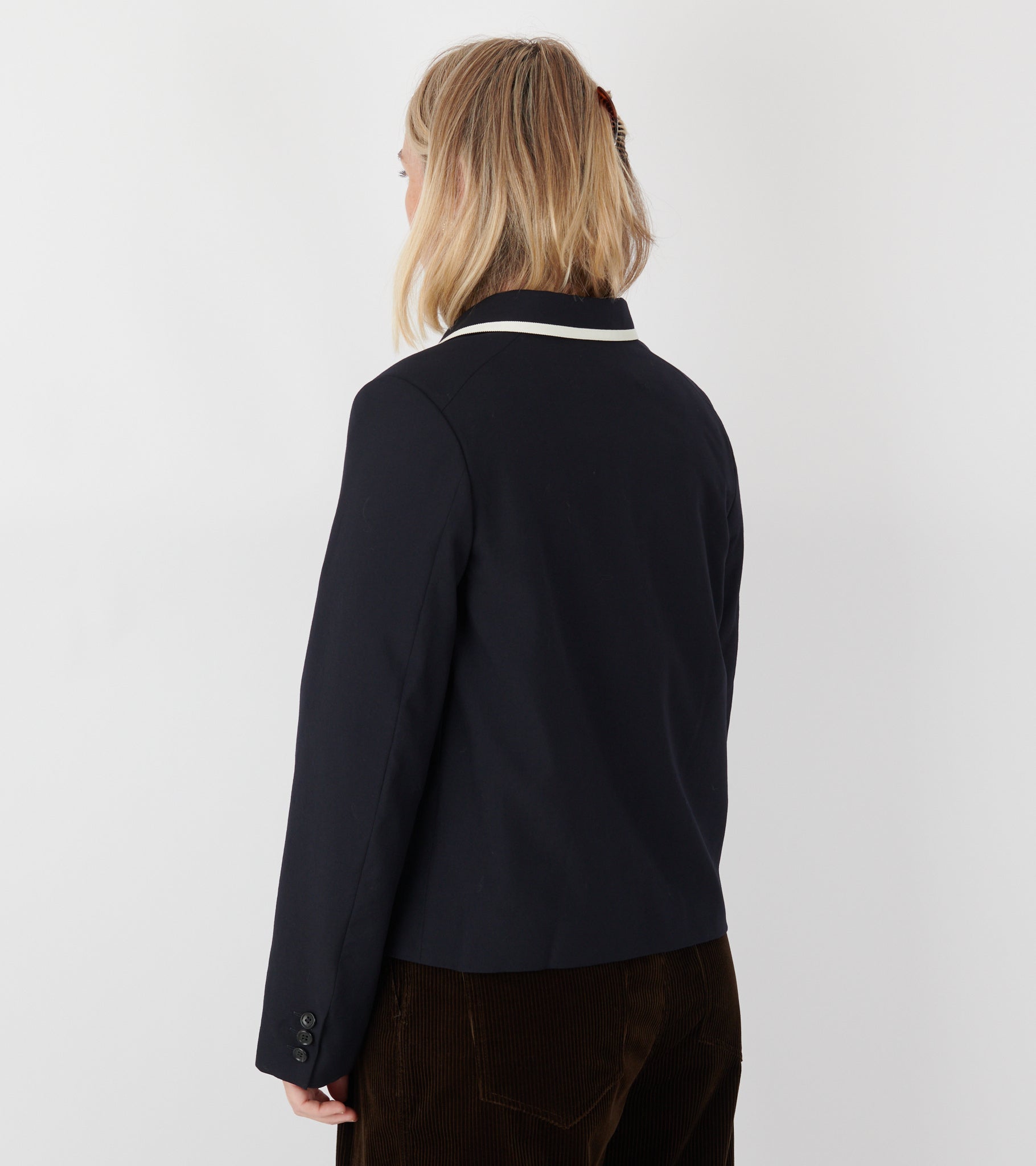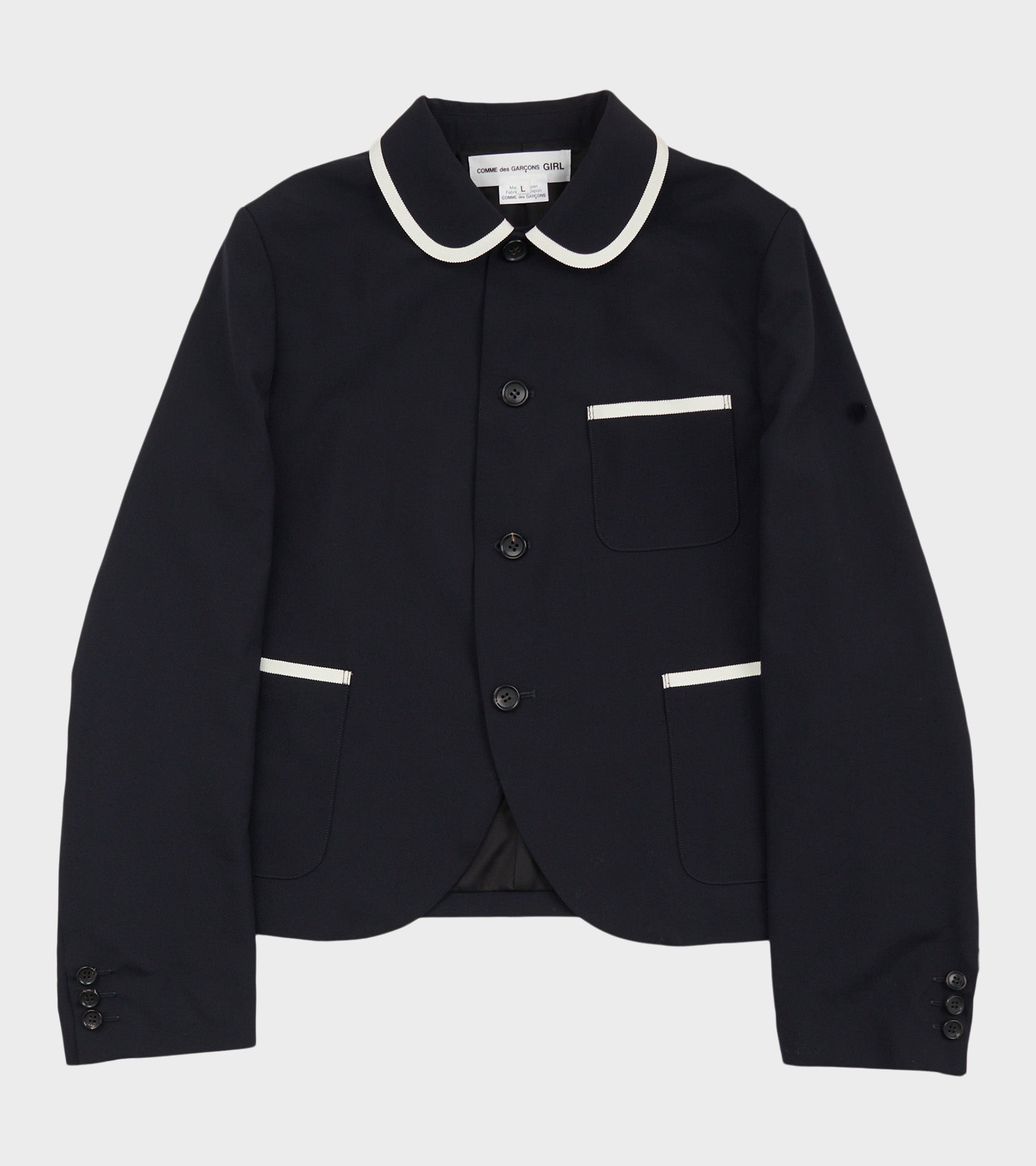 Navy blazer i uld fra Comme des Garcons Girl. Denne blazer har en rund krave, hvide kontrastkanter i polyester, en knaplukning på fronten, manchetknapper samt tre lommer på fronten.