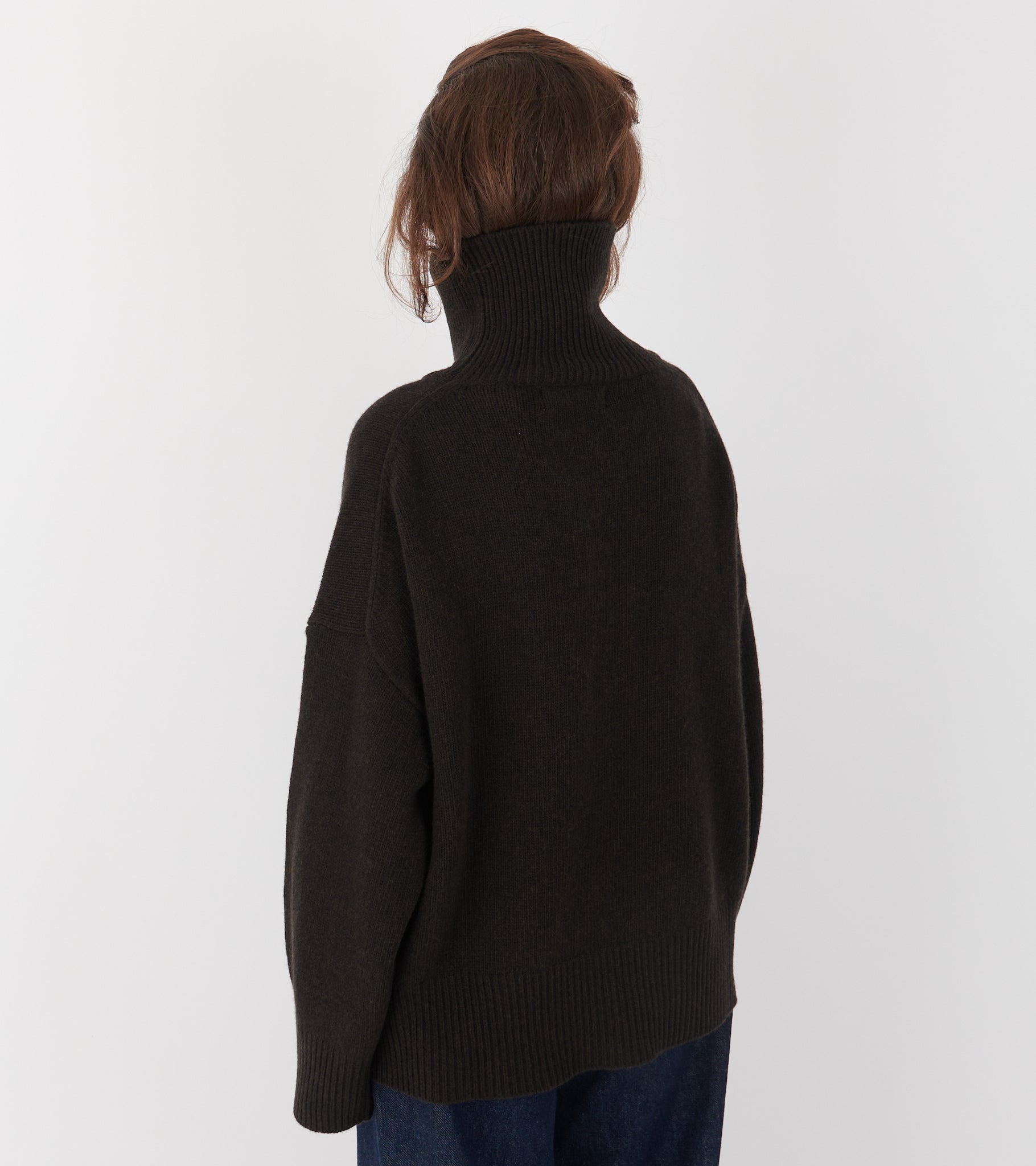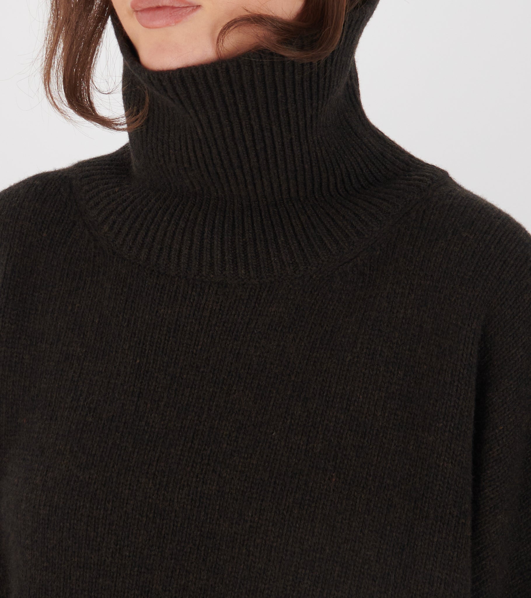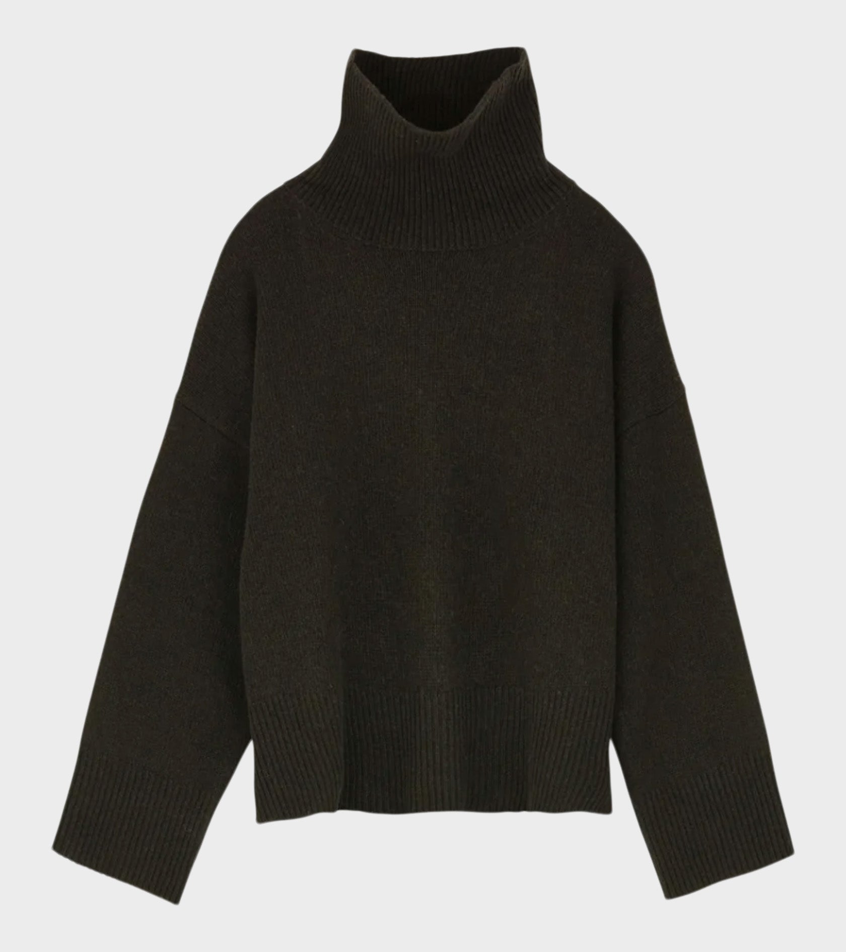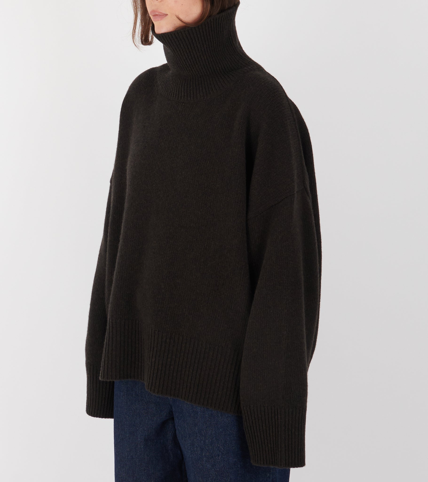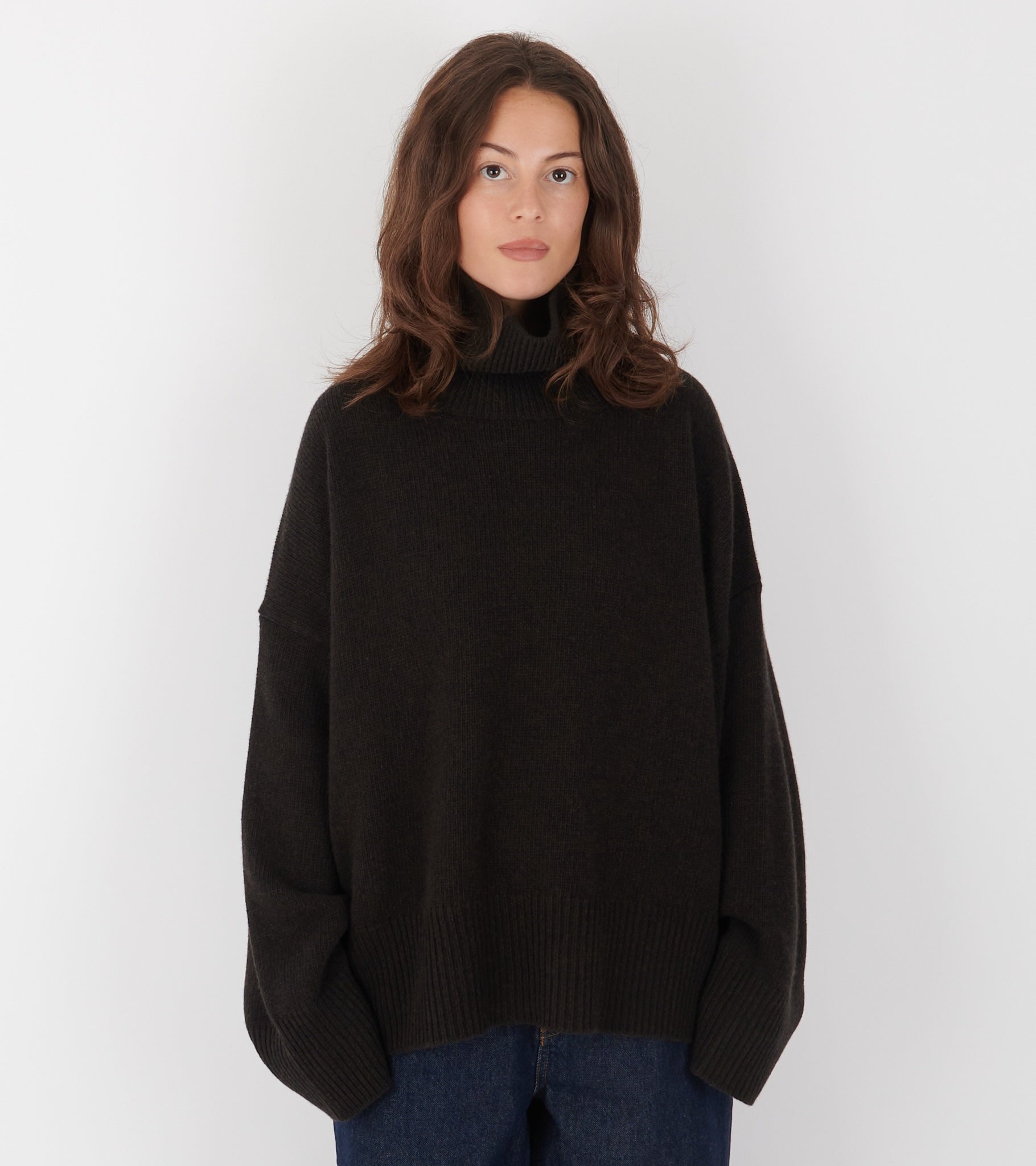 Mørkebrun strik i merinould fra Skall Studio. Silene T-neck har en høj hals, ribstrikkede kanter samt sænkede skuldre.