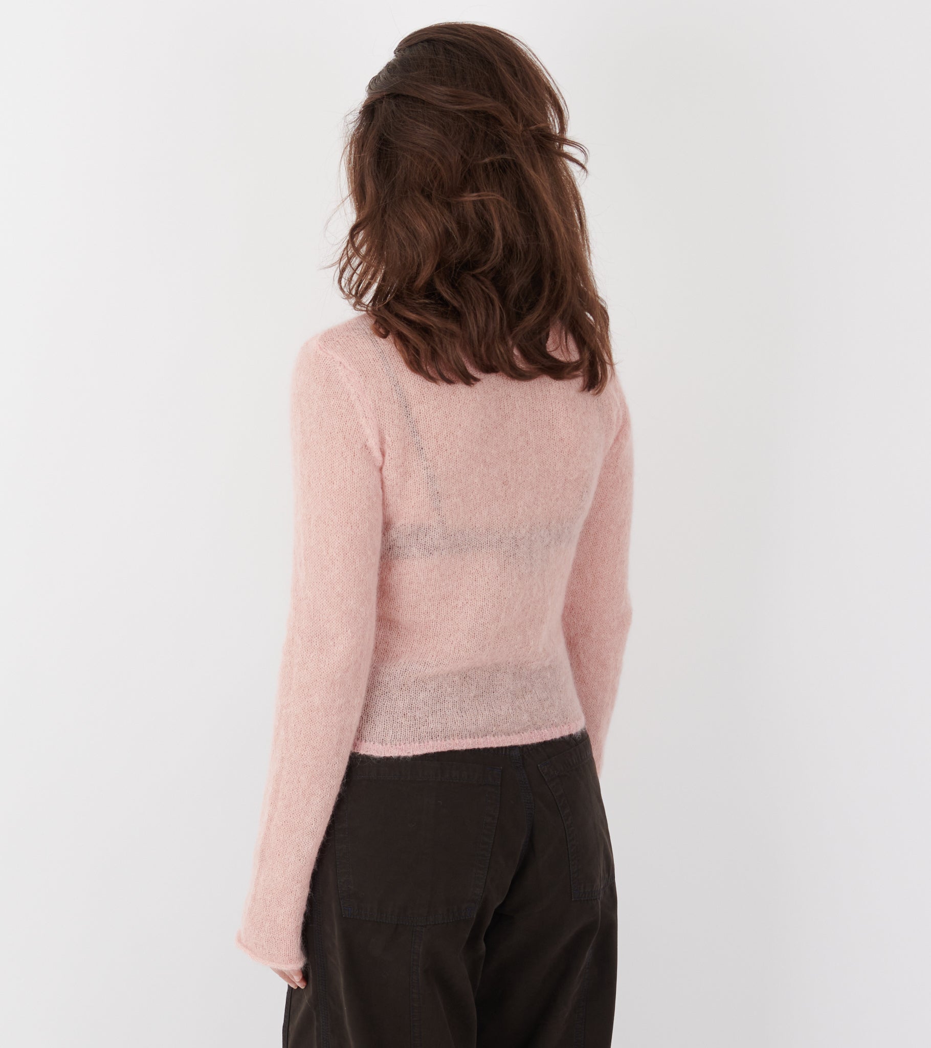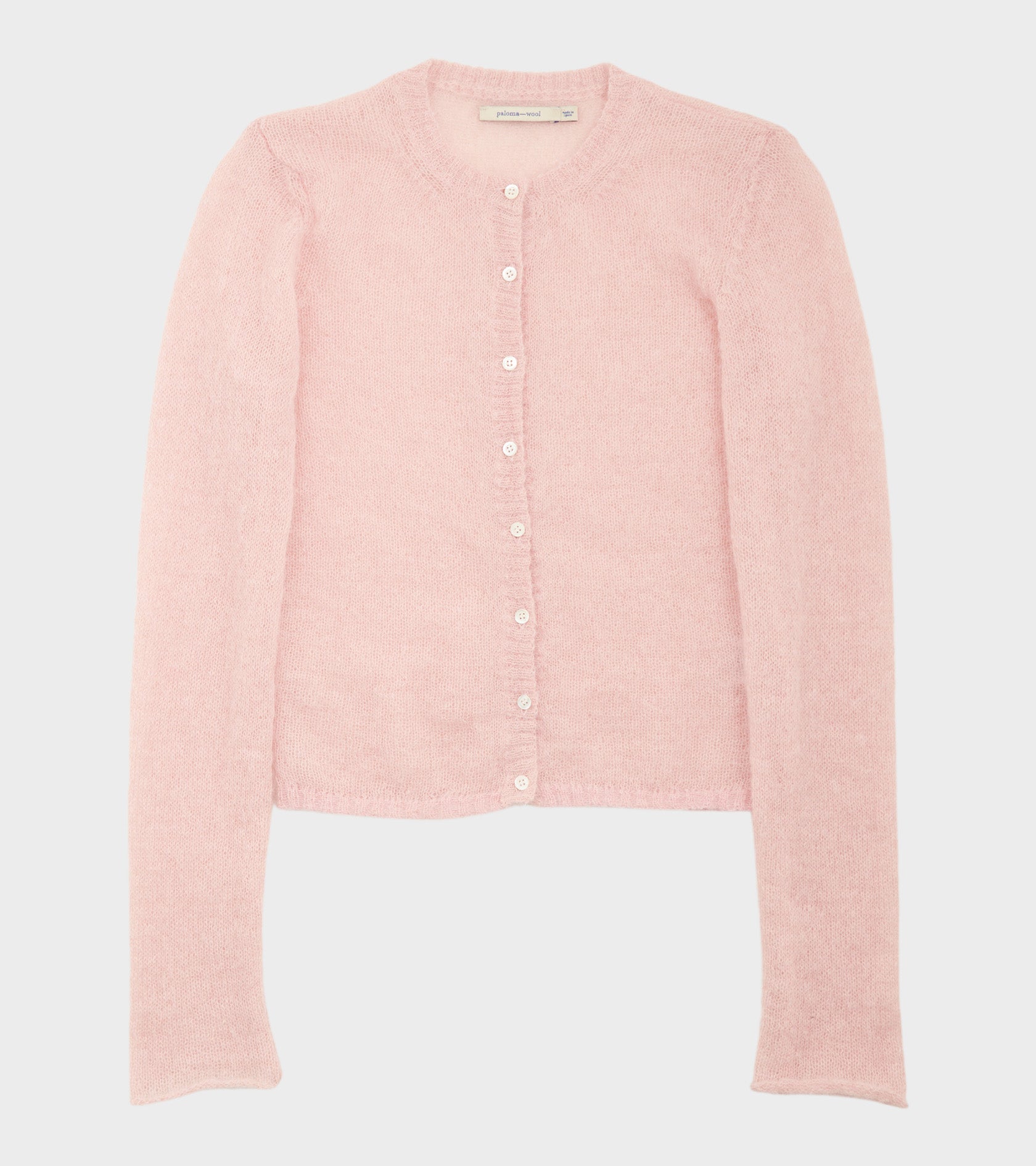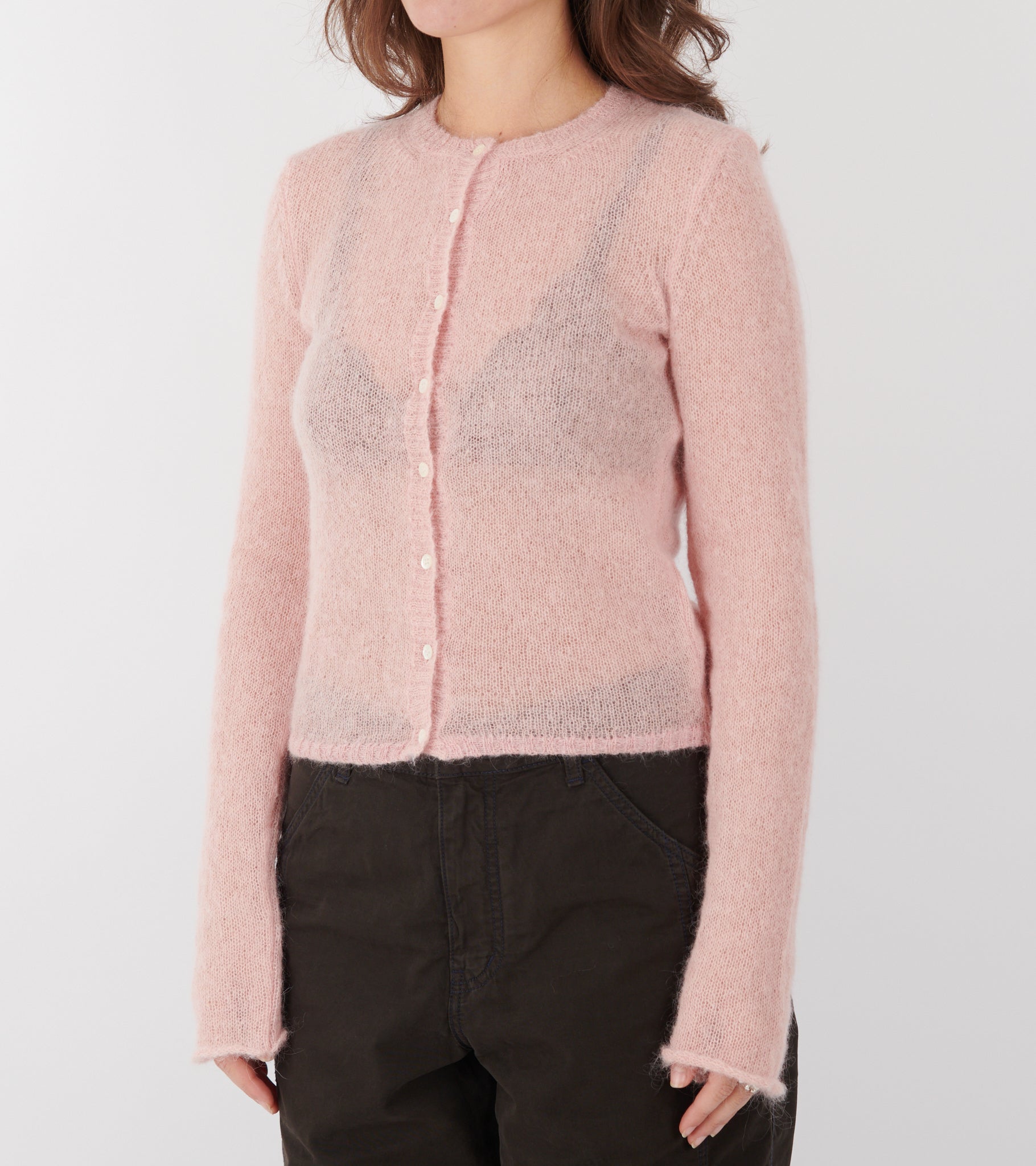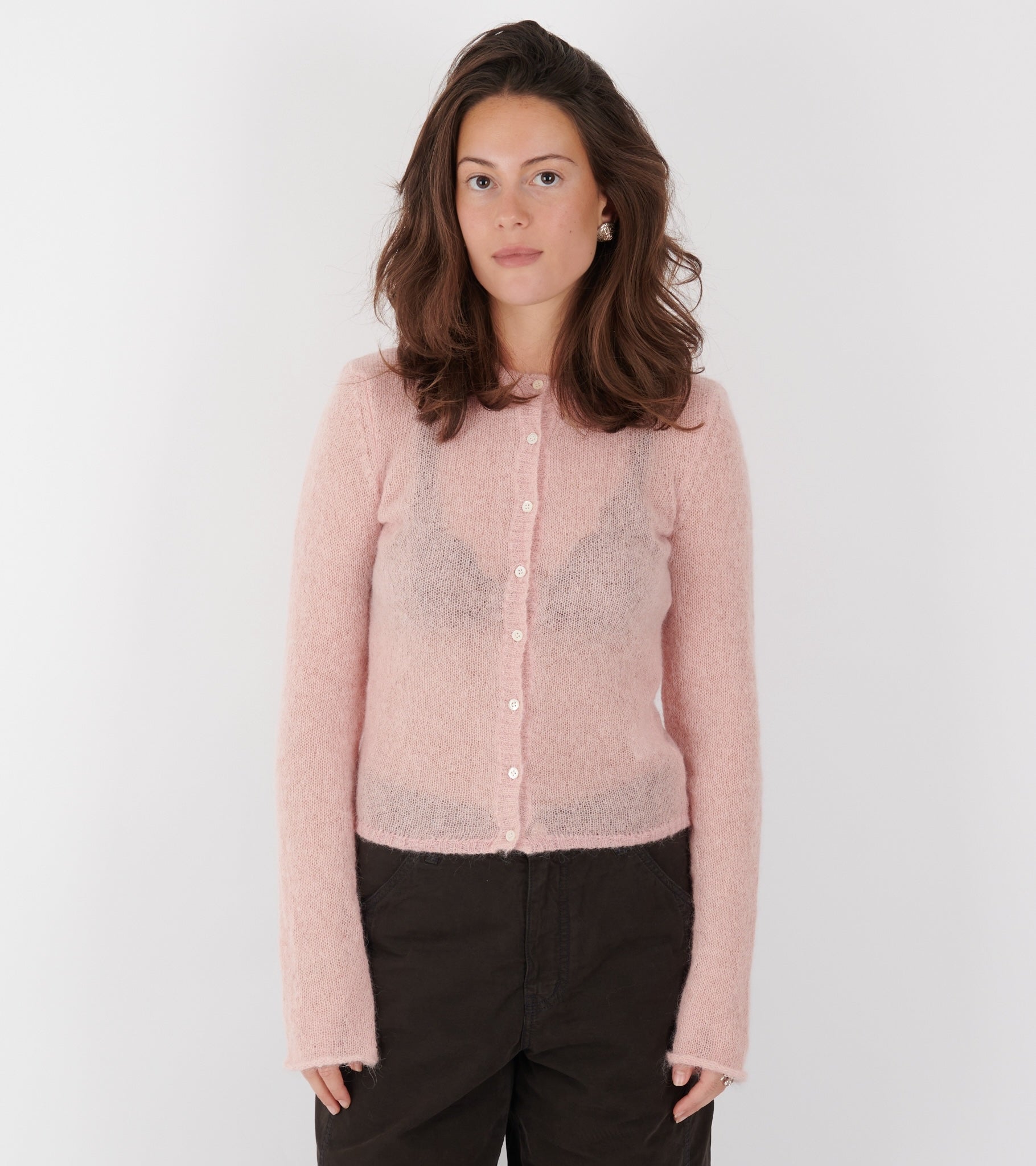 Lyserød cardigan fra Paloma Wool. Tantal Cardigan har en rund hals og en knaplukning med perlemorsknapper på fronten. Den er strikket i en løs strikkvalitet, bestående af mohair- og alpaka uld.