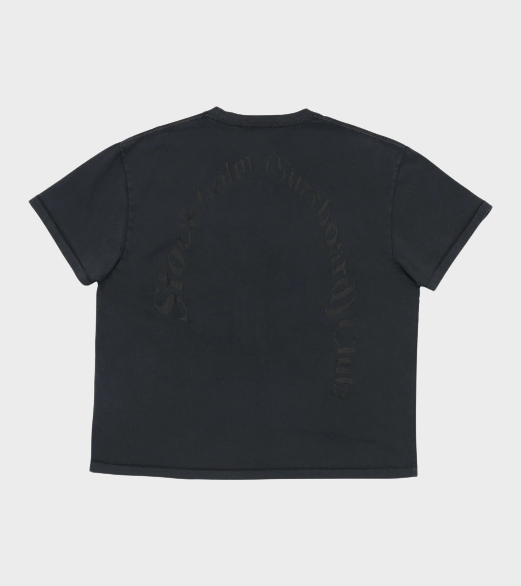 Sort garment dyed t-shirt i genanvendt bomuld fra Stockholm (Surfboard) Club. T-shirten har logoprint på ryggen.