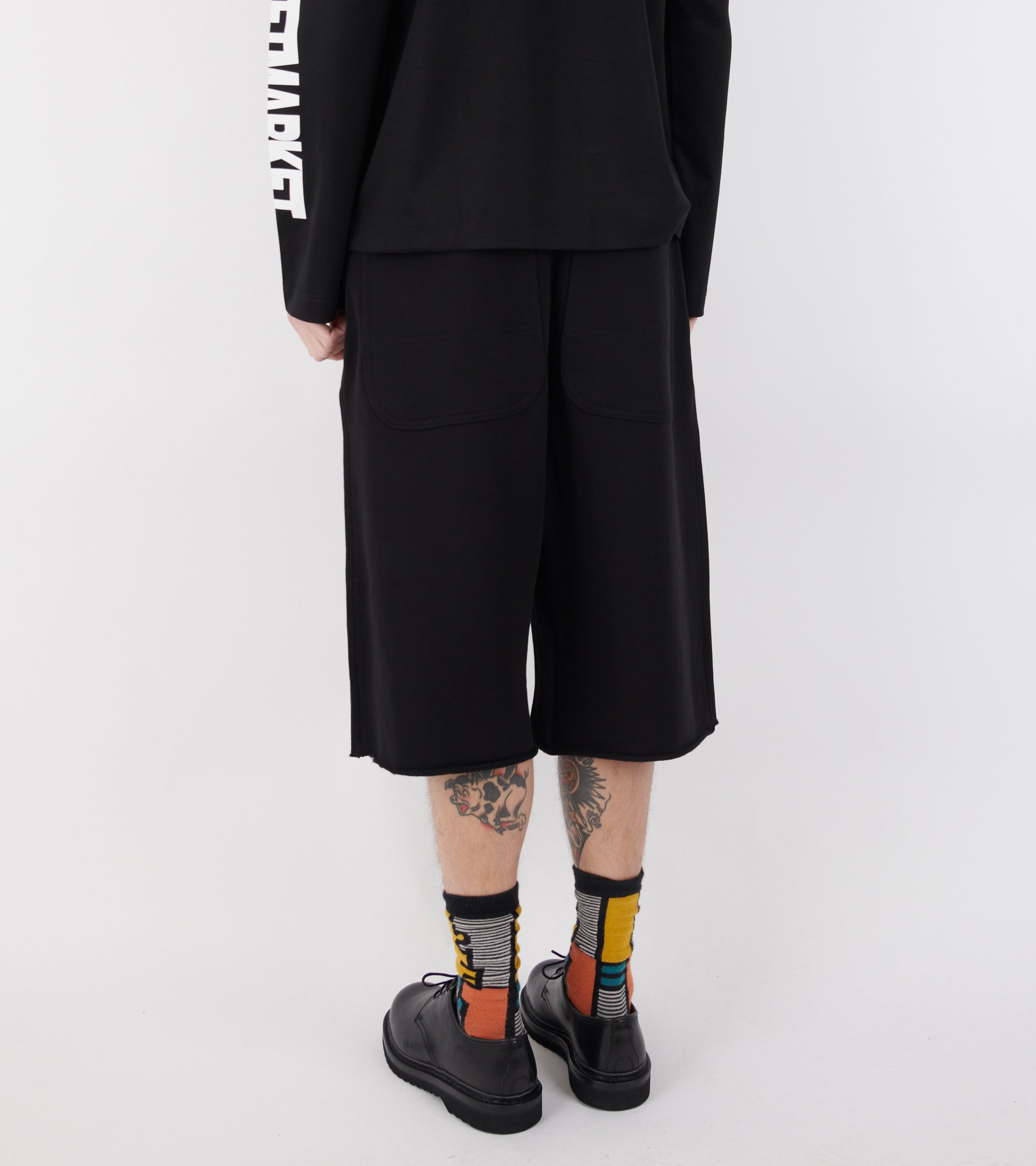 Sorte unisex shorts i bomuldssweat fra Dover Street Market Kei Ninomiya. Shortsene har bæltestropper, et bindebånd i livet, læg øverst på fronten, rå kanter i bunden, en skrålomme i hver side samt to baglommer. Nederst på venstre ben er et sort Dover Street Market logotag.