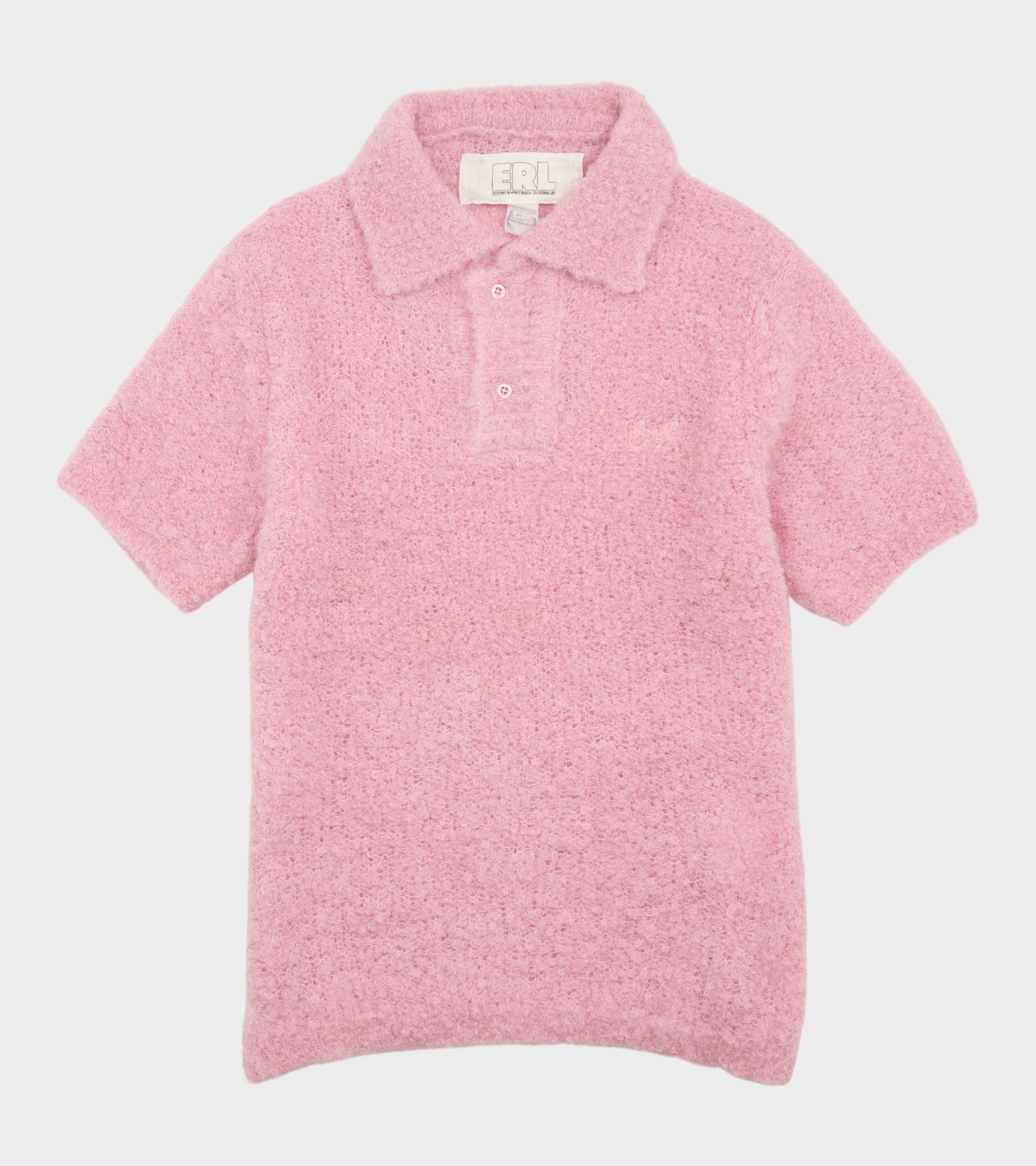 Lyserød kortærmet polo i en blød og krøllet alpaka-uldblanding fra ERL. Poloen har en klassisk krave og en knaplukning med to knapper. Ved venstre bryst er et lyserødt broderet logo.