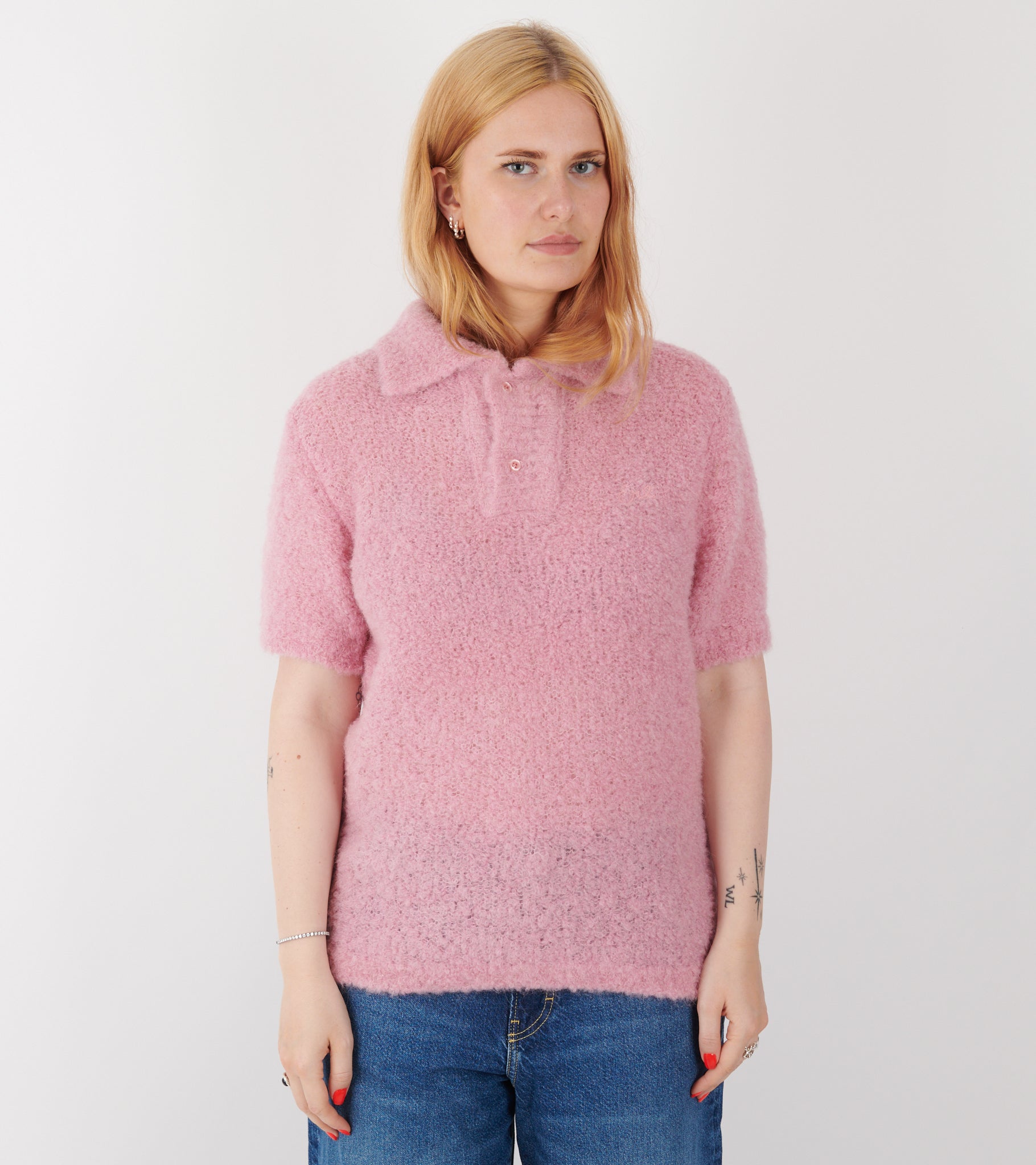 Lyserød kortærmet polo i en blød og krøllet alpaka-uldblanding fra ERL.