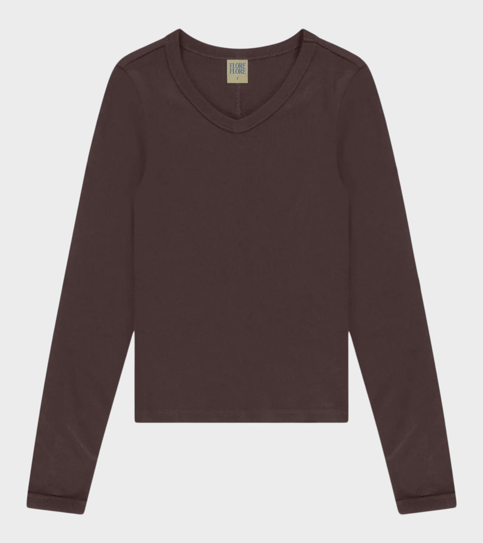 Langærmet bluse i en mørk plum/brun nuance fra Flore Flore. Jill Longsleeve er fremstillet i en 'medium weight' økologisk bomuldskvalitet og har en lille v-udskæring.