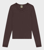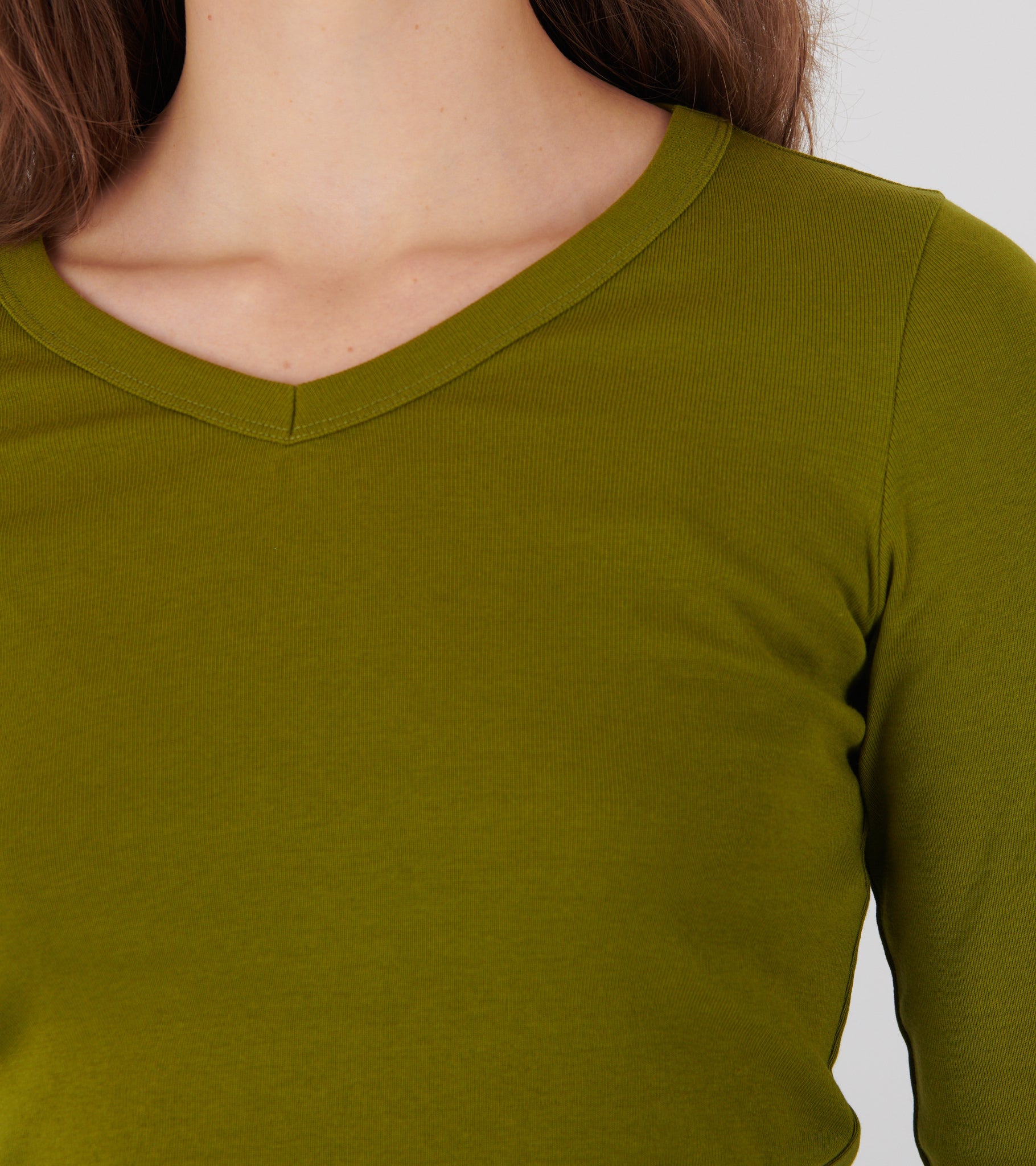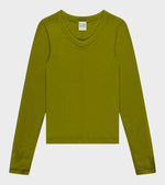 Langærmet grøn bluse fra Flore Flore. Jill Longsleeve er fremstillet i en 'medium weight' økologisk bomuldskvalitet og har en lille v-udskæring.