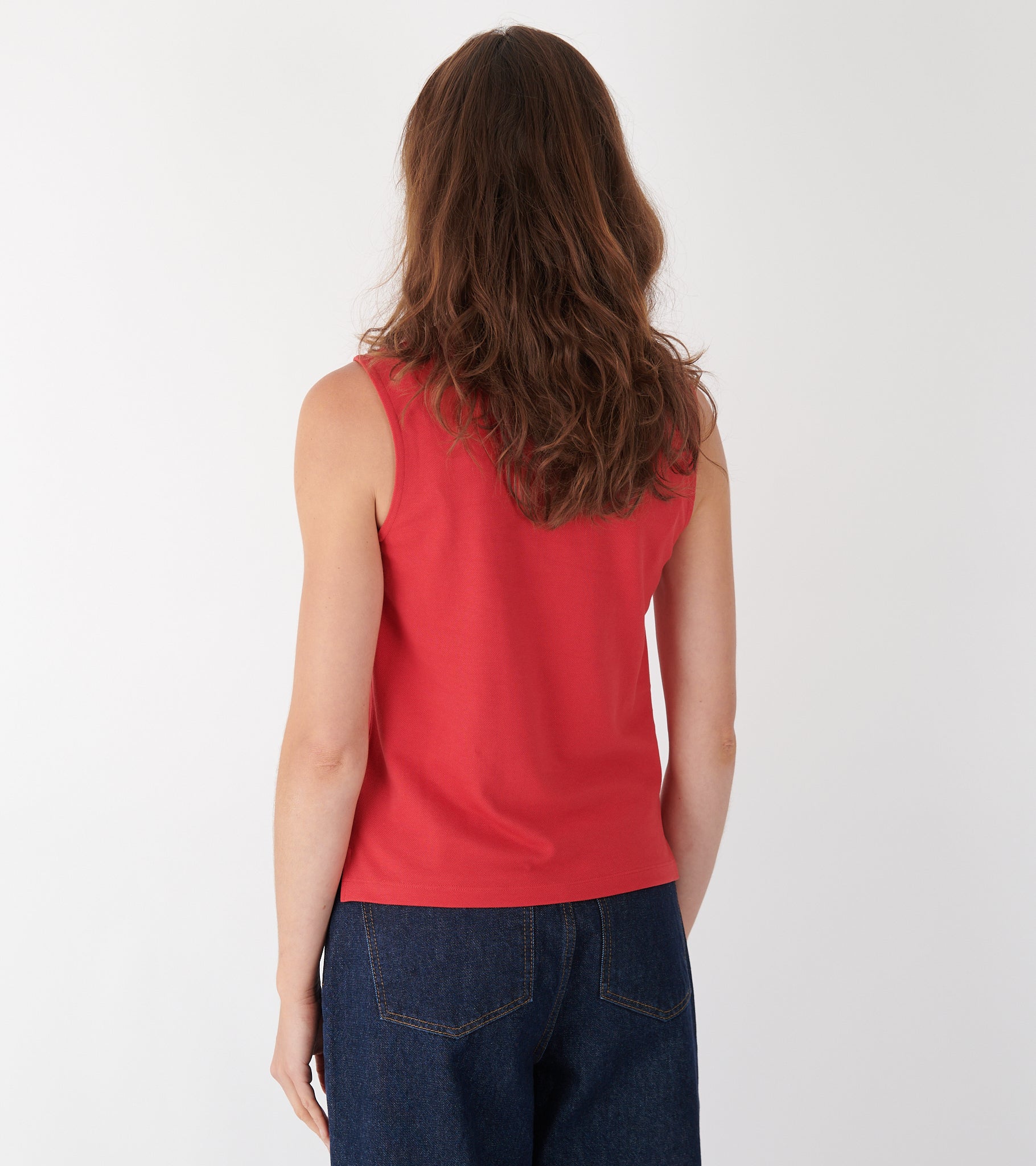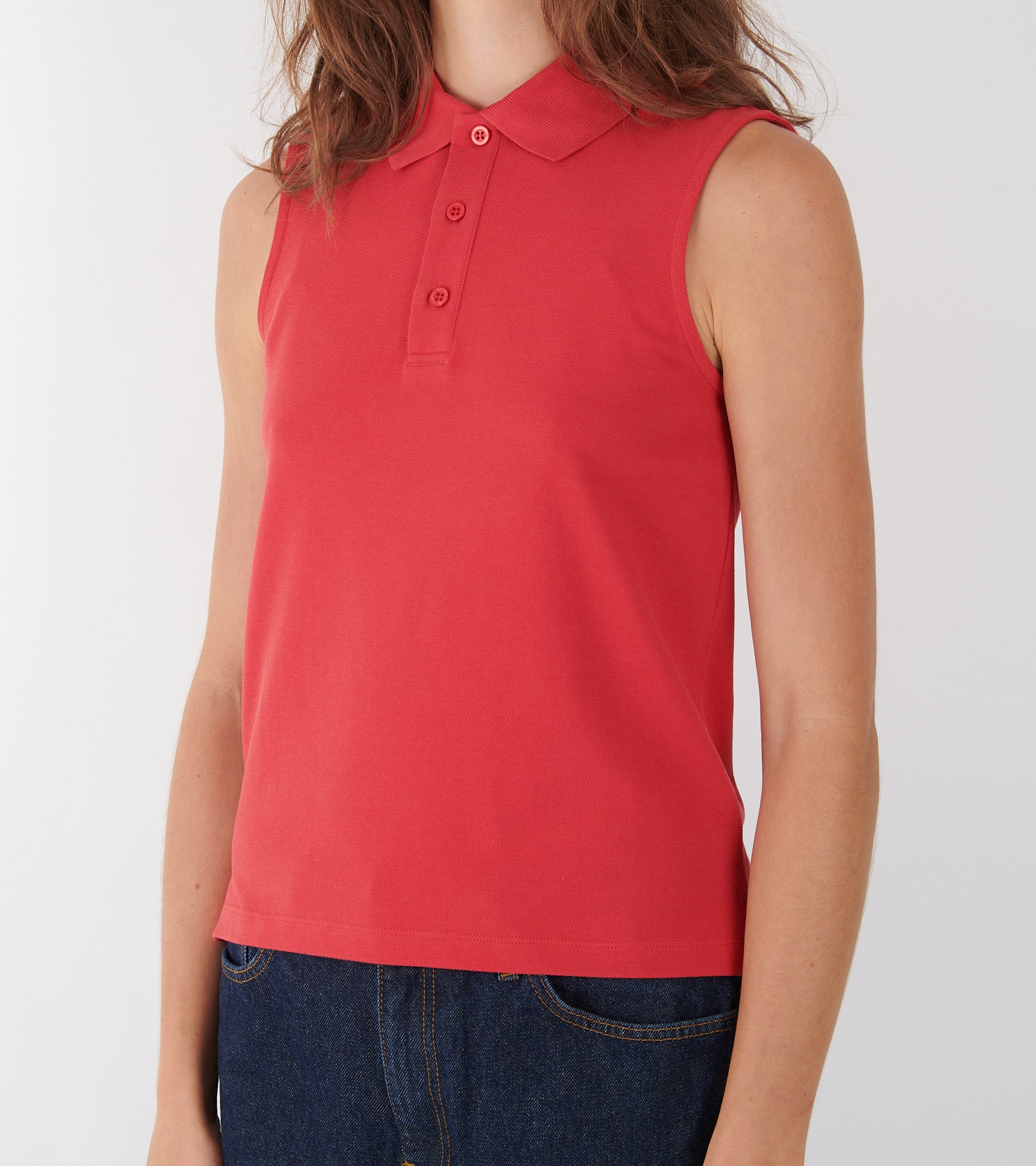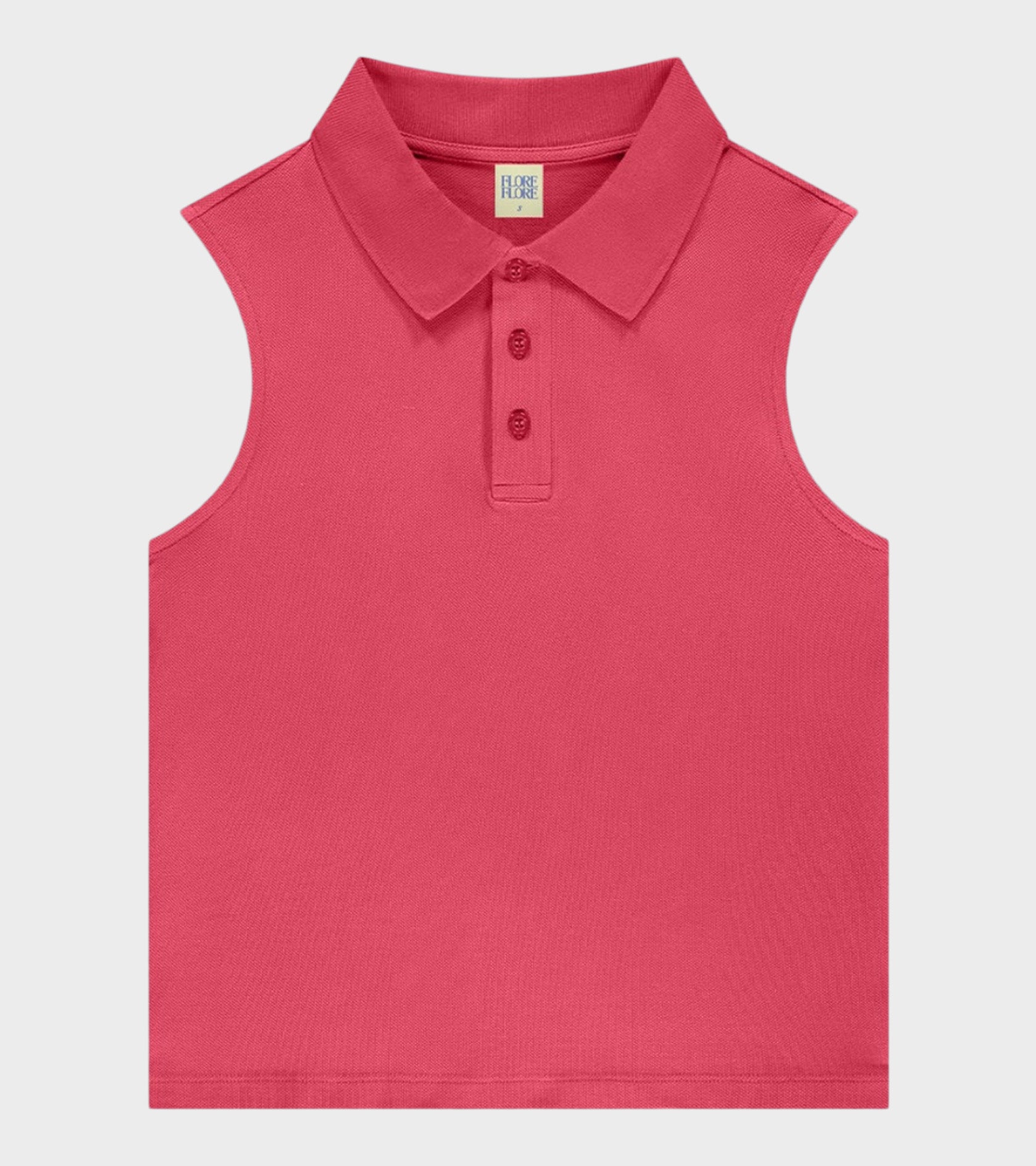 Polo uden ærmer fra Flore Flore. Lauren Polo er fremstillet i økologisk bomuldspiqué og har en klassisk polo-krave samt en knaplukning med tre knapper perlemorsknapper.