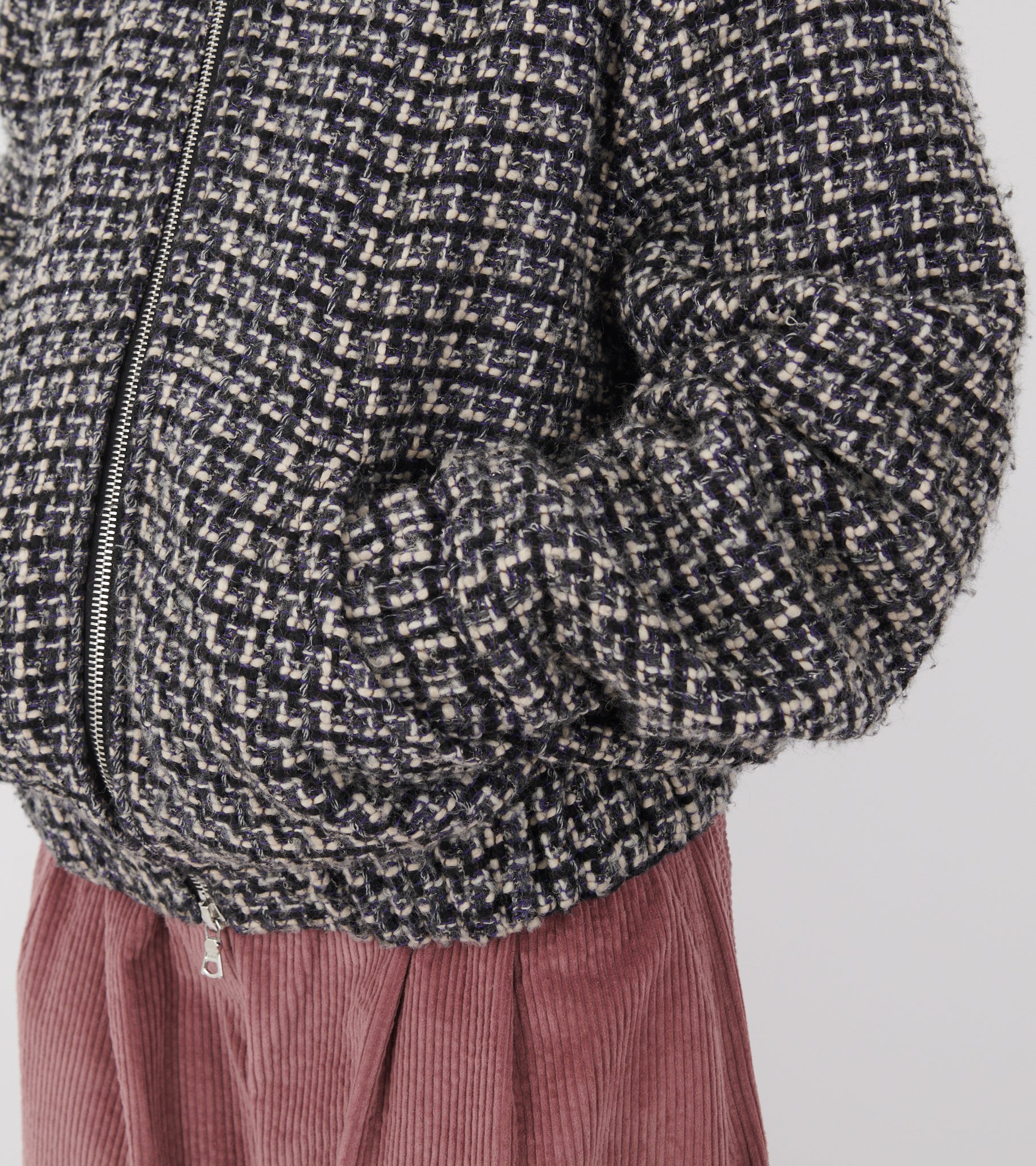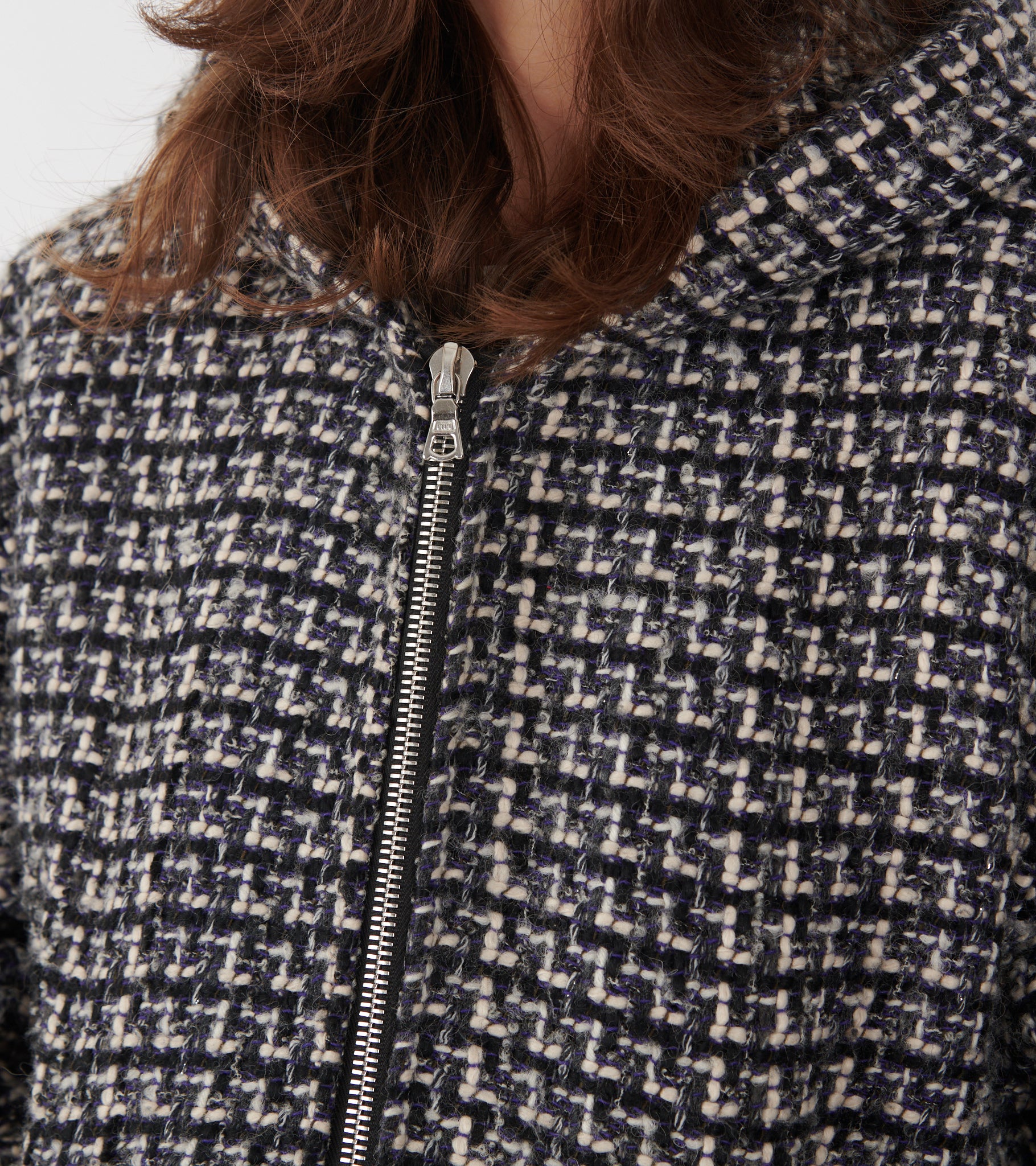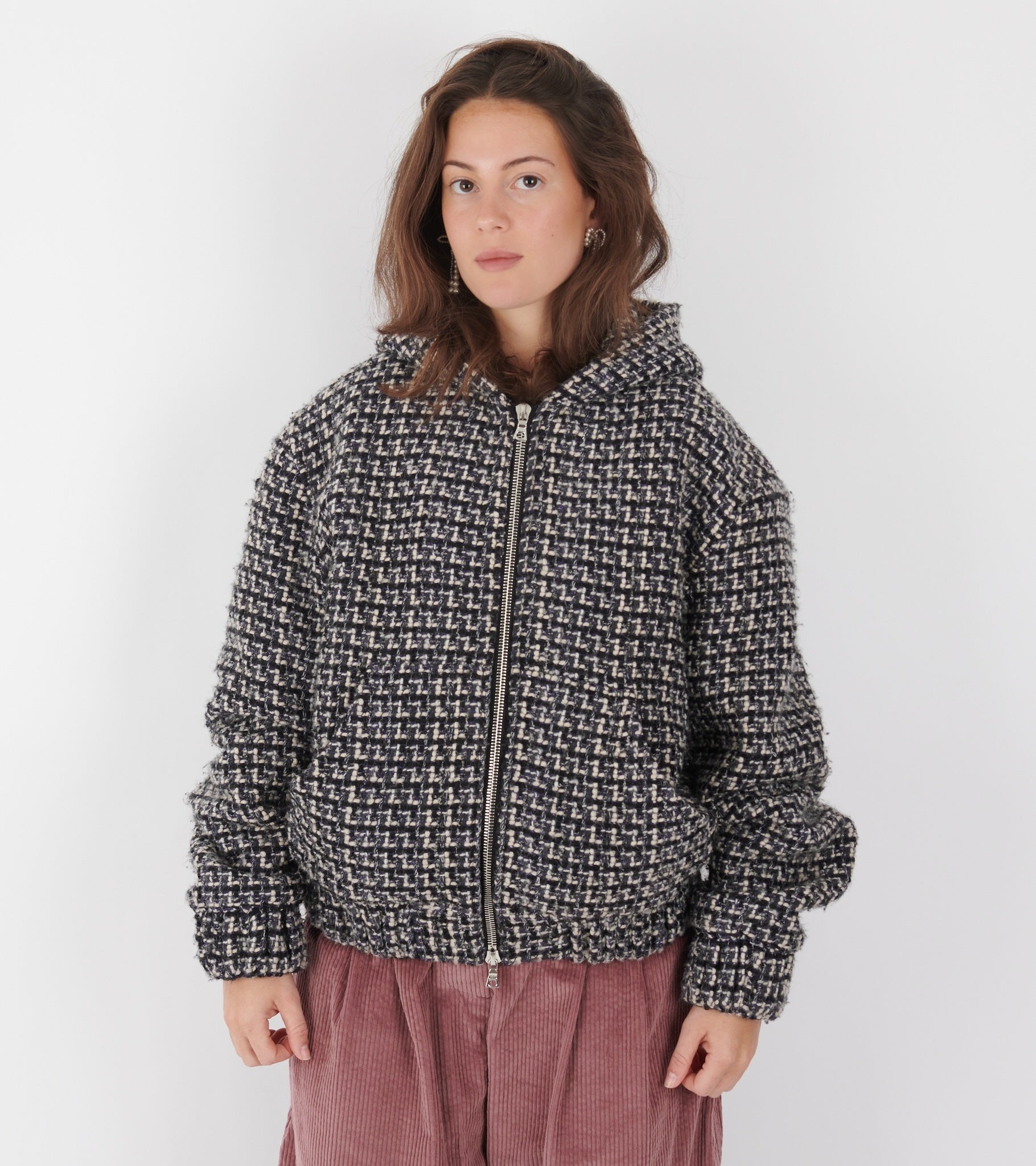 Jakke i en deadstock Chanel bouclé uldkvalitet fra Gabi Gamél. Jakken har en hætte, en sølv dobbeltgående lynlåslukning og en skrålomme i hver side. Jakken er i sort, råhvid og lilla nuancer.