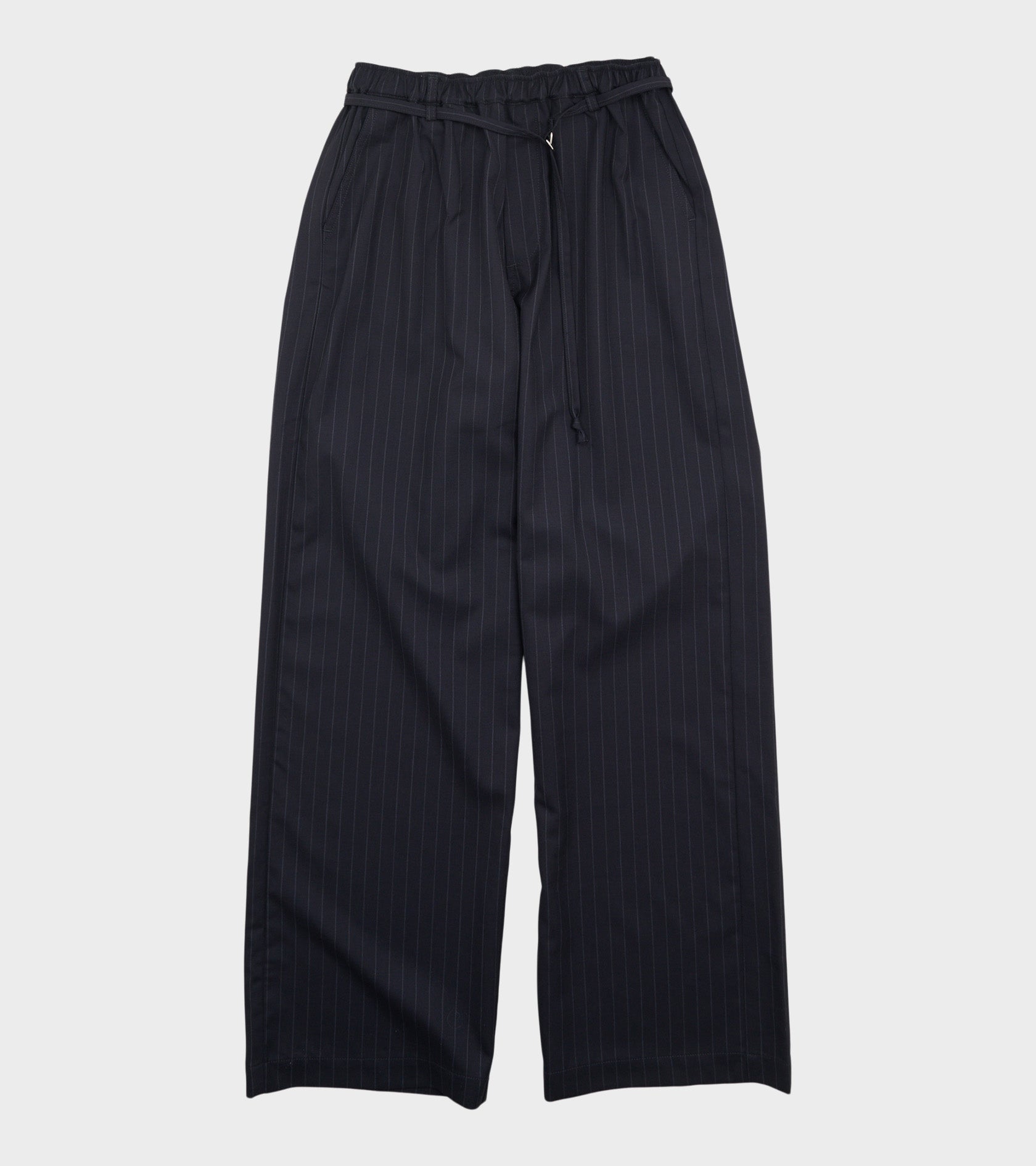 Navy bukser med pinstripes fra gentag. Ingrid Pant Navy Pinstripe er fremstillet i en uldblanding og har et matchende aftageligt bælte med et lille sølv-spænde i livet. Bukserne er fremstillet af reststof.