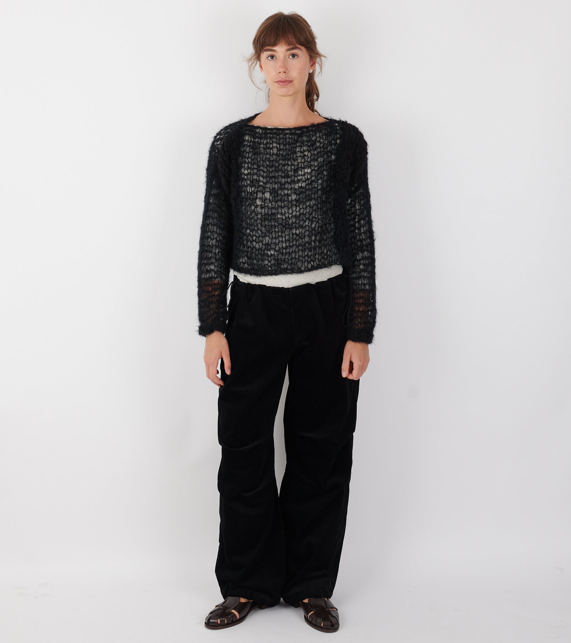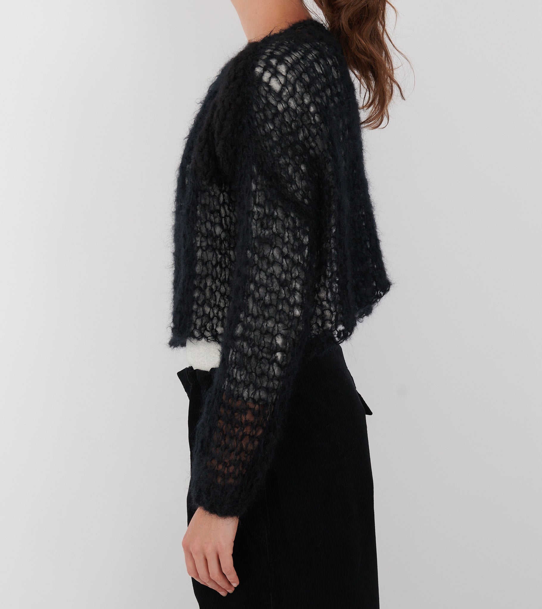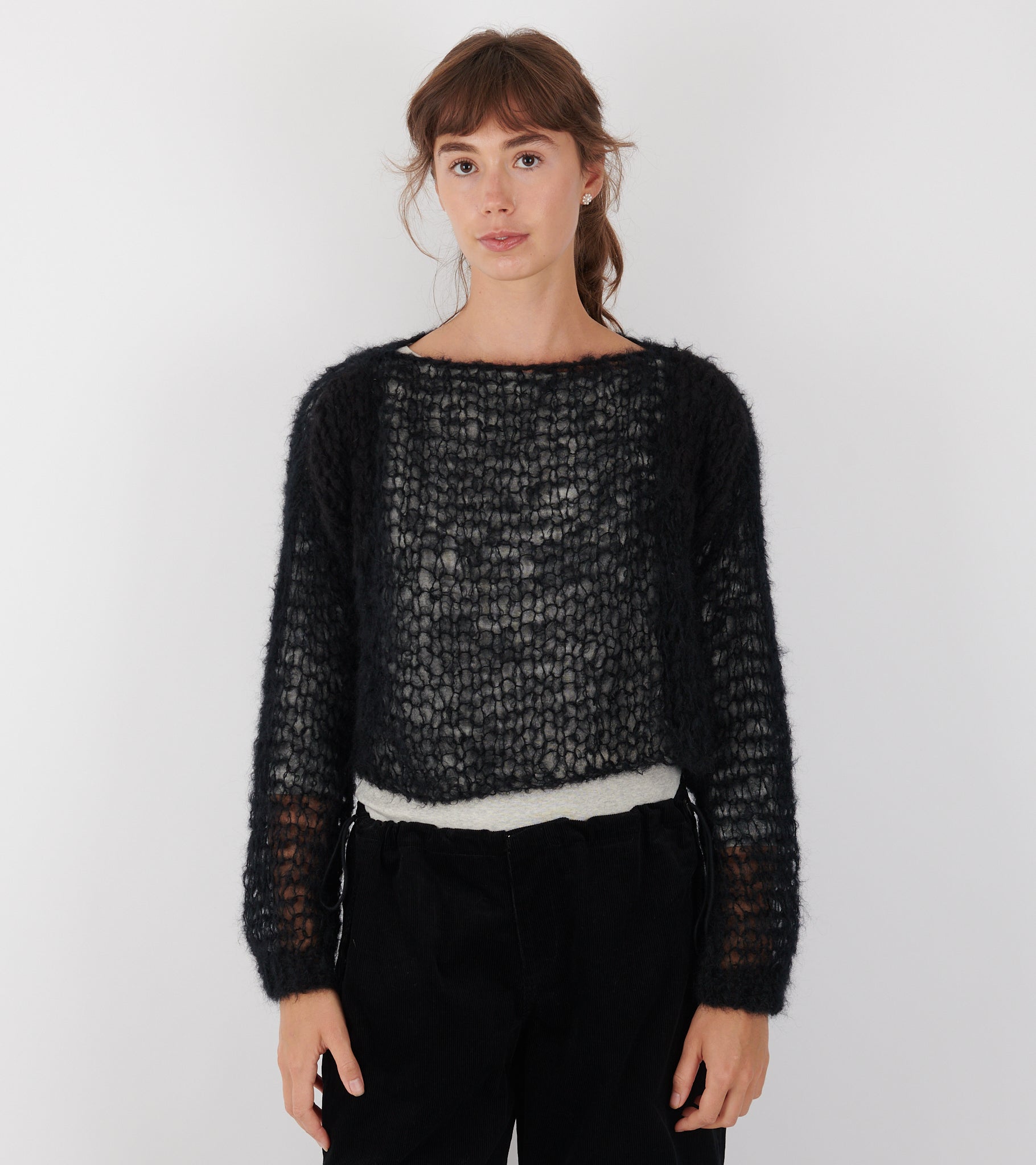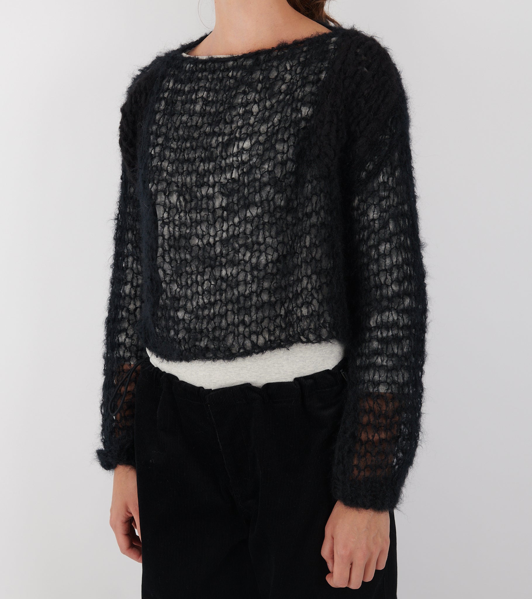 Sort håndstrikket strik fra Gudrun & Gudrun. Bohema Sweater er løst strikket i en mohair- og alpaka uldblanding.