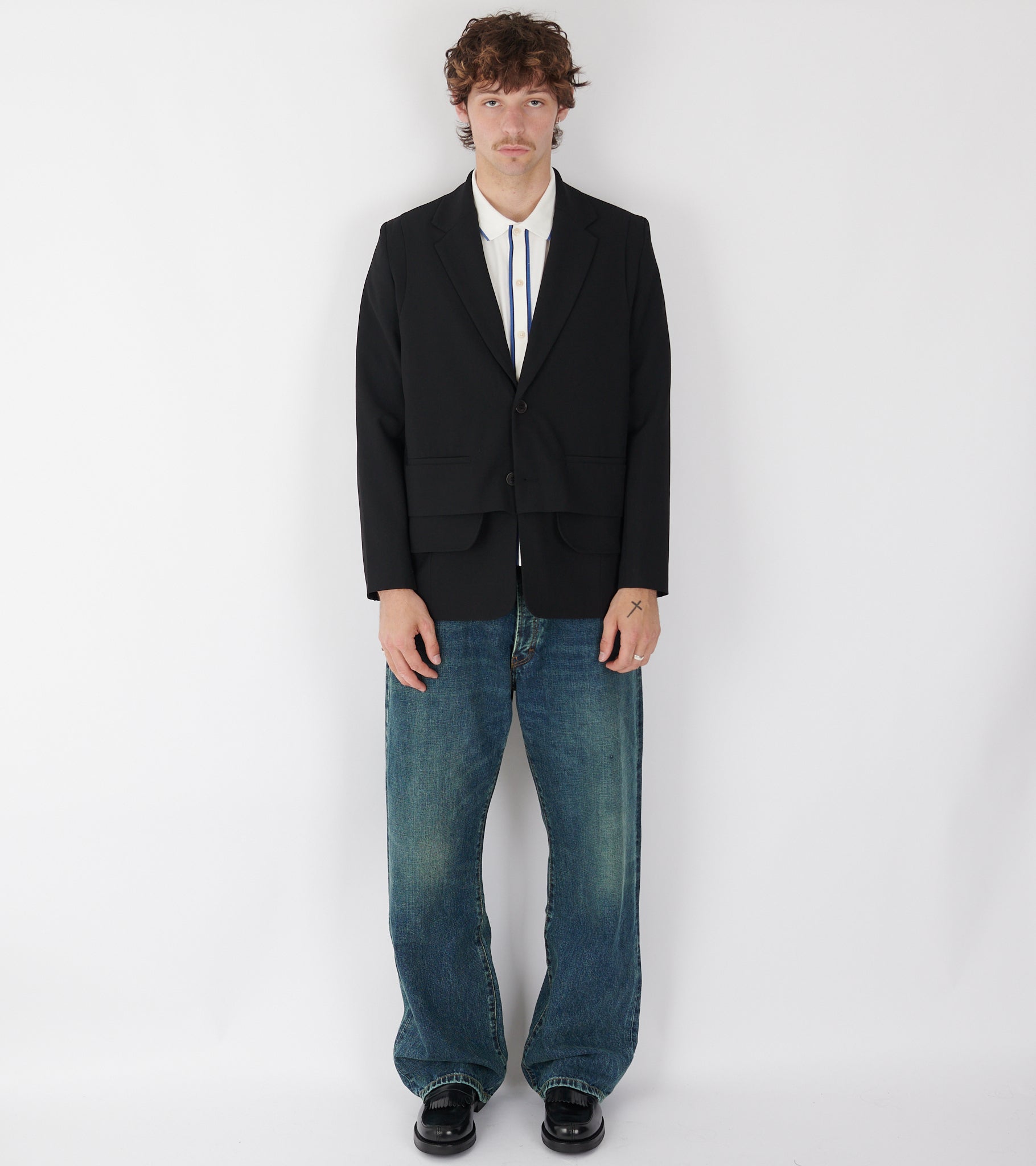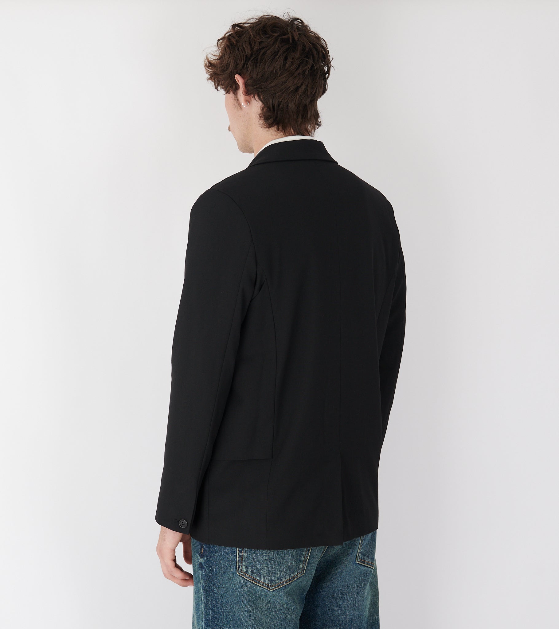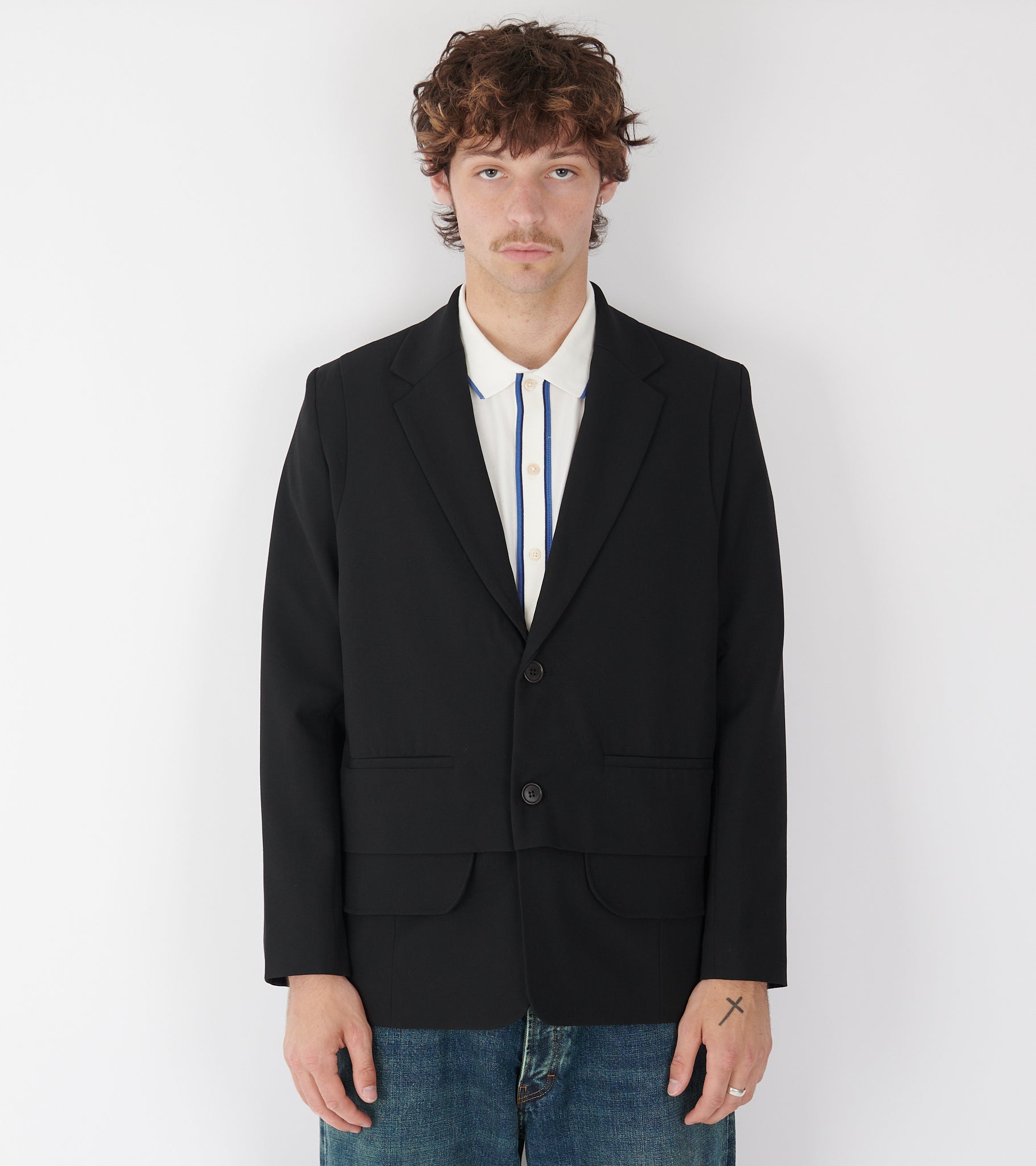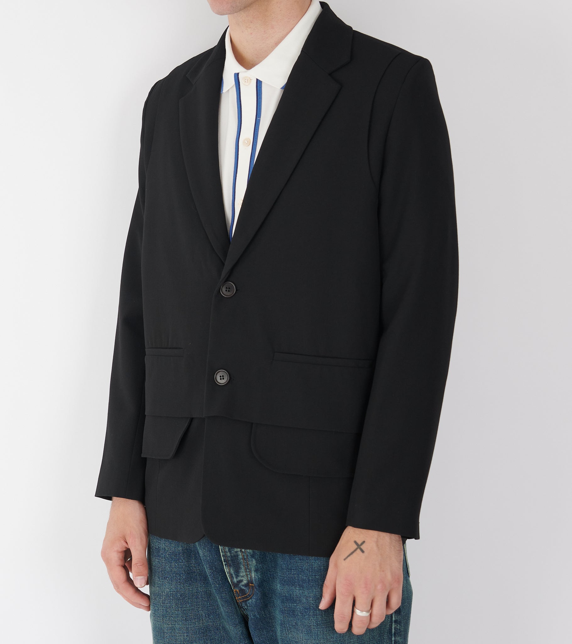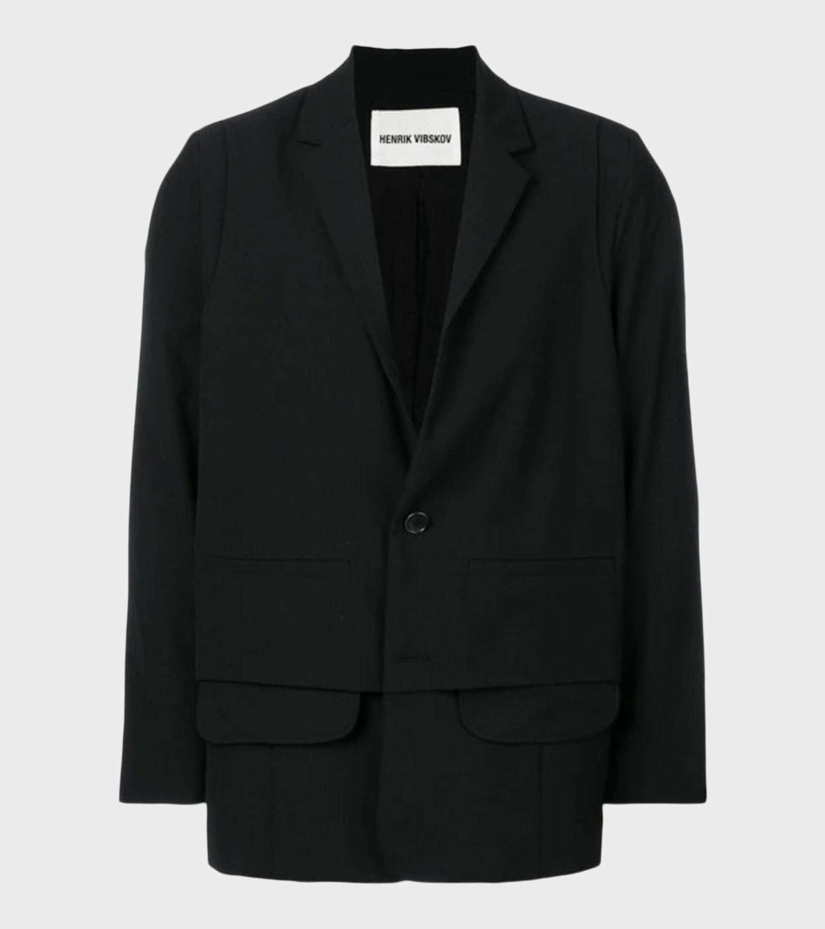 Sort blazer med et 'layered' vest-design fra Henrik Vibskov. Blazeren har en klassisk reverse-krave, let polstrede skuldre, to stiklommer samt en knaplukning med to knapper på fronten. Bagpå er en slids.