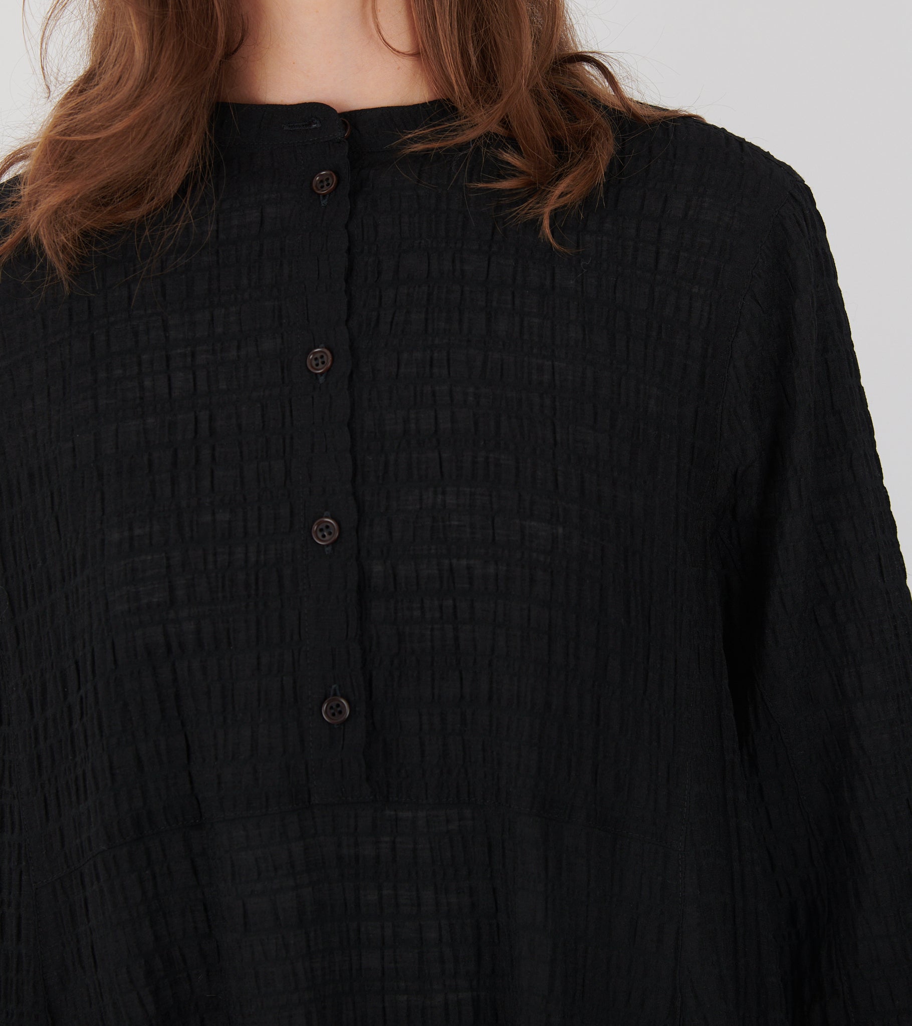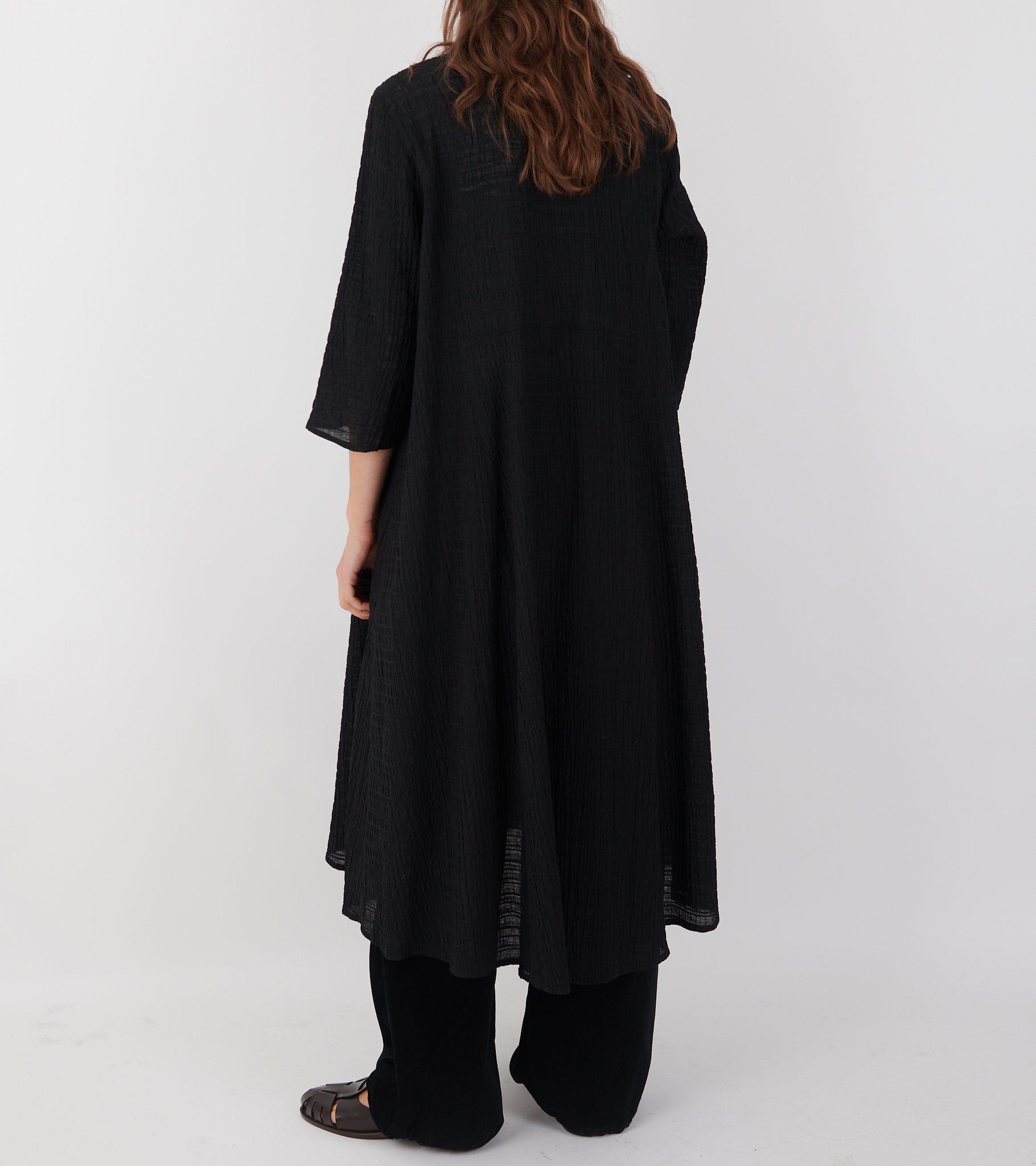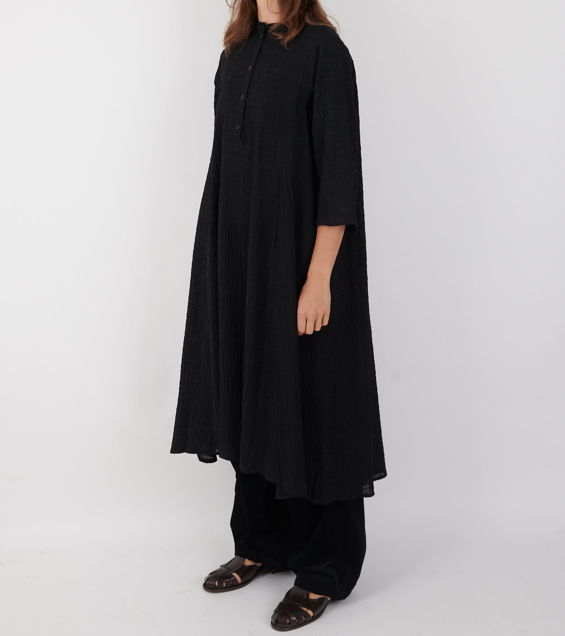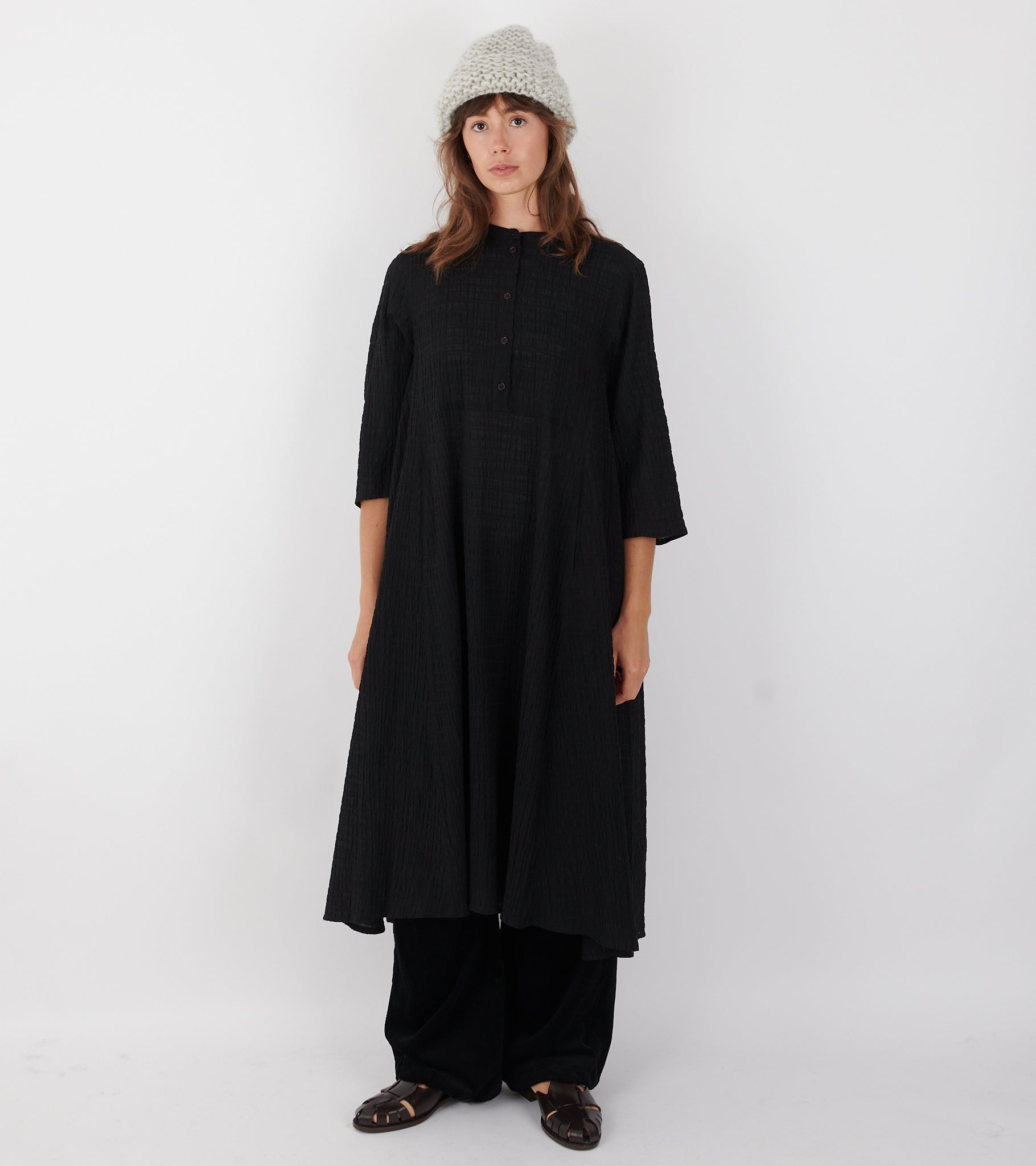 Sort kjole i en bølget struktur kvalitet fra Henrik Vinskov. Low Pulse Dress Black har en rund hals, en knaplukning og to diskrete lommer på fronten. Ærmerne er cropped.