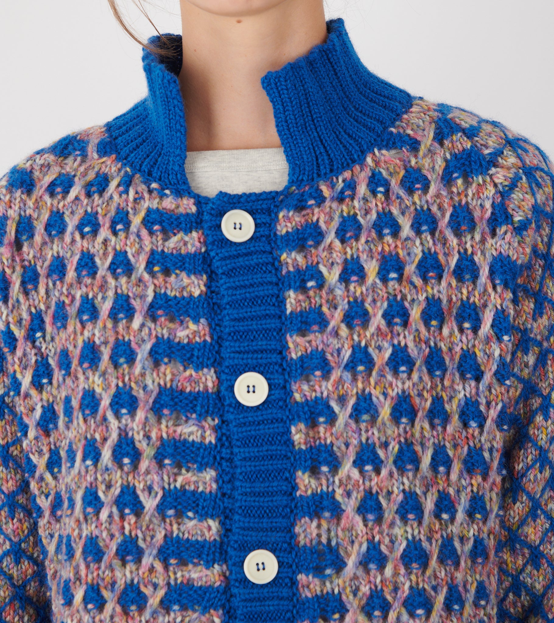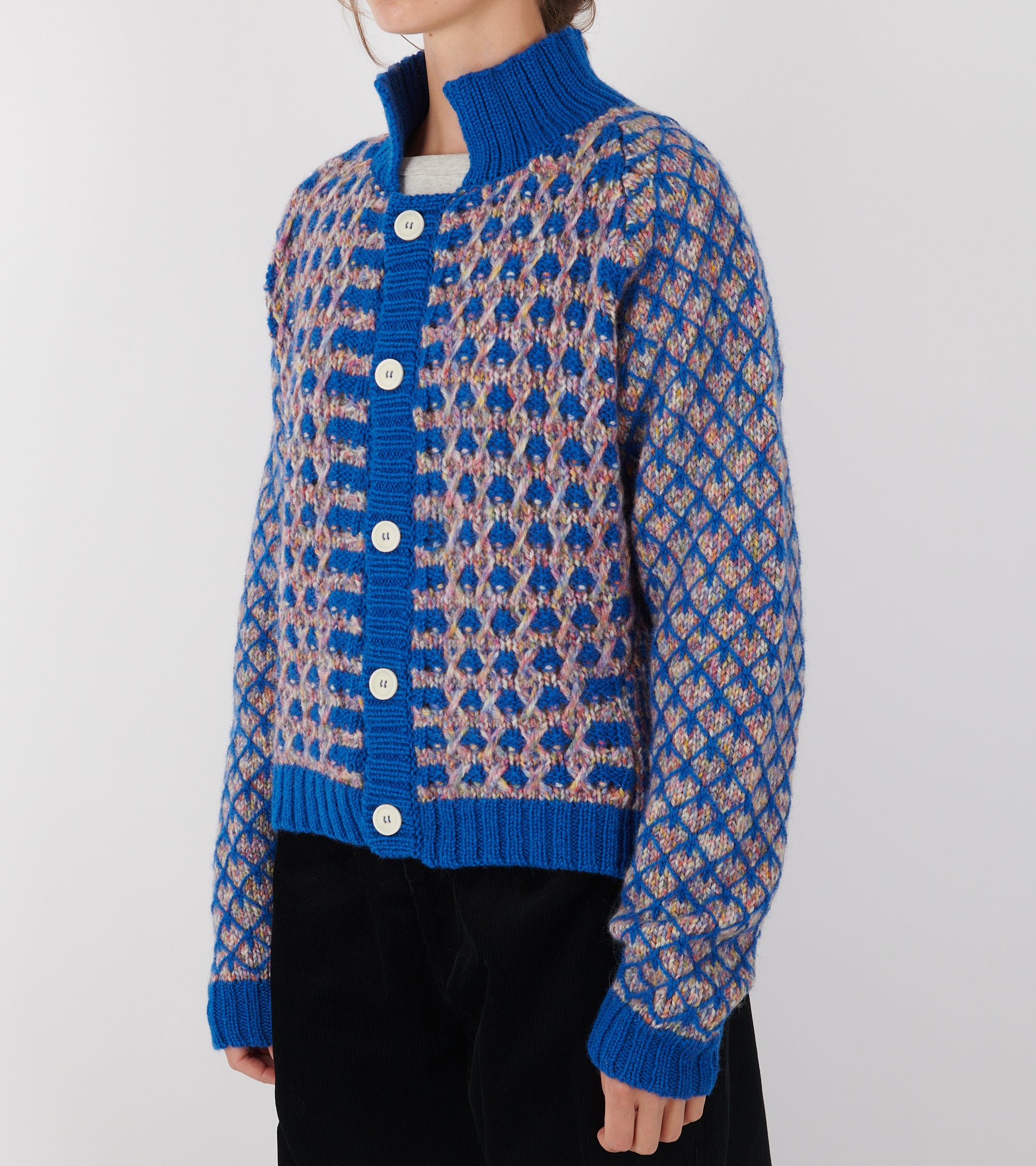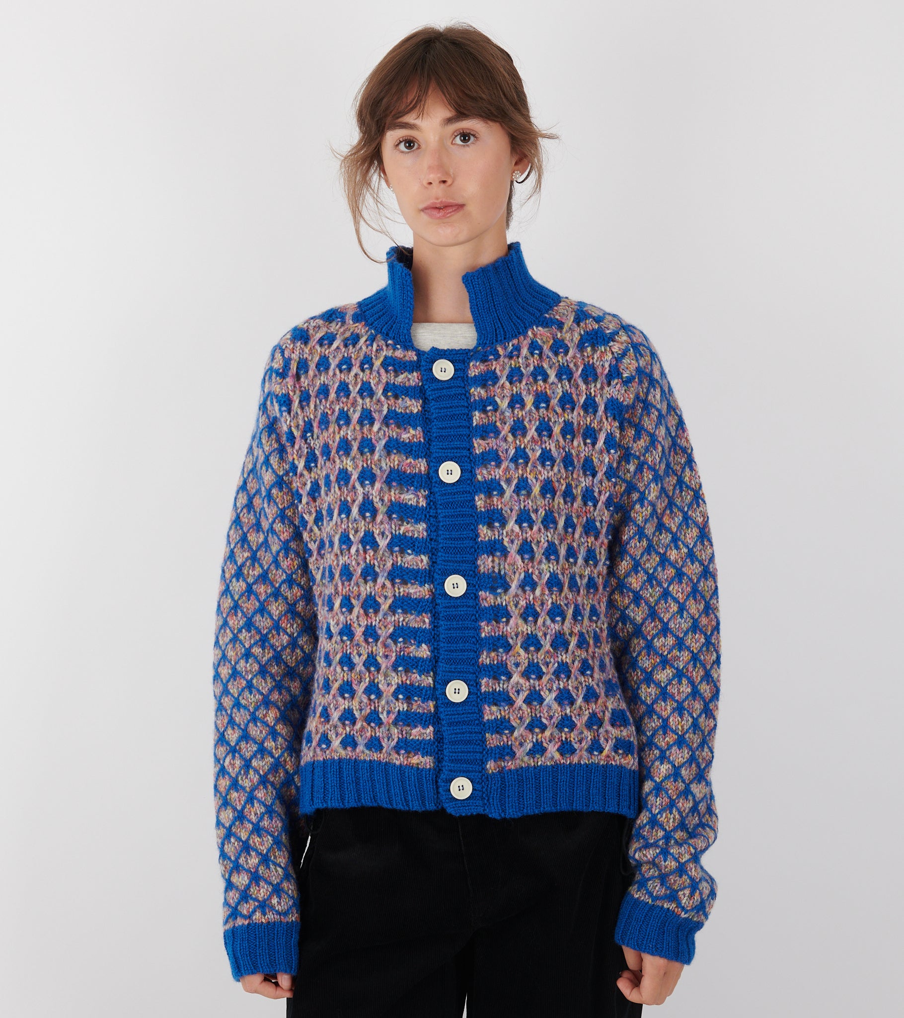 Blå og multifarvet cardigan fra Henrik Vibskov. Kimchi Cardigan er fremstillet i en chunky jomfru-uldkvalitet og har en krave, ribstrikkede kanter og en knaplukning på fronten.