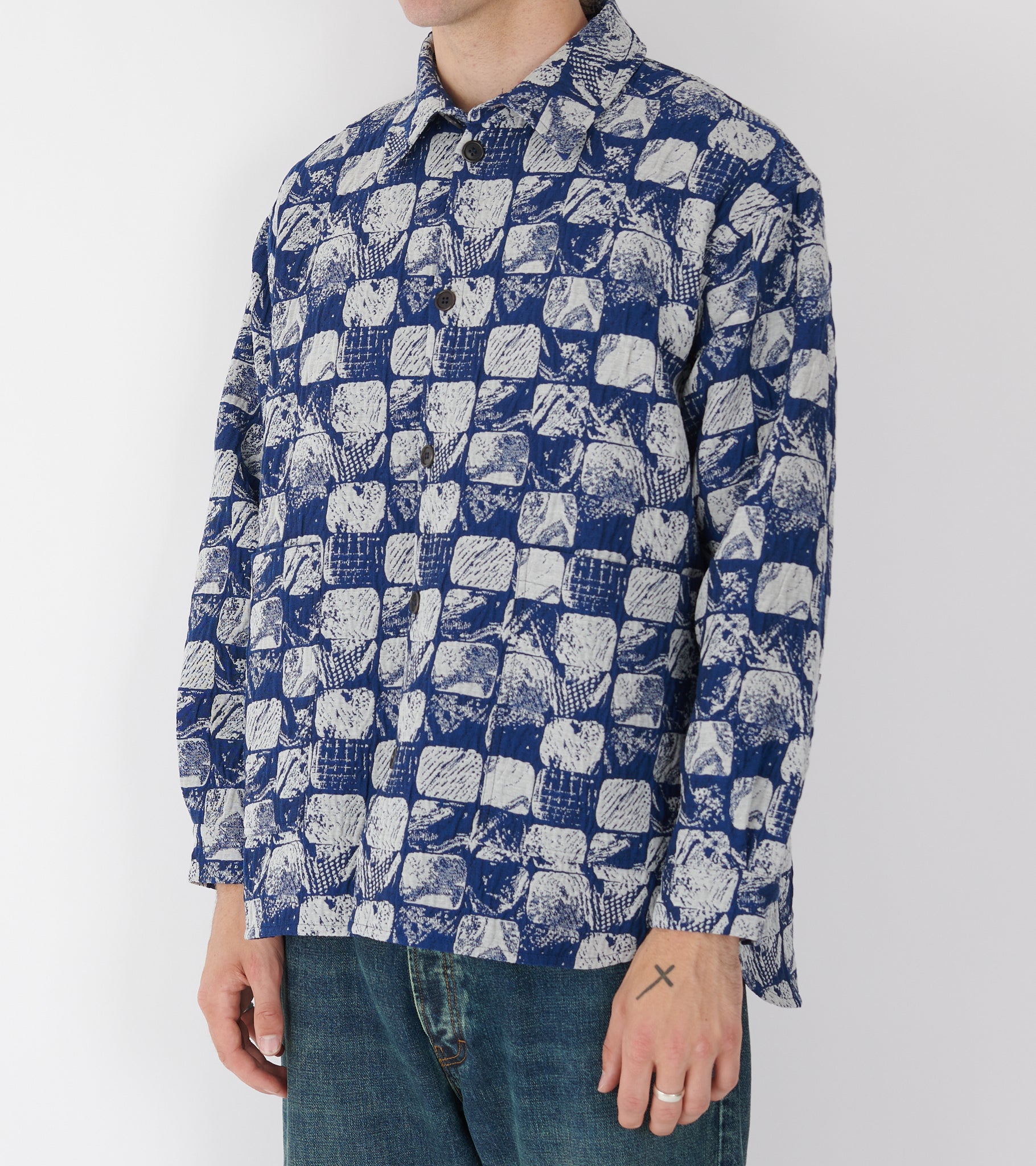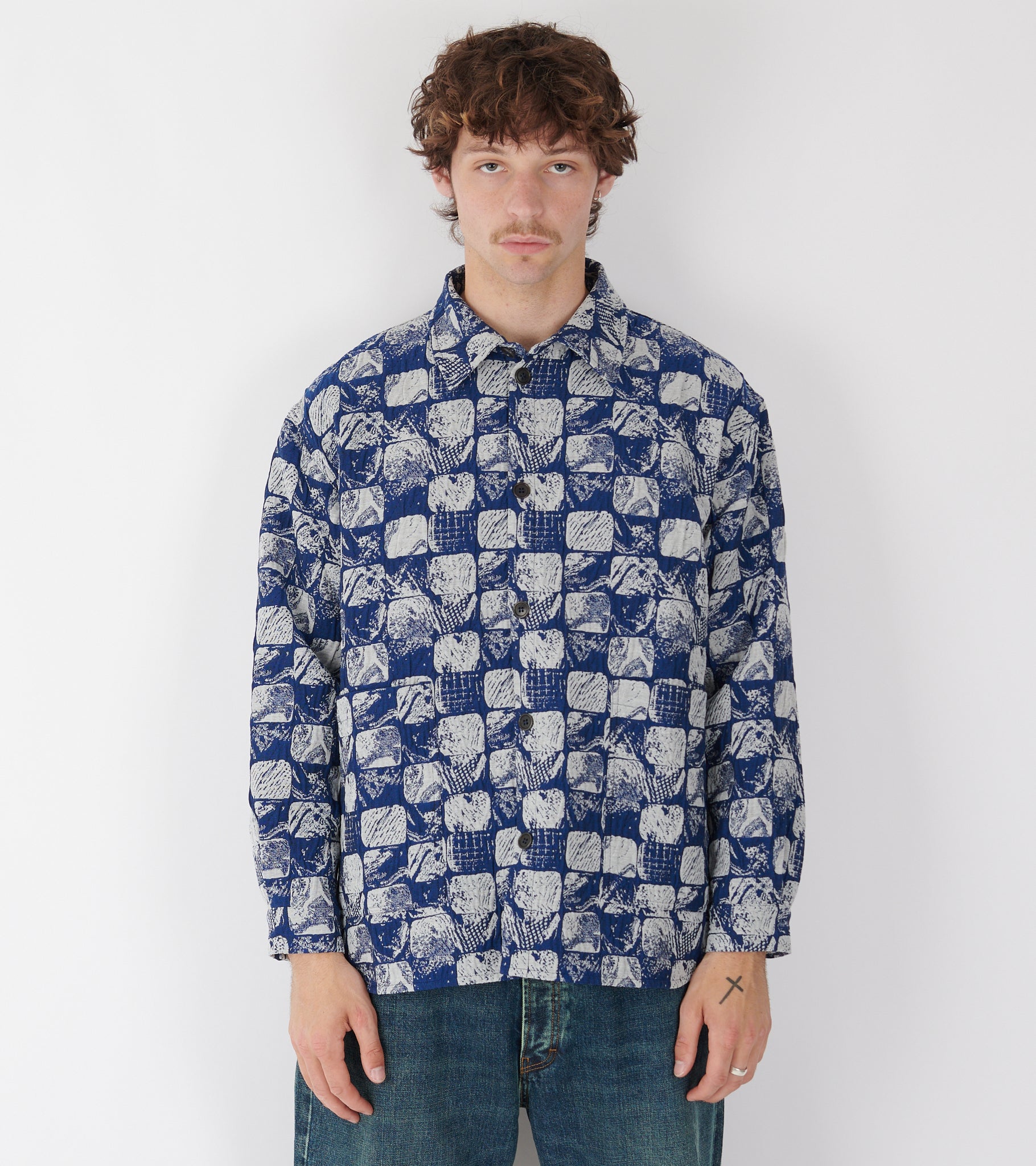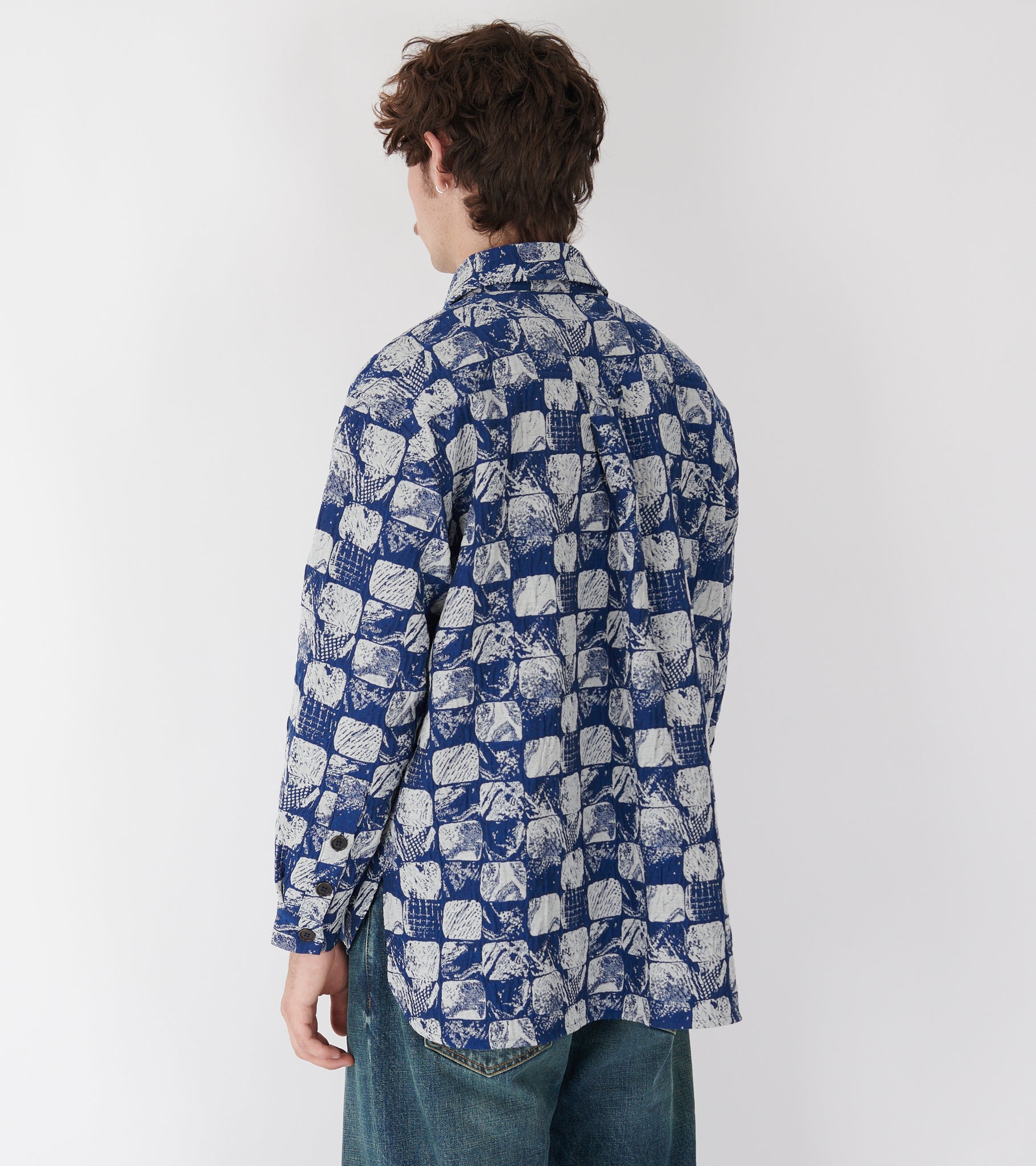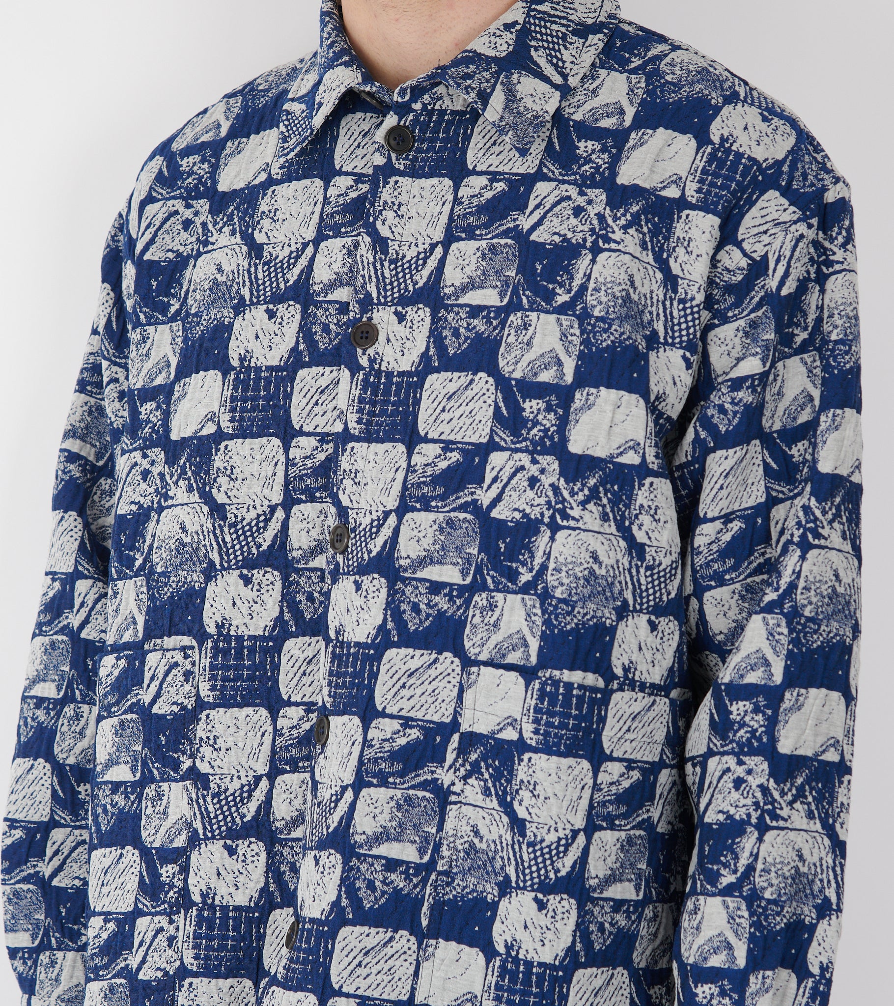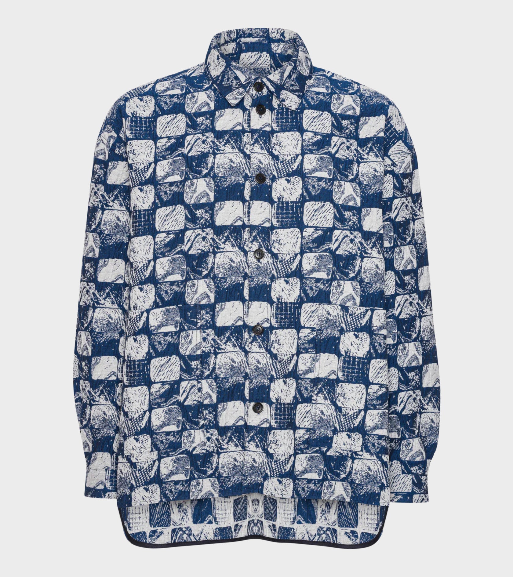 Skjorte i en kraftig økologisk bomuldsblanding med let struktur fra Henrik Vibskov. Skjorten er mørkeblå med et beige/gråligt mønster. Den har en klassisk krave, en knaplukning, læg på ryggen samt to lommer nederst på fronten.