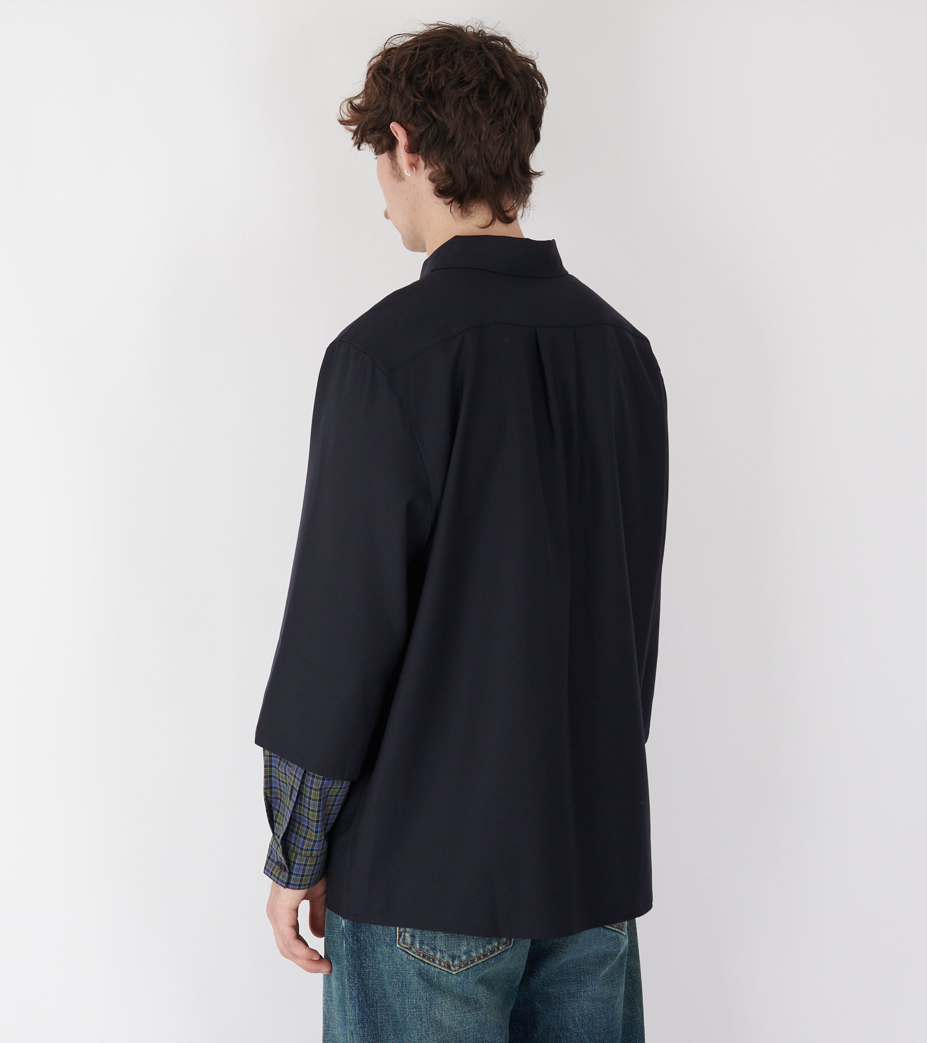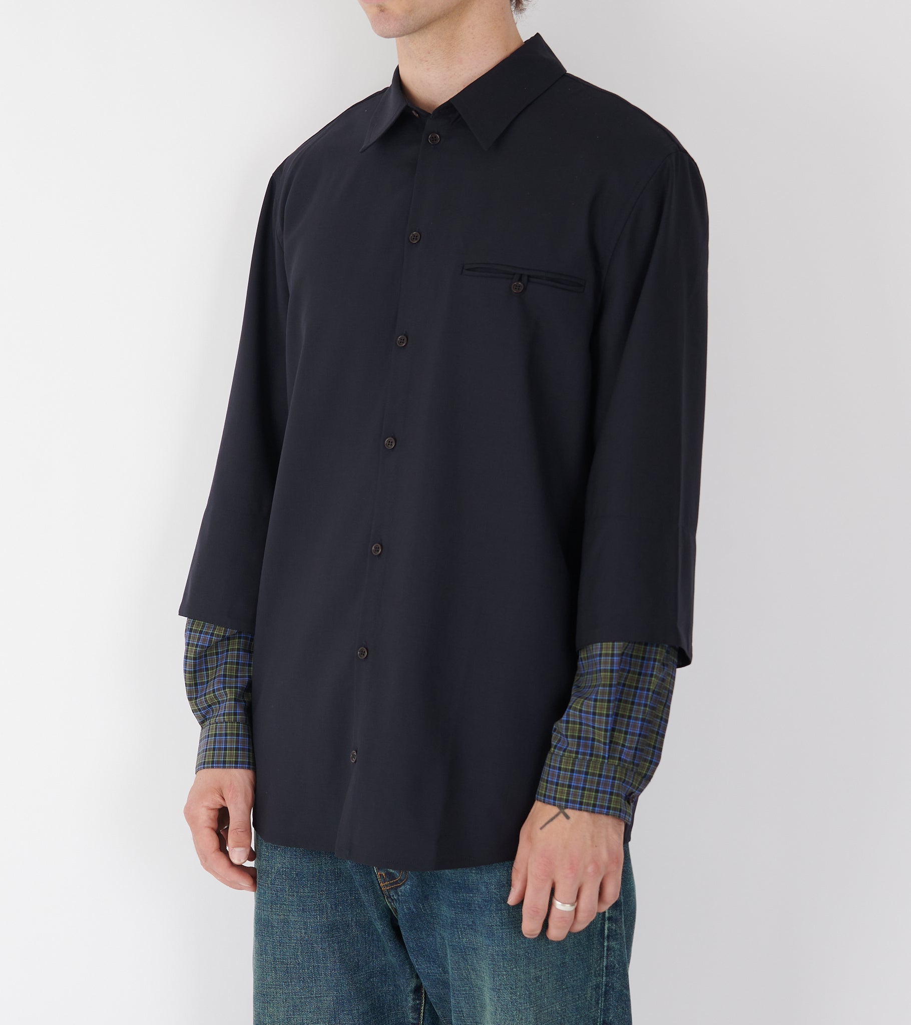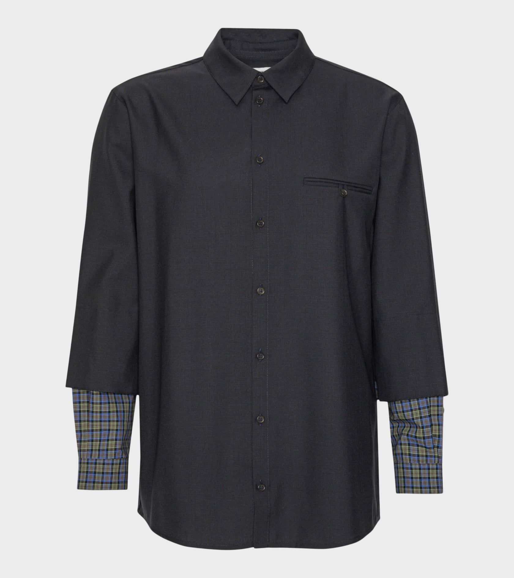 Mørk navy oversize skjorte i en let uldkvalitet fra Henrik Vibskov. Skjorten har en klassisk krave, en knaplukning, læg på ryggen og en brystlomme ved venstre bryst. Skjorten har et 'layered' design med ternede detaljer ved ærmerne.