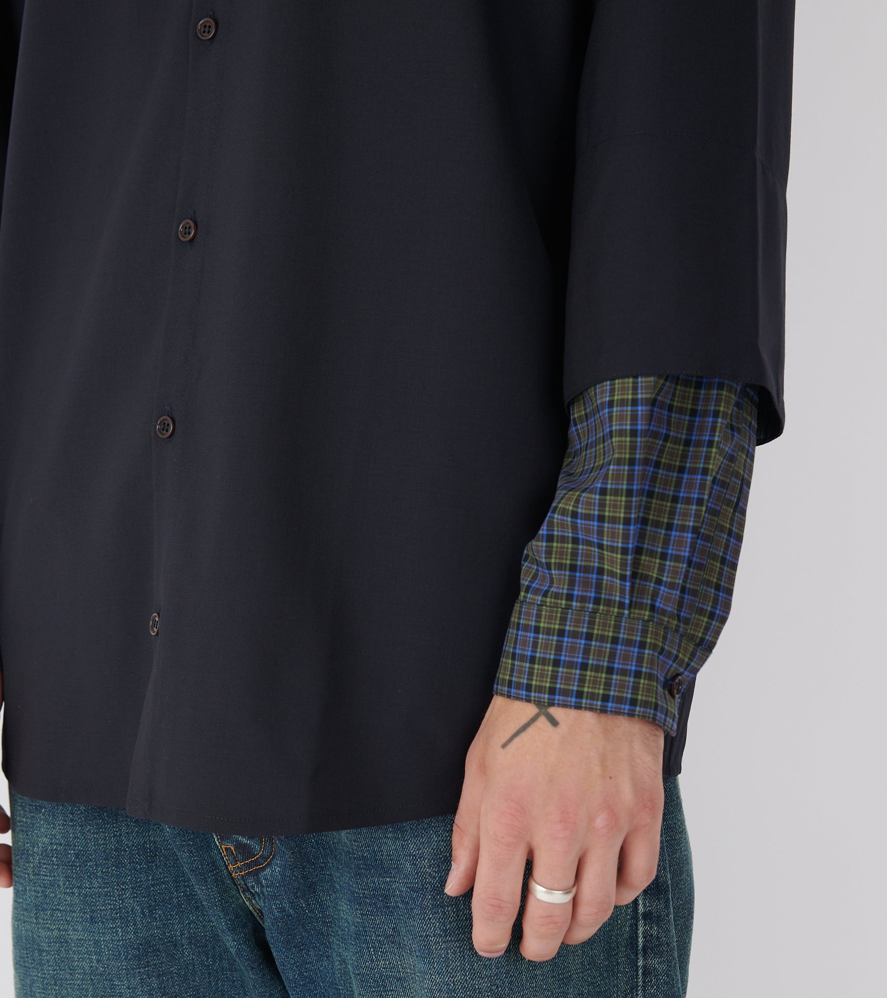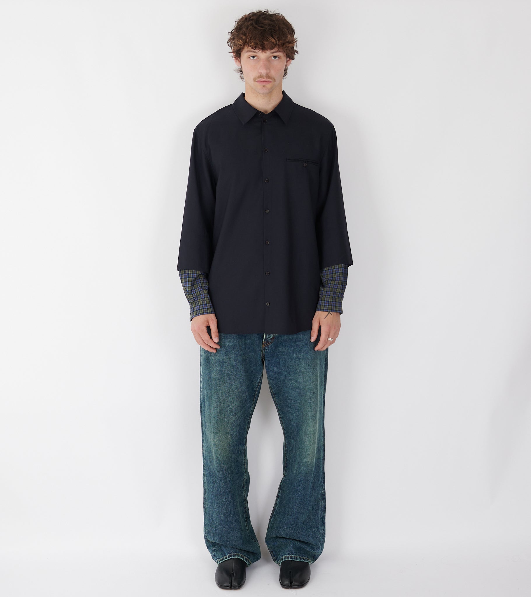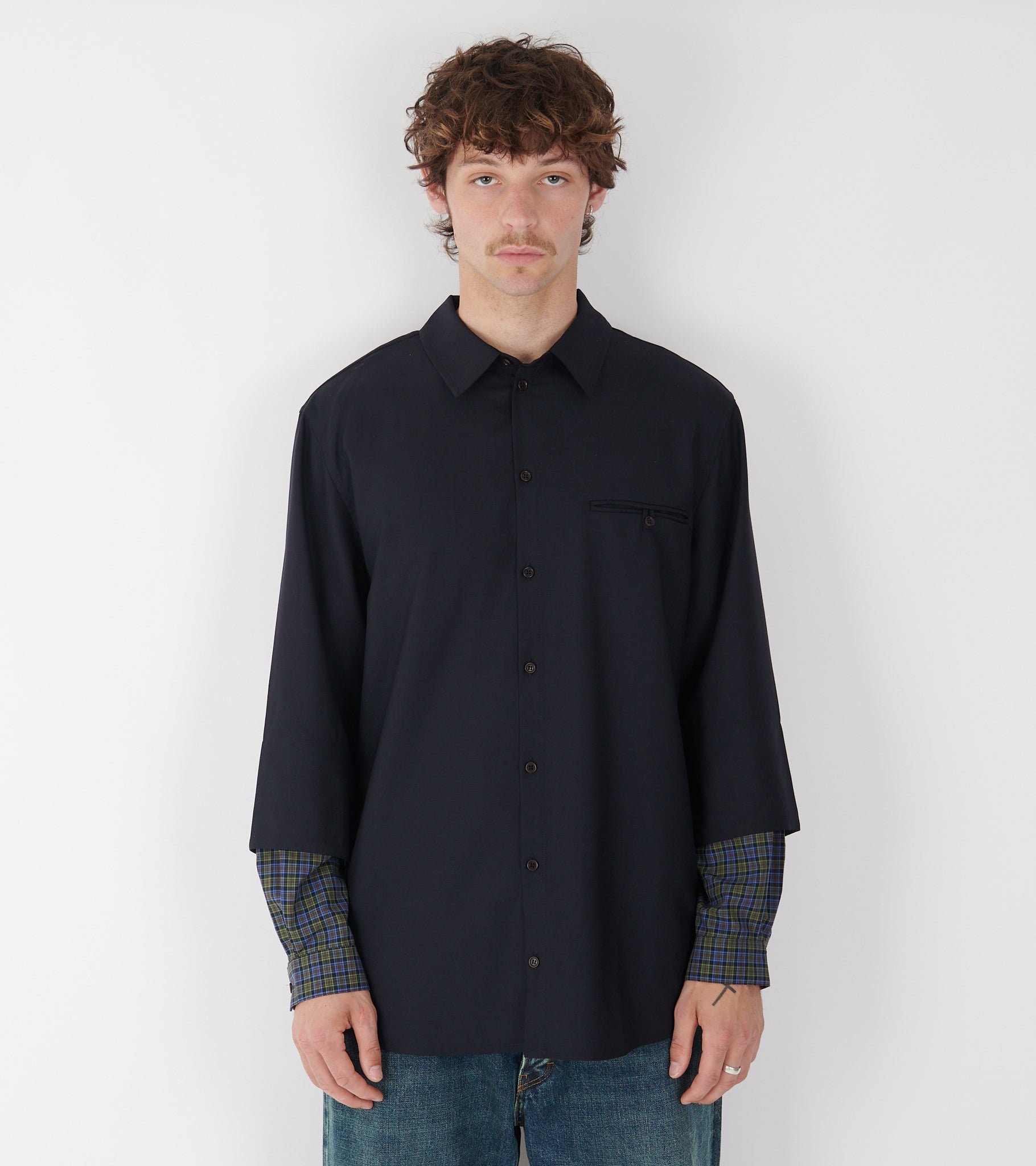 Mørk navy oversize skjorte i en let uldkvalitet fra Henrik Vibskov. Skjorten har en klassisk krave, en knaplukning, læg på ryggen og en brystlomme ved venstre bryst. Skjorten har et 'layered' design med ternede detaljer ved ærmerne.